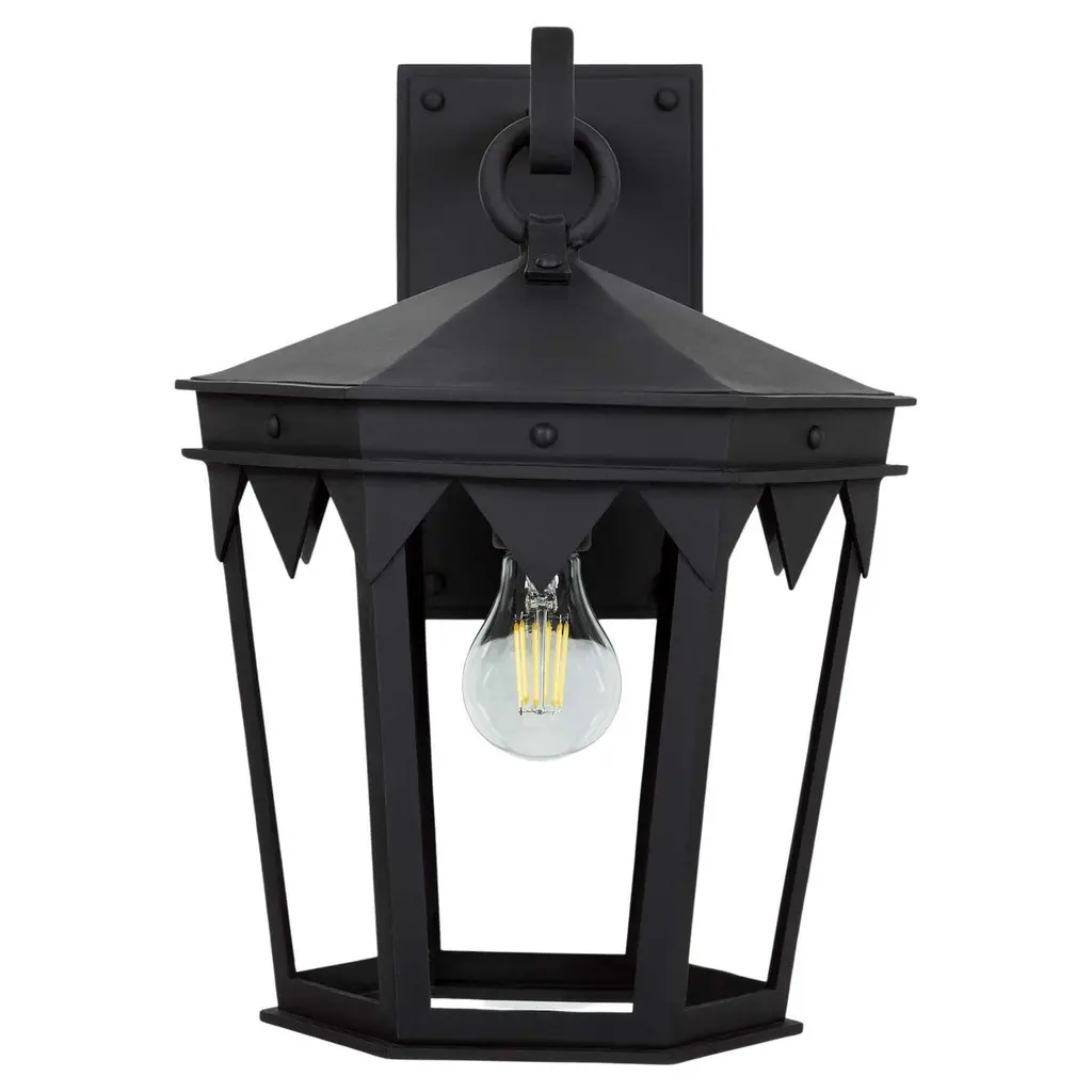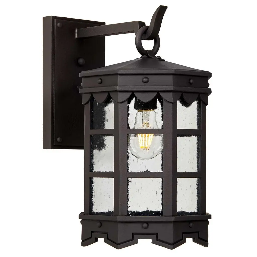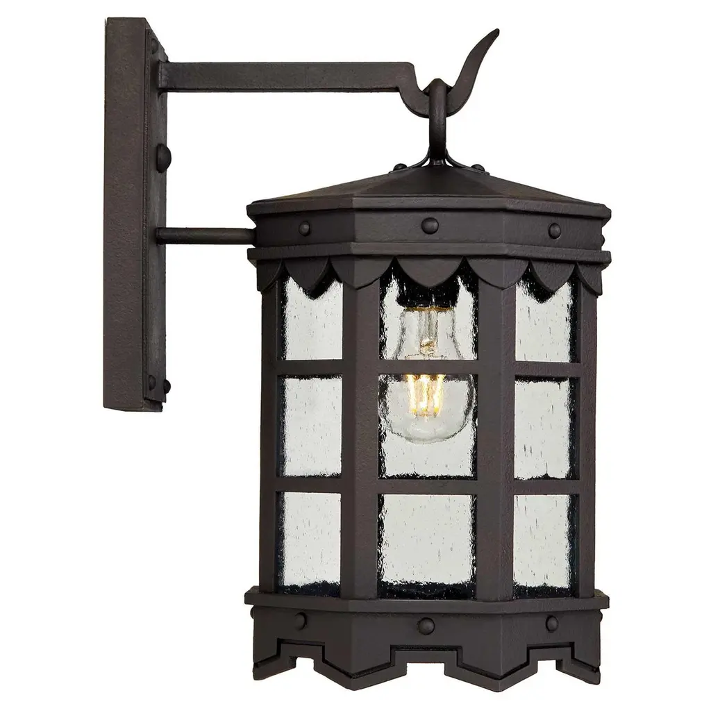 Our De La Guerra lantern finished in our premium SBLC Old World Finish has Mediterranean style precedence with historic profiles and contemporary geometric lines. A striking fixture during the day but even more so at night when the patterned hem casts intricate shadows.Other finishes are available. Contact us for more information.Lantern shown in SBLC Old World Finish with SBLC Seeded Glass. Backplate dimensions (inches): 5 W x 9 H.Hand-forged in heavy gauge wrought iron. All lanterns go through a metalizing process, a protective zinc layer added to ensure protection and durability against corrosion and harsh weather conditions.All lights are handmade and made to order. Dimensions may vary slightly.All lights ship with 5w LED Edison dimmable filament bulb.This lantern will ship within 8-10 weeks. Larger orders may have longer lead times.As with any handcrafted product, slight discrepancies are inherent in the art of forged iron, and even considered desirable as they indicate our old-world craftsmanship. Natural variations in tone or texture my occur as our finishes are hand painted.