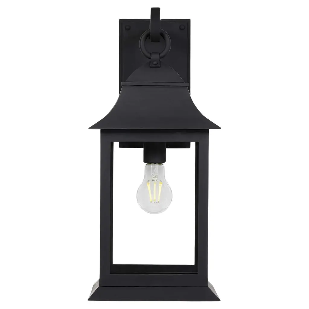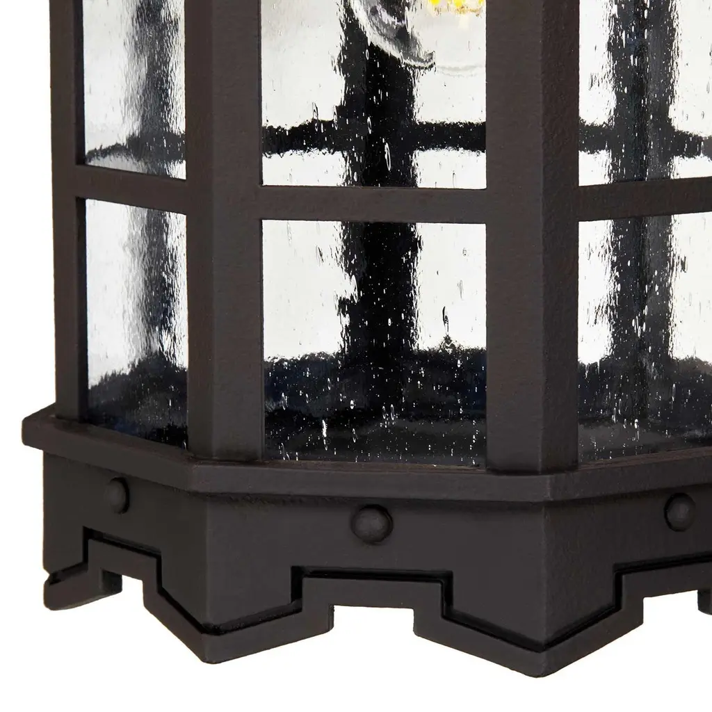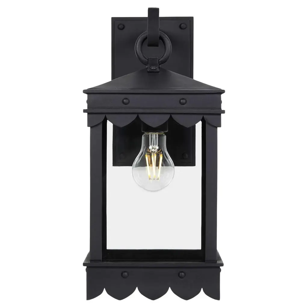 Our De La Guerra lantern finished in our premium SBLC Old World Finish has Mediterranean style precedence with historic profiles and contemporary geometric lines. A striking fixture during the day but even more so at night when the patterned hem casts intricate shadows.Other finishes are available. Contact us for more information.Lantern shown in SBLC Old World Finish with SBLC Seeded Glass. Backplate dimensions (inches): 5 W x 9 H.Hand-forged in heavy gauge wrought iron. All lanterns go through a metalizing process, a protective zinc layer added to ensure protection and durability against corrosion and harsh weather conditions.All lights are handmade and made to order. Dimensions may vary slightly.All lights ship with 5w LED Edison dimmable filament bulb.This lantern will ship within 8-10 weeks. Larger orders may have longer lead times.As with any handcrafted product, slight discrepancies are inherent in the art of forged iron, and even considered desirable as they indicate our old-world craftsmanship. Natural variations in tone or texture my occur as our finishes are hand painted.