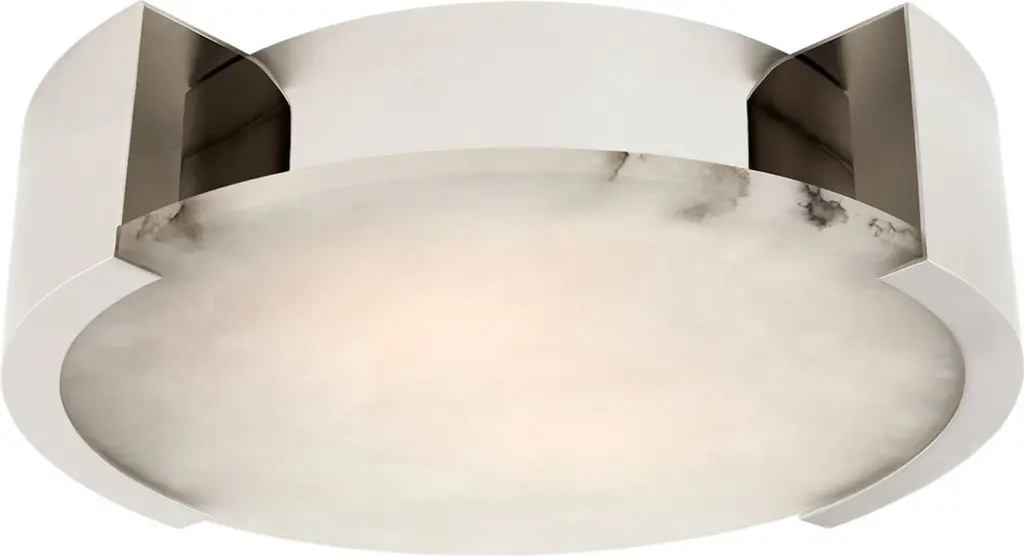 The Melange Mini Monopoint Flush Mount series by Kelly Wearstler artfully combines natural alabaster with metal in rounded forms and unique configurations, creating a harmonious blend of organic and luxurious elements for a modern chic interior. The carved alabaster shades emit a soft, inviting glow on walls and surfaces, while the streamlined shapes elegantly complement both angular and minimalist surroundings. Each alabaster piece features unique variations in veining and tone, adding a custom character that is both collectible and appealing. The detailing, available in various finishes, provides a striking contrast and shine. Whether you opt for flush mounts, pendants, sconces, or table lamps, the Melange lighting collection offers a multi-layered aesthetic that enhances living spaces, bedrooms, hallways, and dining areas with its sophisticated allure.