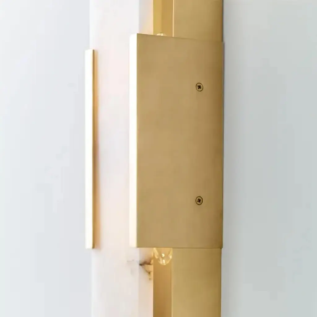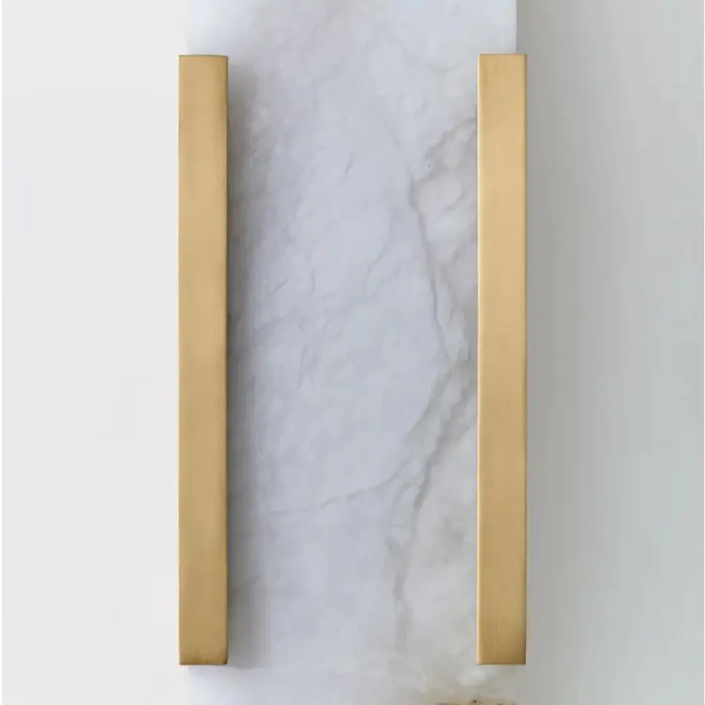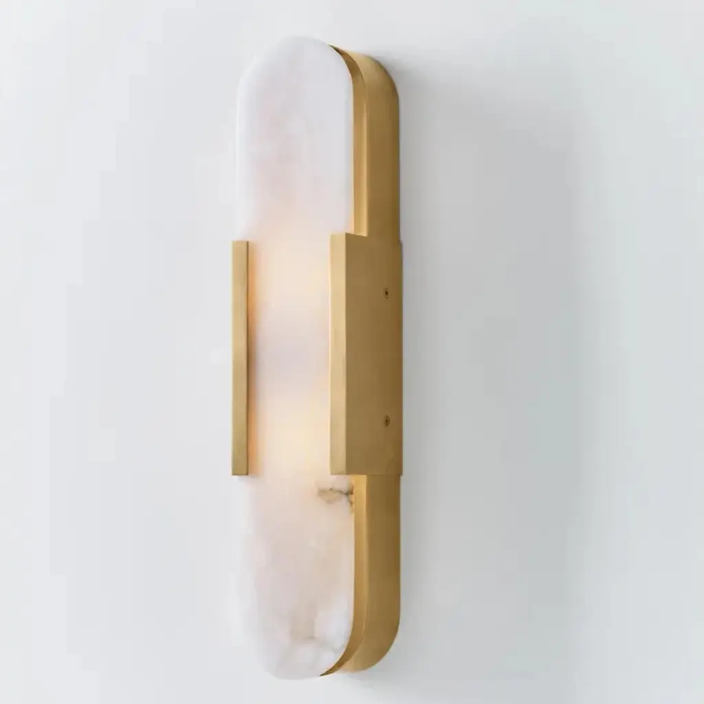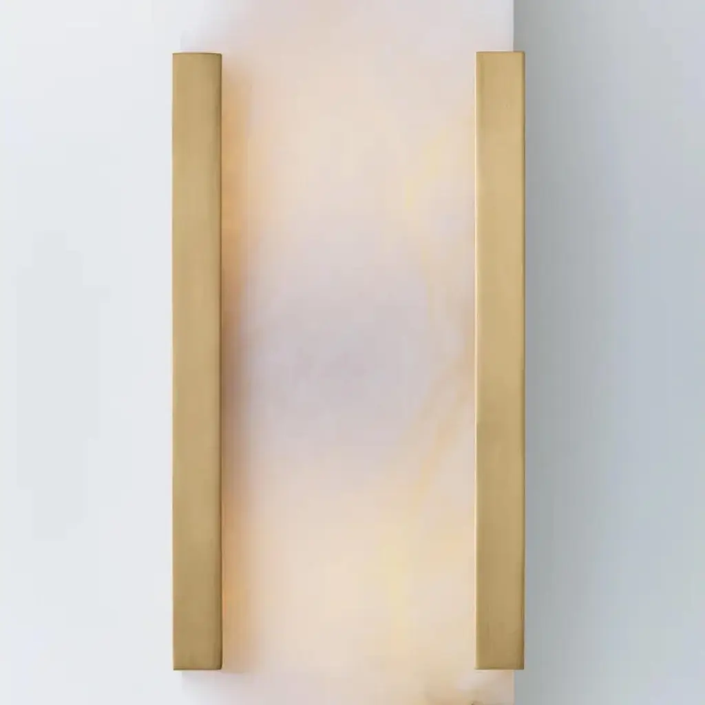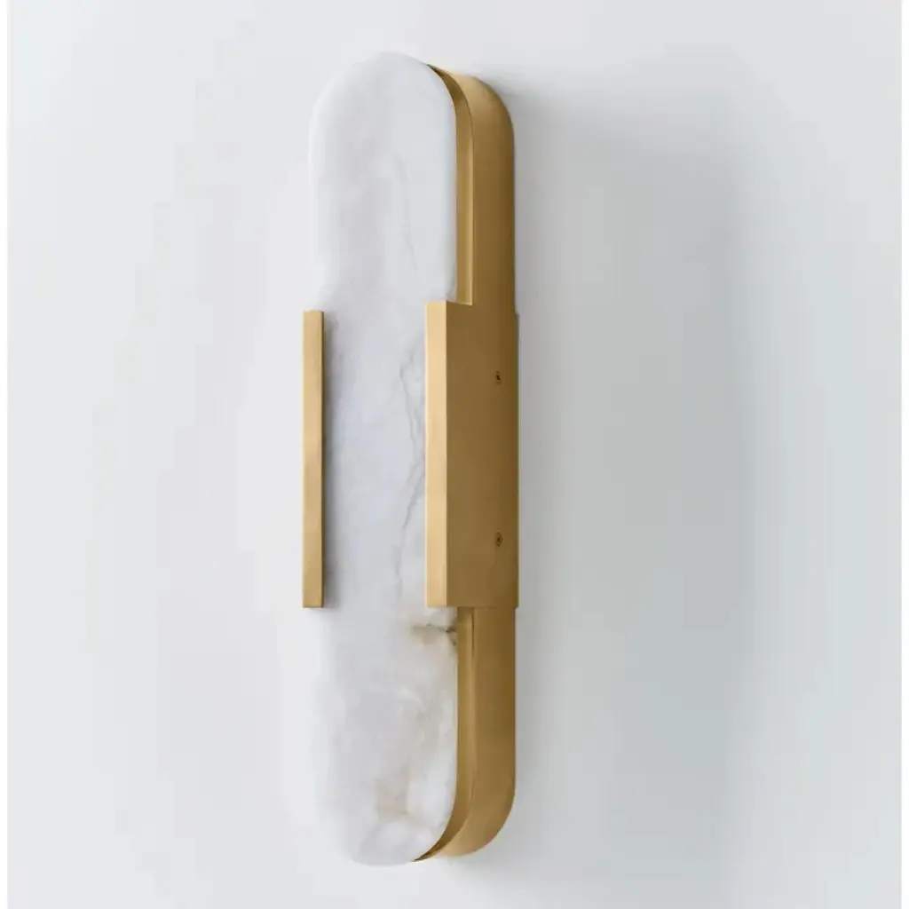Effortlessly pairing natural alabaster and sleek metal detailing in a streamlined geometric form, the Melange Elongated Sconce exudes a modern refinement while emphasizing the beauty of natural stone. This sconce features hand-carved natural alabaster with either Antique Brass, Bronze or Polished Nickel detailing and is rated for damp locations. LED Note: Due to the natural characteristics of our alabaster, each fixture is unique. Please use LED bulbs only to prevent discoloration and to ensure your alabaster remains beautiful. International Orders: Lead times and availability vary for non-US 120V fixtures. Please contact us for all international inquiries.