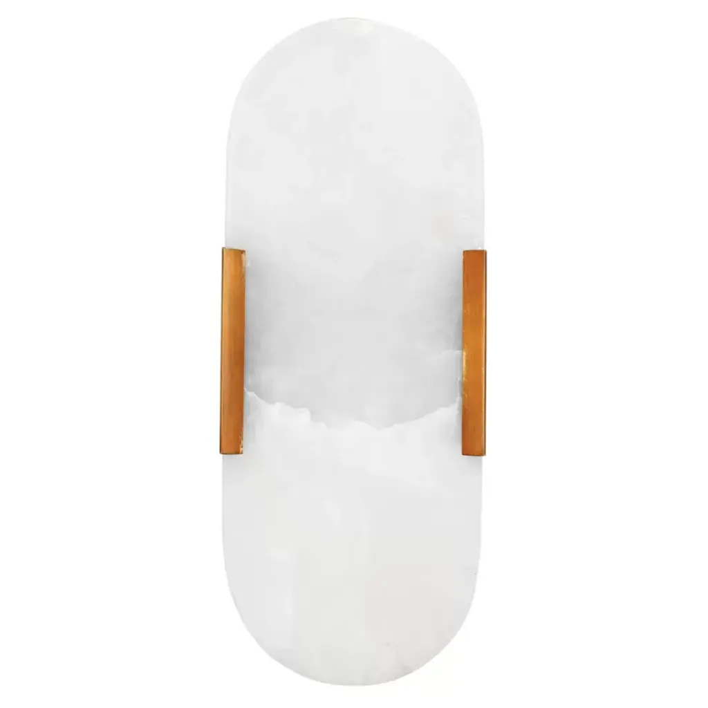 The Melange Pill Form Wall Sconce by Visual Comfort Signature, formerly known as Visual Comfort, brings a refined ambiance to your living space with its smooth, Alabaster form and ringed metal accent. The pill-shaped body acts as shade for a pair of light sources, creating a soothing glow that enriches the surrounding space.