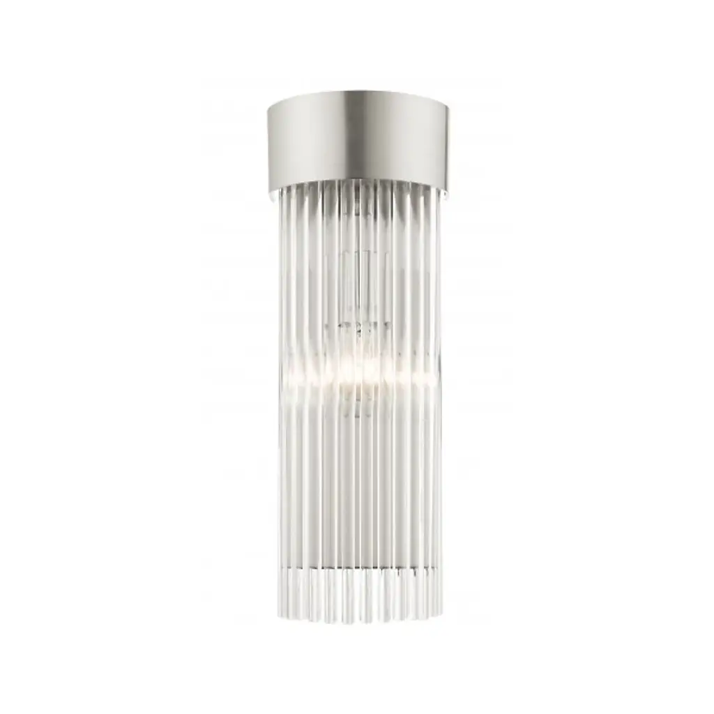 The Melanie Wall Sconce from Alder & Ore presents an inviting mix of modern smoothness and transitional flair. Secured with a low-profile backplate, the sconce seats the lamp holder socket facing down. A semicircular steel cap in front anchors a series of slender crystal rods vertically and along its interior. These rods act as a glare-free diffuser for the lamping. The glittering crystal transforms the bulb’s bright light into a broad-reaching ambient glow.