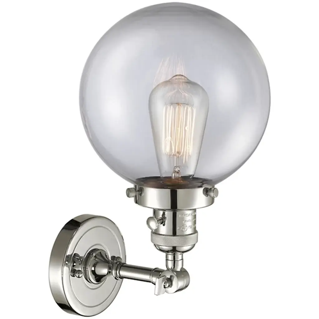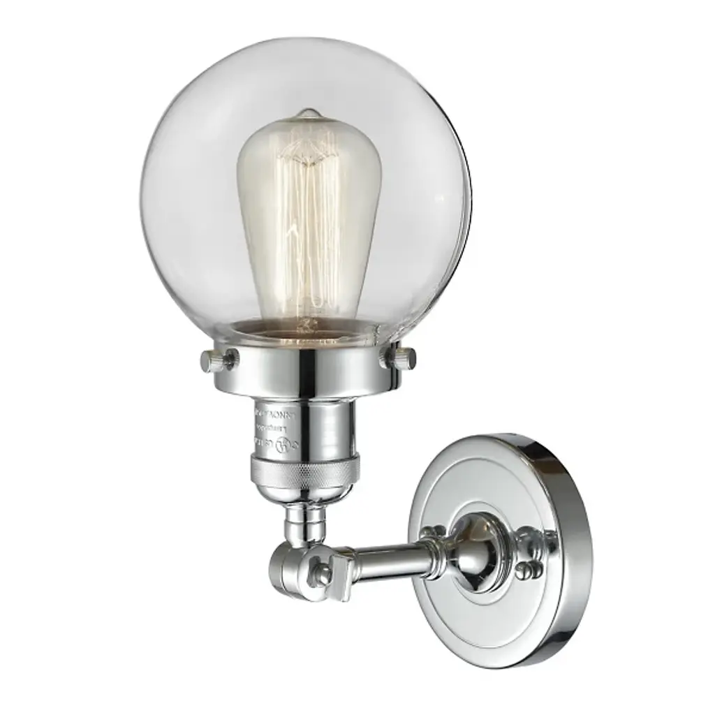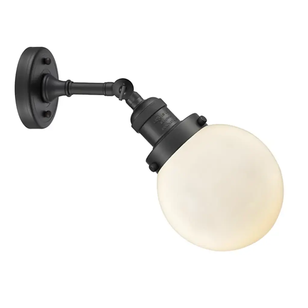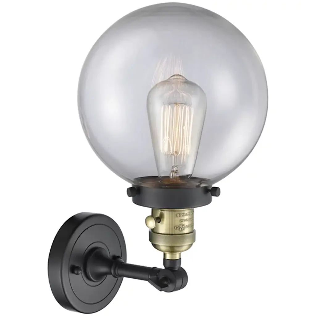 Delighting with shape, light, and convenience. Find the right angle that suits the look and feel of your room with the Melena Adjustable Wall Sconce from Alder & Ore. The sconce’s compact design and level of adjustability is one near any room can appreciate. It features a protruding arm with an easy to tweak joint. Whether facing vertically or at an angle, the eyes are met with the industrial knurled and lettering accents on the lamp holder. A glass globe caps off the piece like a bubble. The globe mellows the light and the sconce’s overall sharp silhouette with its continuous curves. A flip of the switch generates a warm, attractive glow.