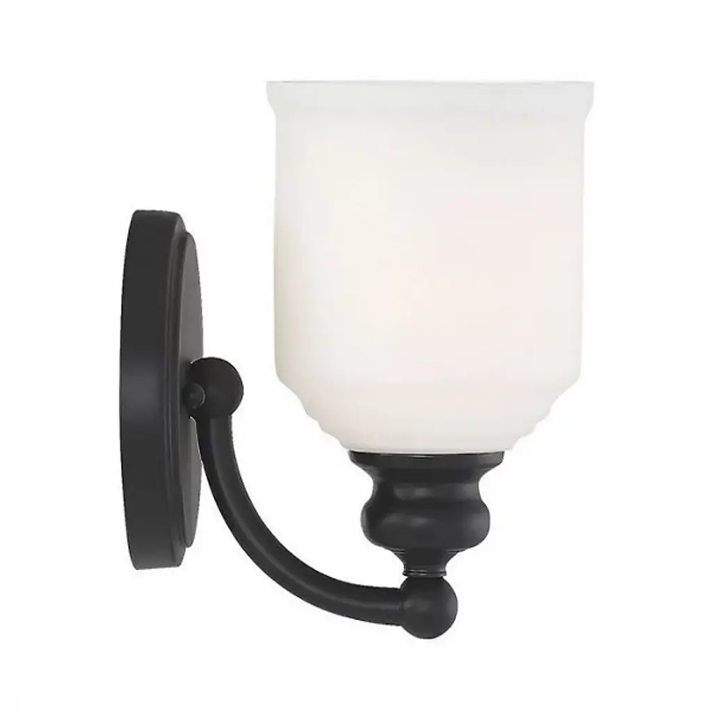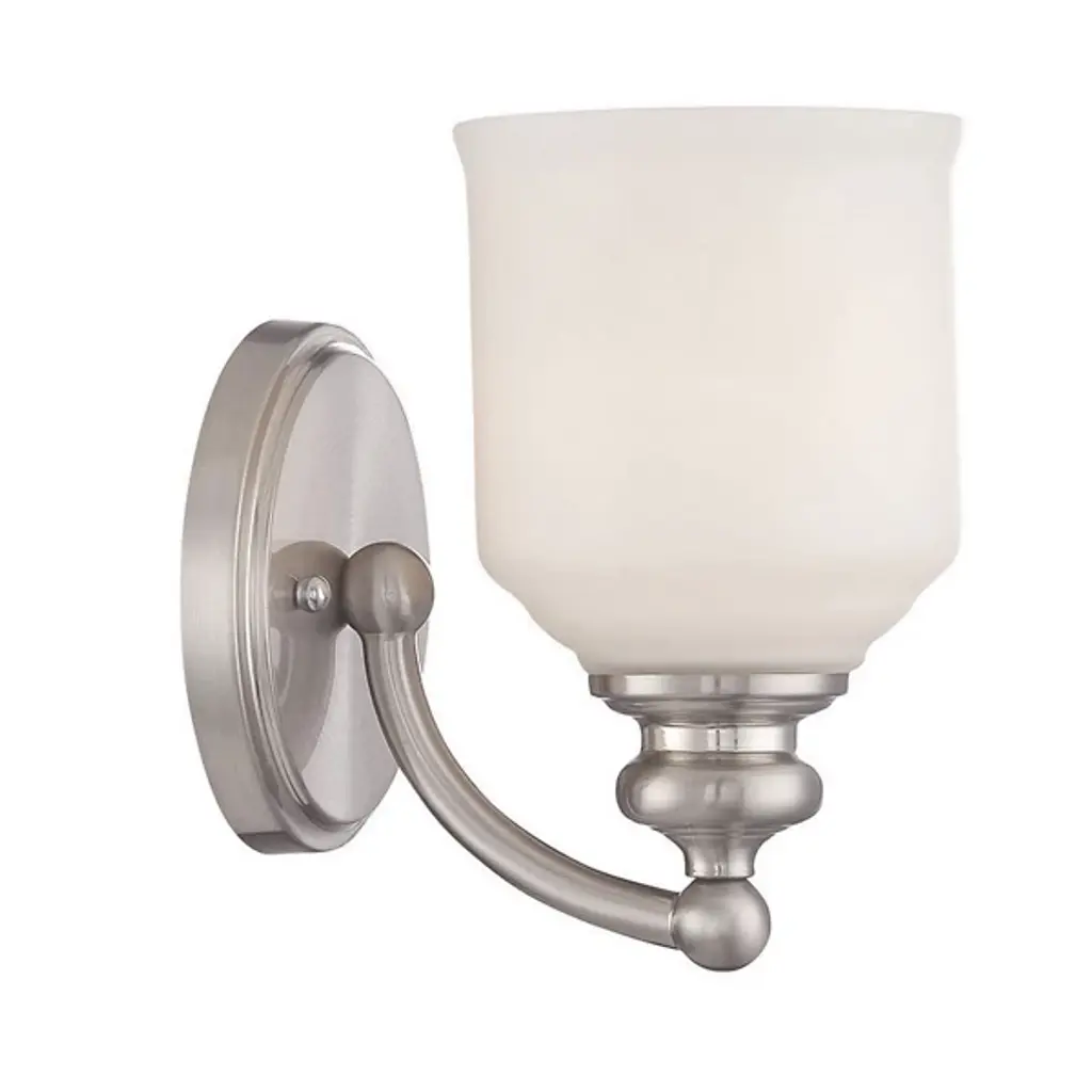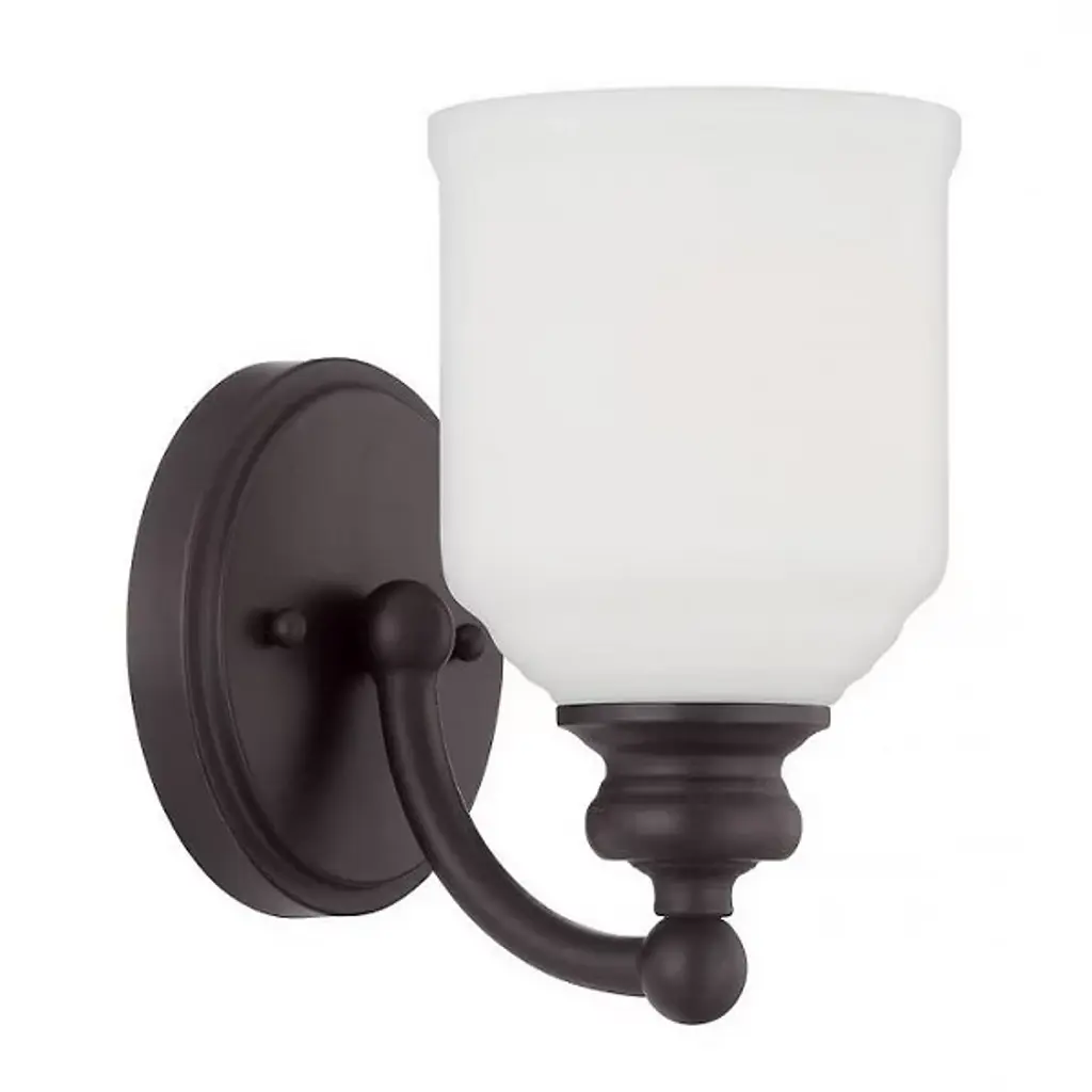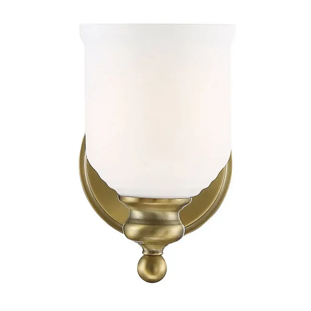 Classic American beauty updated for today's interior design expert. The Melrose Wall Sconce by Savoy House will certainly earn you complements on your exquisite taste in home accents. Its contemporary lines contrast beautifully with the warm brass finish and soft white glass shade, resulting in the perfect balance of old and new-world elegance. As a tranquil glow emerges from this sconce, a welcoming atmosphere takes shape that's fitting for an entryway, hallway or master bedroom.