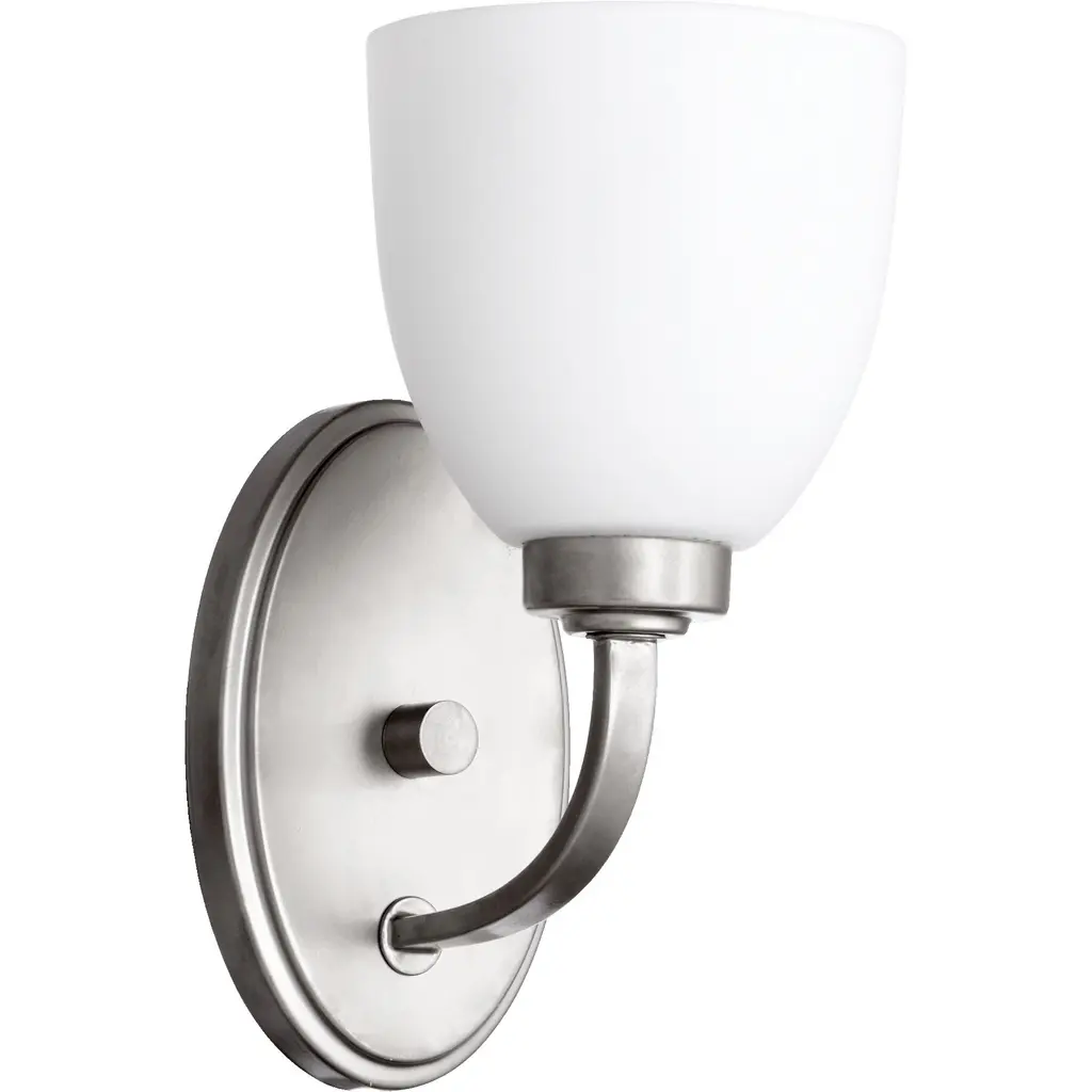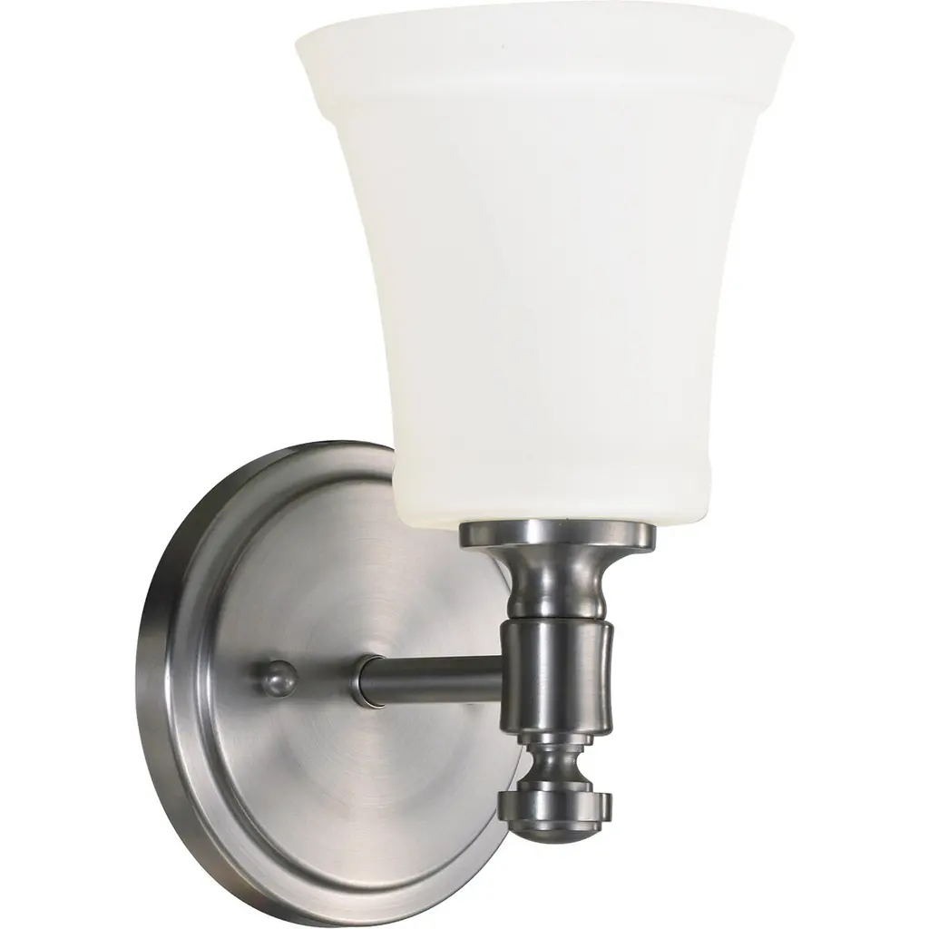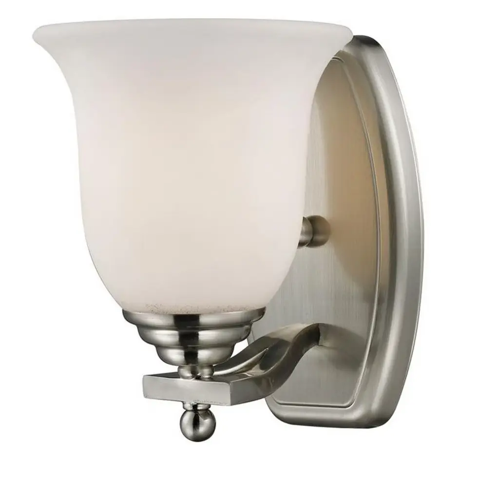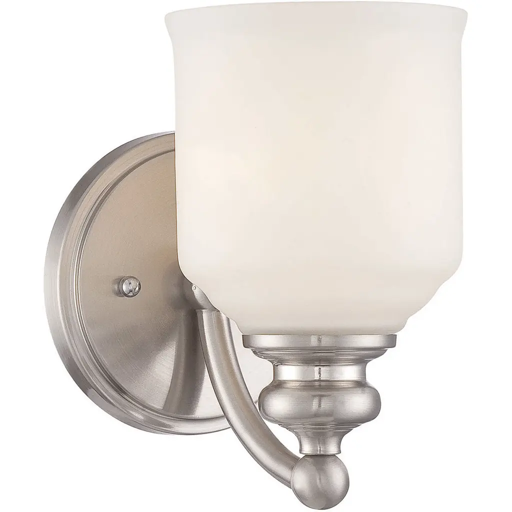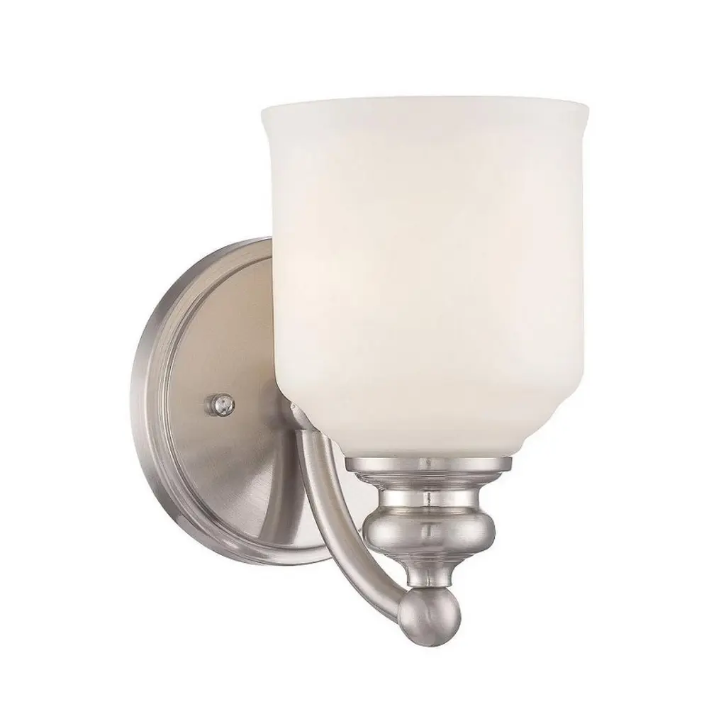 Classic American beauty updated for today's interior design expert. The Melrose Wall Sconce by Savoy House will certainly earn you complements on your exquisite taste in home accents. Its contemporary lines contrast beautifully with the warm brass finish and soft white glass shade, resulting in the perfect balance of old and new-world elegance. As a tranquil glow emerges from this sconce, a welcoming atmosphere takes shape that's fitting for an entryway, hallway or master bedroom.