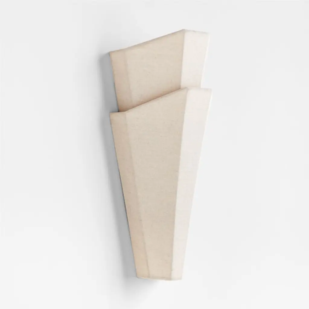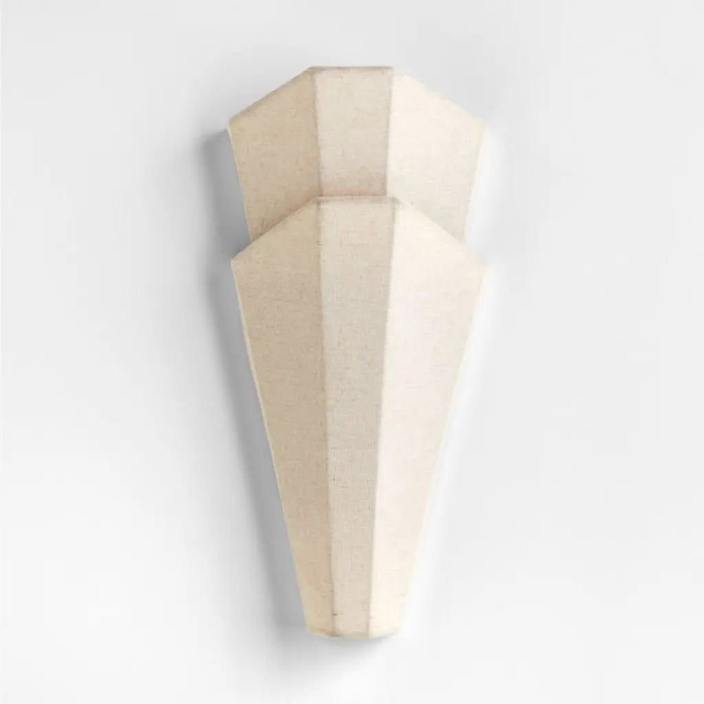 Designed by Athena Calderone, this sconce is a study of the repeated geometry often found in 1930s design. The tiered shade layers two faceted and elongated fan shapes to offer beautiful depth and dimension. We're obsessed with the way the off-white sconce's subtle presence -but once illuminated, the layered linen creates a magnetic play of light and shadow. Quiet-yet-bold Memoria glows lining a hallway, flanking a buffet or brightening a stairway landing.Our collaboration with interior designer and bestselling author Athena Calderone brings you a collection of pieces that honor refined and elegant forms. Inspired by the timeless shapes and palettes of the 1930s, Crate x Athena fine-tunes scale, elevated materials and comfort to fit seamlessly into your home.