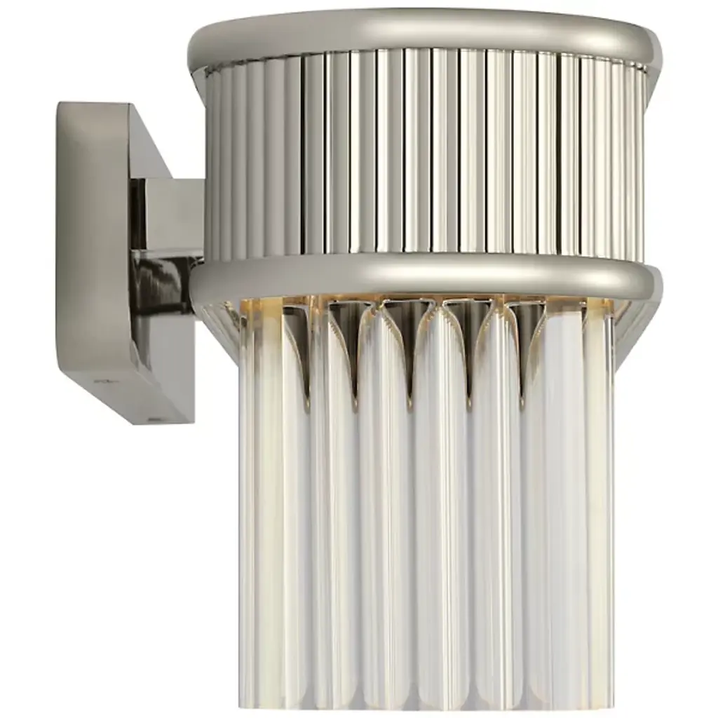 The Menil LED Wall Sconce from Visual Comfort Signature shows Marie Flanigan's mastery of linear decoration. A cascade of glass rods descends from the mounting plate, creating a waterfall effect that transforms when illuminated. The fixture works brilliantly in luxury bathroom settings, such as dramatic hallway lighting or flanking oversized mirrors, where it can maximize the interplay between light and glass.