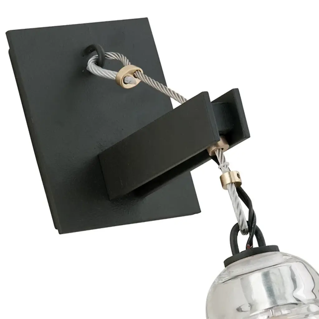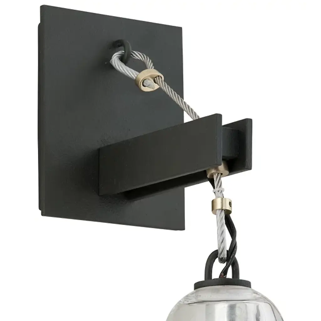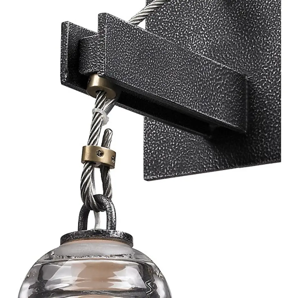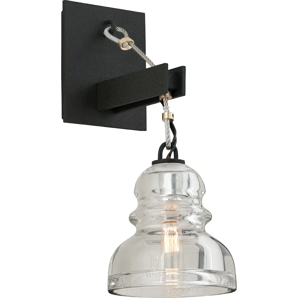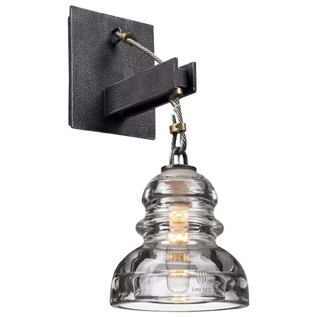 The Menlo Park Wall Sconce by Troy Lighting celebrates the beauty of the industrial age, featuring a Historic Pressed glass shade that suspends from an Iron I-beam style wall plate via a solid brass turnbuckle-style cable. A vintage Edison bulb shines from within the shade, producing a warm, distorted ambiance reminiscent of the 19th century urban environment.
