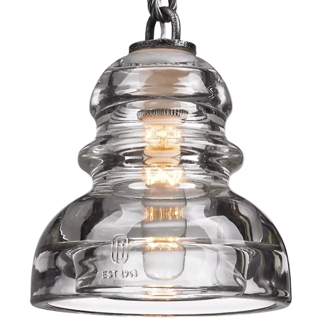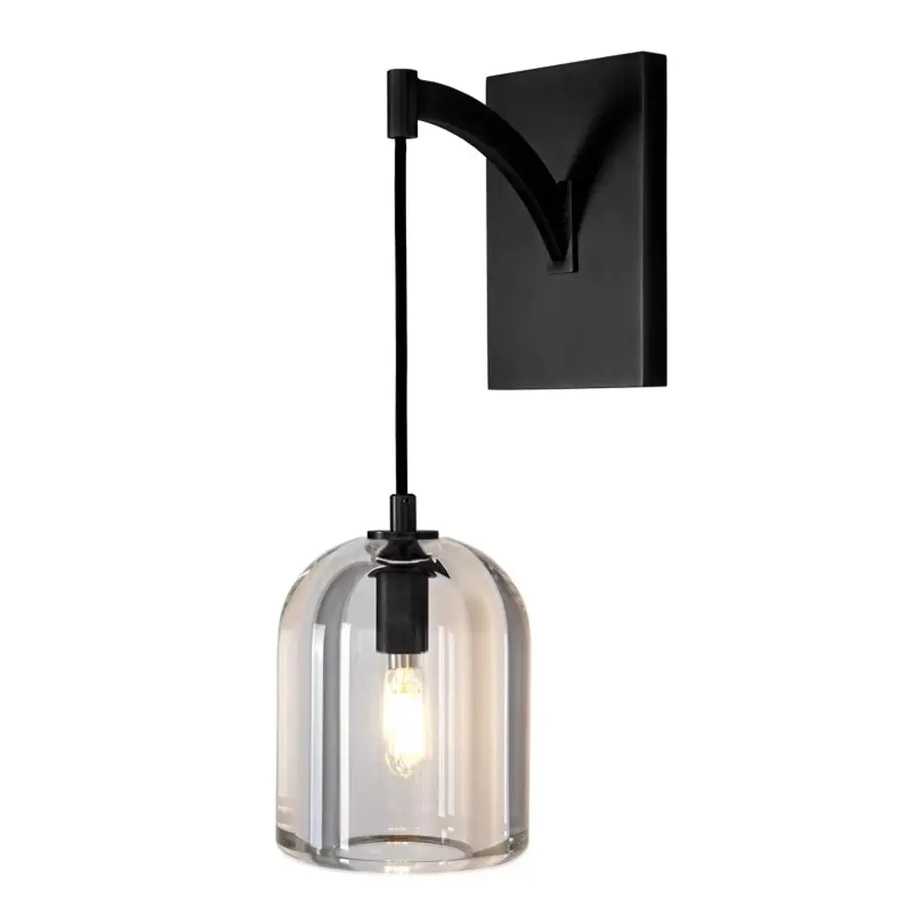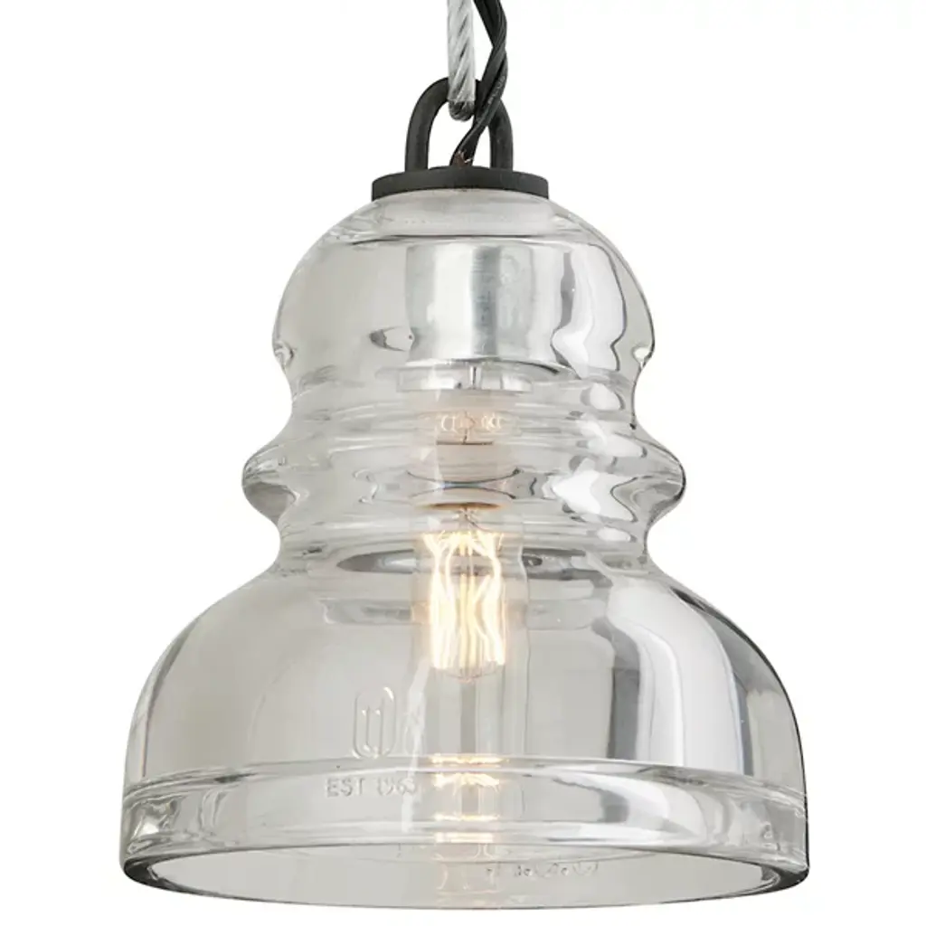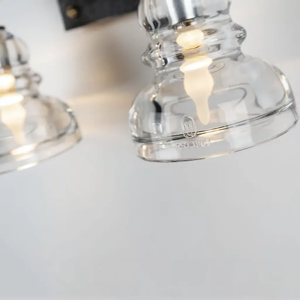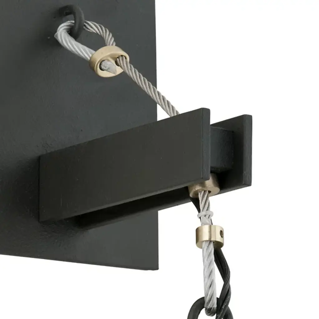 The Menlo Park Wall Sconce by Troy Lighting celebrates the beauty of the industrial age, featuring a Historic Pressed glass shade that suspends from an Iron I-beam style wall plate via a solid brass turnbuckle-style cable. A vintage Edison bulb shines from within the shade, producing a warm, distorted ambiance reminiscent of the 19th century urban environment.