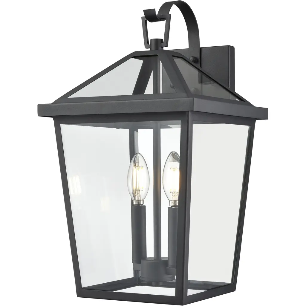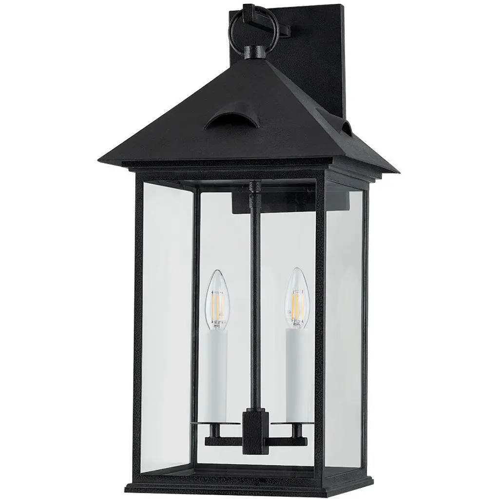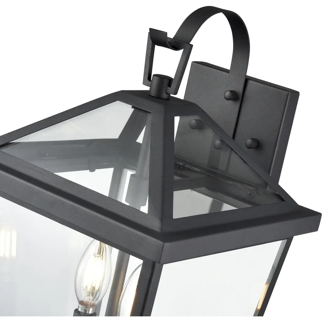 The Mensun Collection of outdoor sconces is characterized by its archetypal Georgian era form with a tapered silhouette and capped with an open canopy, allowing maximum illumination. Available as 1-light, 2-light and 3-light options, the fixtures are finished in textured black and intended to create a stately presence, lighting common areas or flanking entryways and garages.