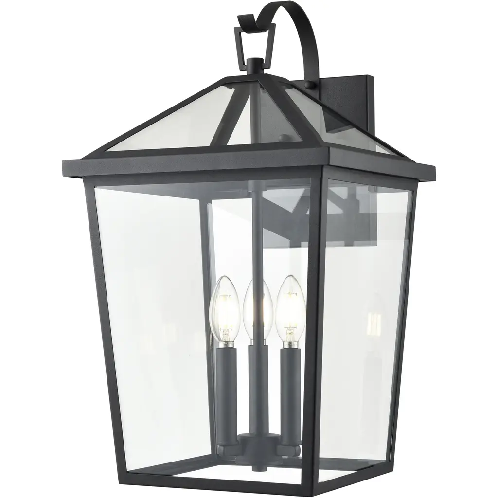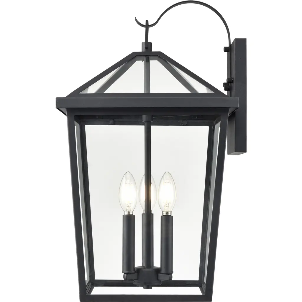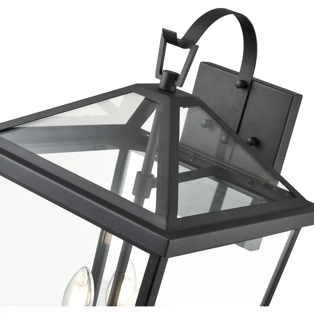 The Mensun Collection of outdoor sconces is characterized by its archetypal Georgian era form with a tapered silhouette and capped with an open canopy, allowing maximum illumination. Available as 1-light, 2-light and 3-light options, the fixtures are finished in textured black and intended to create a stately presence, lighting common areas or flanking entryways and garages.