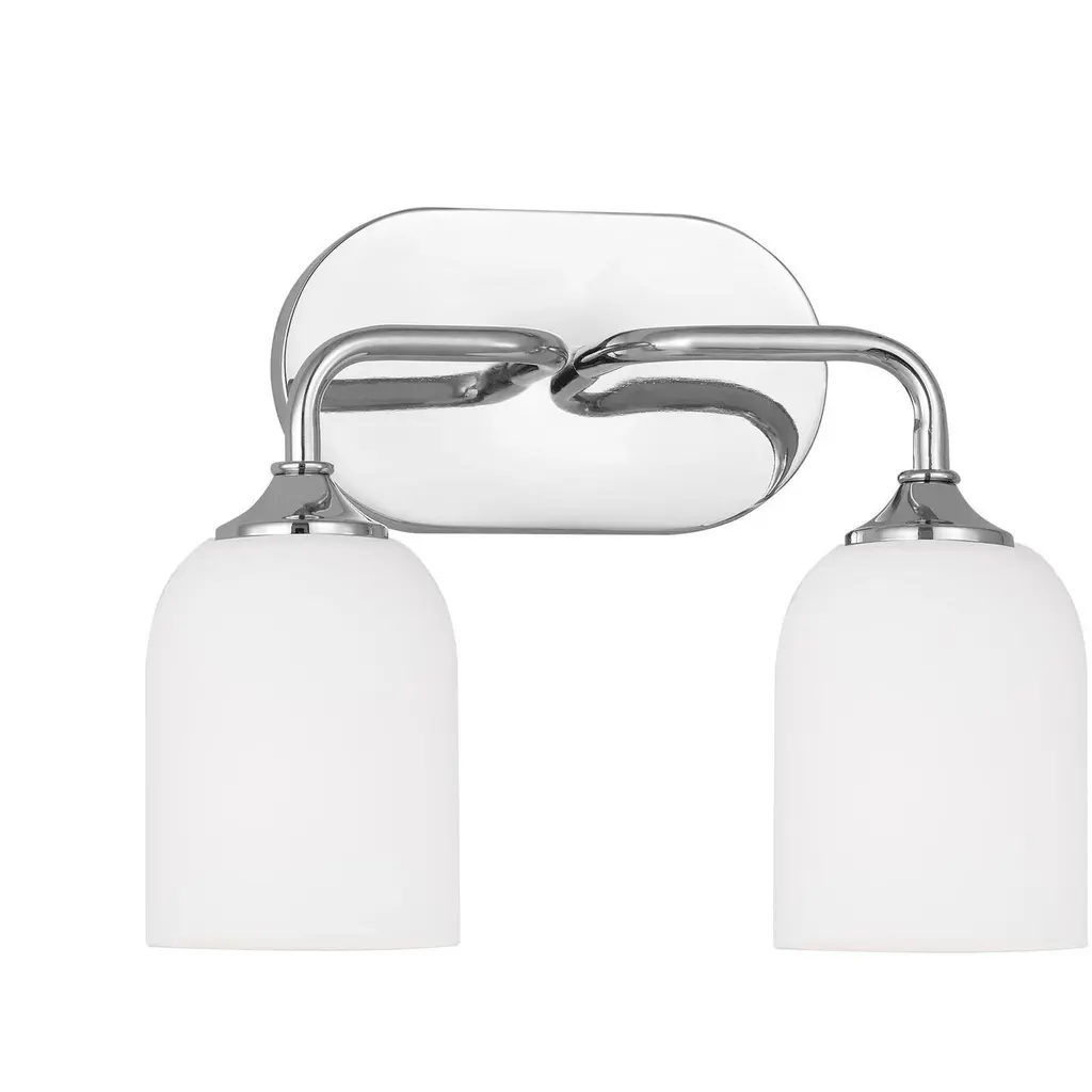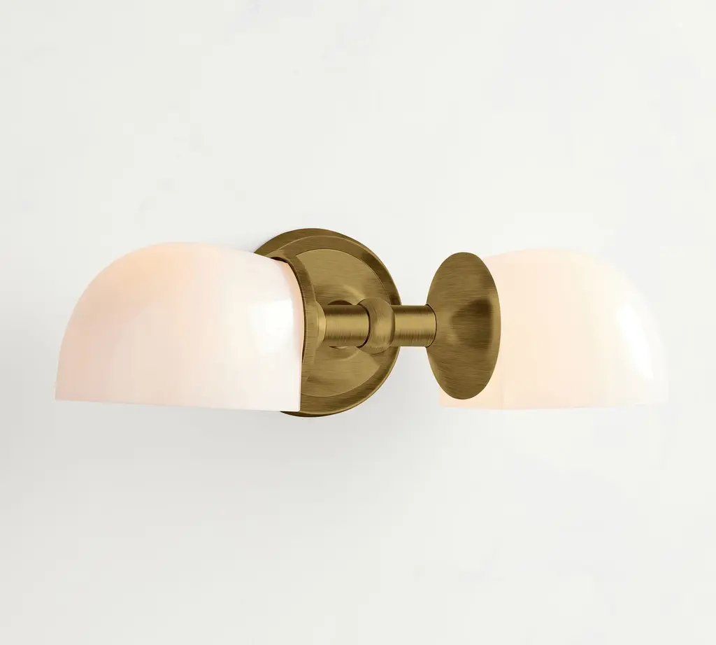 Marked with a stepped medallion base, this double horizontal sconce from our Mercer Lighting Collection puts your bath in the best possible light. Frosted milk-glass shades add a soft touch.