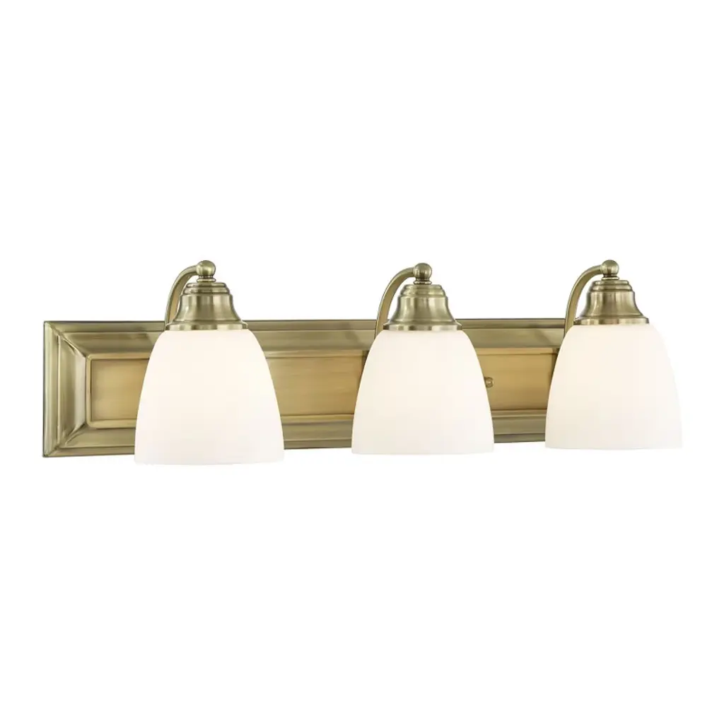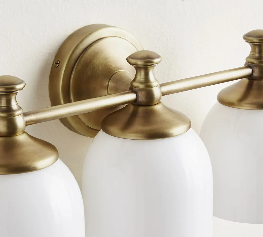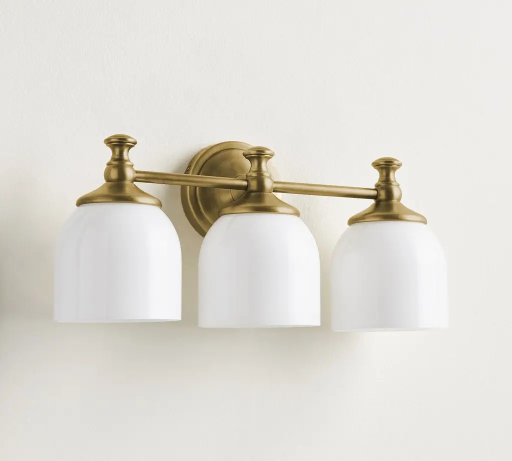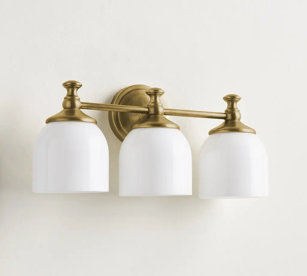 Marked with a stepped medallion base, this triple sconce from our Mercer Lighting Collection puts your bath in the best possible light. Frosted milk-glass shades add a soft touch.