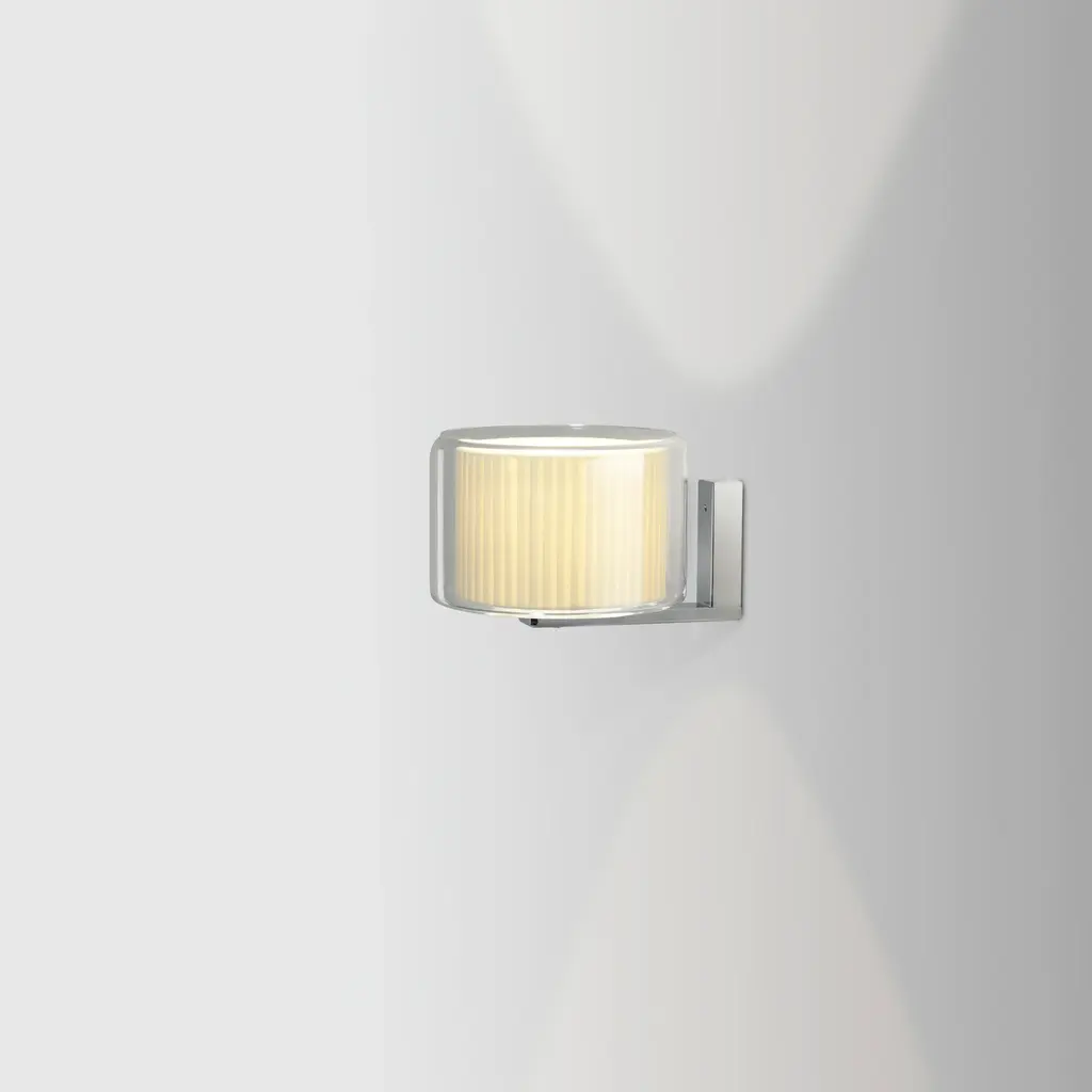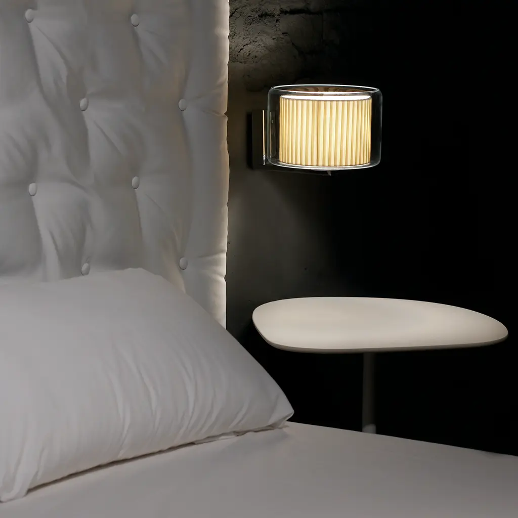 Floating next to a bed or above a console, the Mercer Wall Lamp wraps its warm presence in luminous blown-glass. Within, designer Joan Gaspar proves turnabout is more than fair play by placing the lamp's pleated shade inside the transparent drum fixture. From Barcelona's Marset, this construct protects the shade while also producing additional glowing reflections—as well as a generous light. Additionally, the choice of shade colors in natural, pearl white or black offers varying degrees of illumination.
