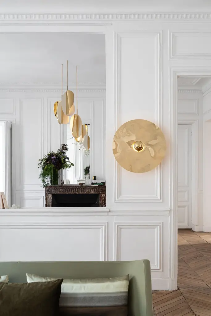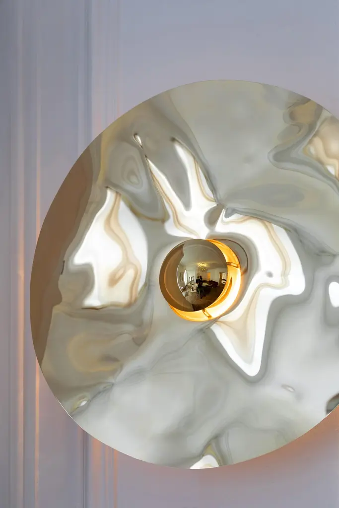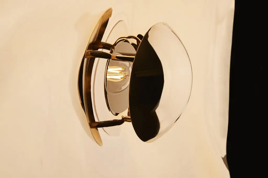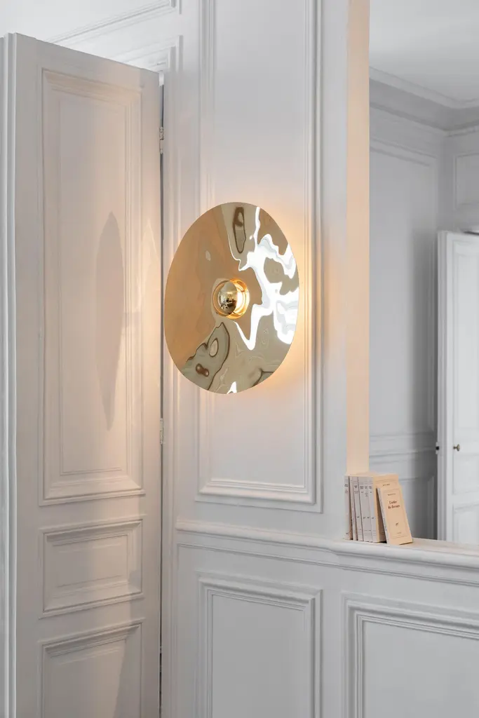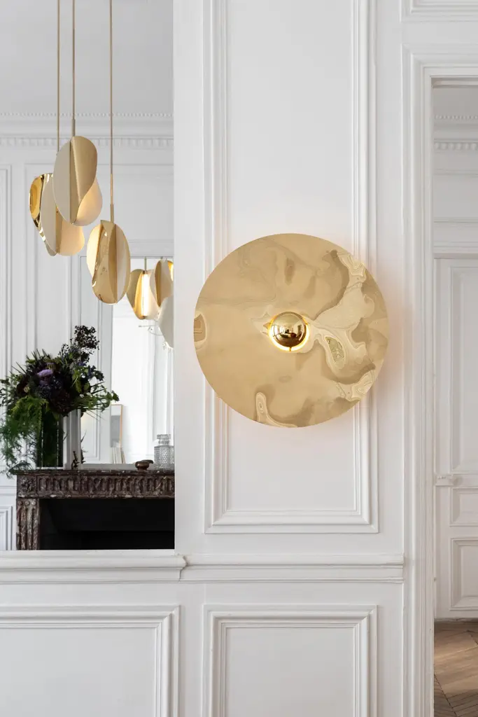 Mercure wall lamp by Mydriaz.Dimensions: W 40 x H 40 x D 17 cmMaterials: BrassFinishes: Golden-plated polished brass, White nickel finish on polished brass, Black nickel finish on polished brass3,5 kgLight source: Light bulb - 4 to 7 Watts - E14 - 220V or E12 - 110V -Class 2Certification: CE Certification, Other certifications possible via a subcontractor Our products are handmade in our workshop. Dimensions and finishes may vary slightly from one model to another dimensions can be customized certain changes in finishes and/or dimensions may result in additional costs.Founded in 2011, MYDRIAZ is a creation studio specializing in the tailor-made production of decorative lighting, monumental installations and brass furniture.At the head of MYDRIAZ, Jennifer Midoz and Malo du Bouëtiez offer refined sets combining brass with other noble materials. From the first sketch to the installation, the creators participate in all stages of the production.Elegance, balance and harmony are at the heart of their aesthetic concerns.Working at the convergence of artistic and craft disciplines, their work around lighting and furniture combines traditional manufacturing methods with contemporary techniques. Between requirement and avant-garde research, MYDRIAZ places sensitivity, finesse and lightness at the heart of its philosophy.