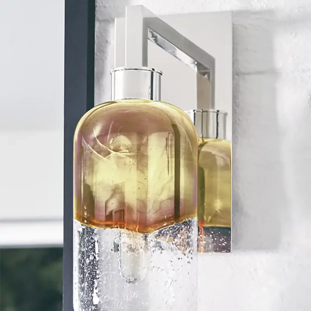 Give wall and hallway spaces a rich, individual appeal with the enduring, measured lines of the Mercurio Wall Sconce from Niche. An enduring update on transitional fixtures, the design springs from the mind of Jeremy Pyles and starts with a stepped rectangle wall mount in sleek steel that extends an angular arm down to a single socket housing held within a capsule shade of handblown glass. The clear glass is accompanied by a fused metallic overlay around its upper half, transforming its surroundings with a mix of ambient glow and radiant reflections.