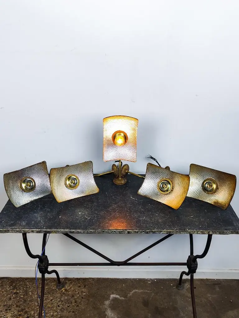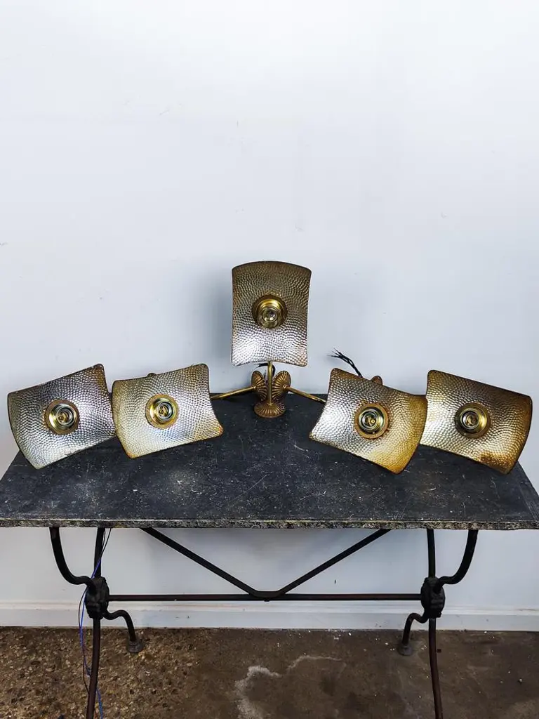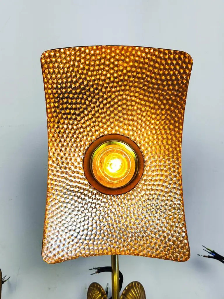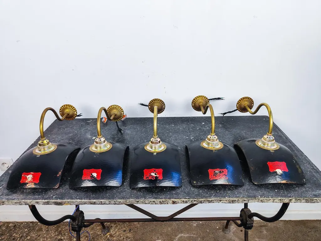 Lovely English mercury glass mirrored wall lights with brass fixtures. The reflectors are made by Sunray London and marketed by Strand electric Batten in the 1920’s, we fitted them with old brass brackets. This piece has an attribution mark, I am sure that it is completely authentic and take full responsibility for any authenticity issues arising from misattribution, Up to 250V (Europe/UK Standard).The wiring of this item may be original and might need replacement, if not specified otherwise.