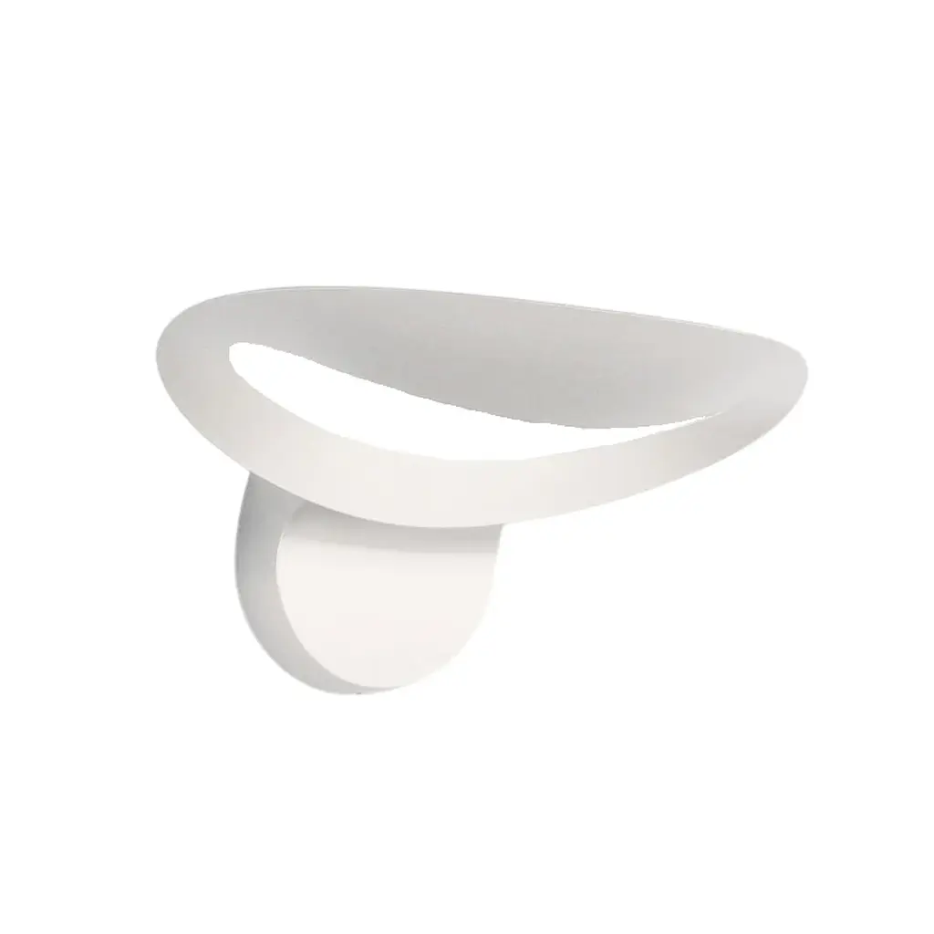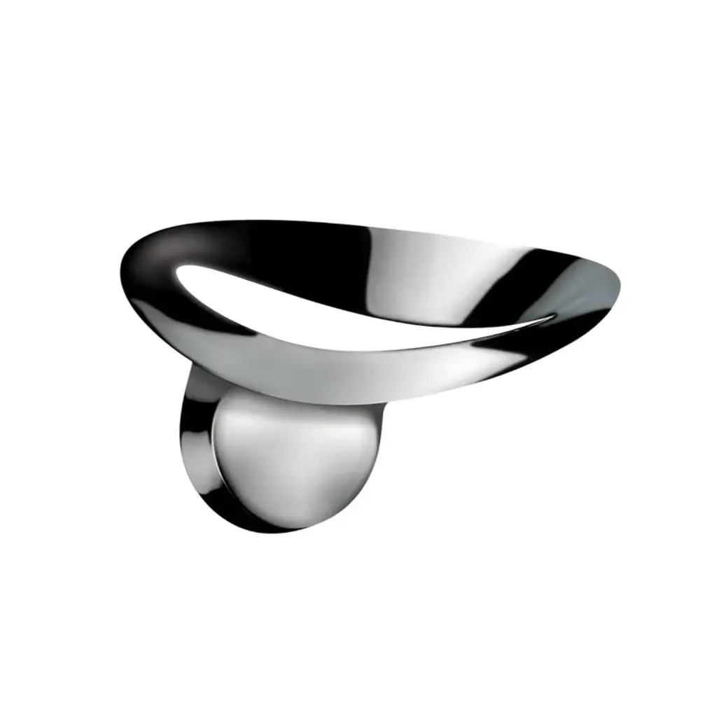 A sinuous linear form masks the light source it contains, emitting a soft light upwards. Die-cast aluminum body available painted white or in polished aluminum. Features
