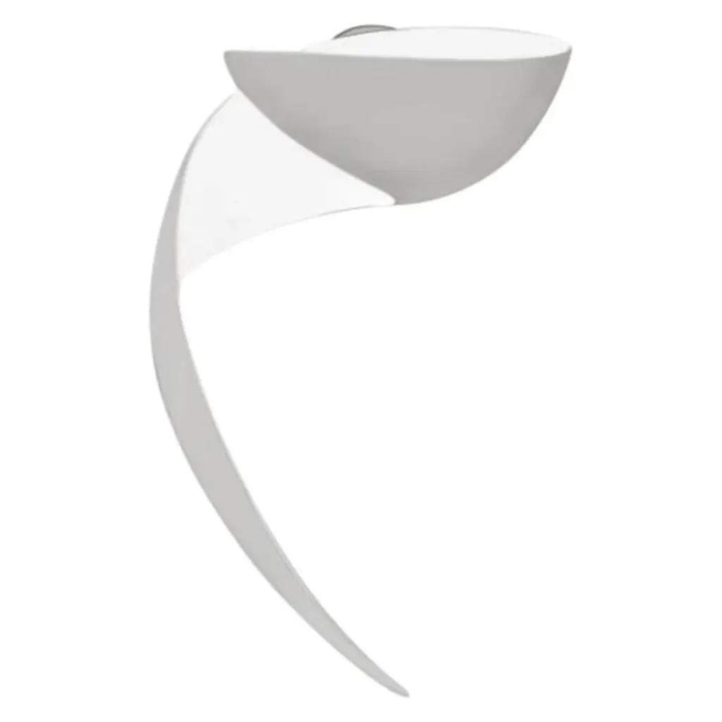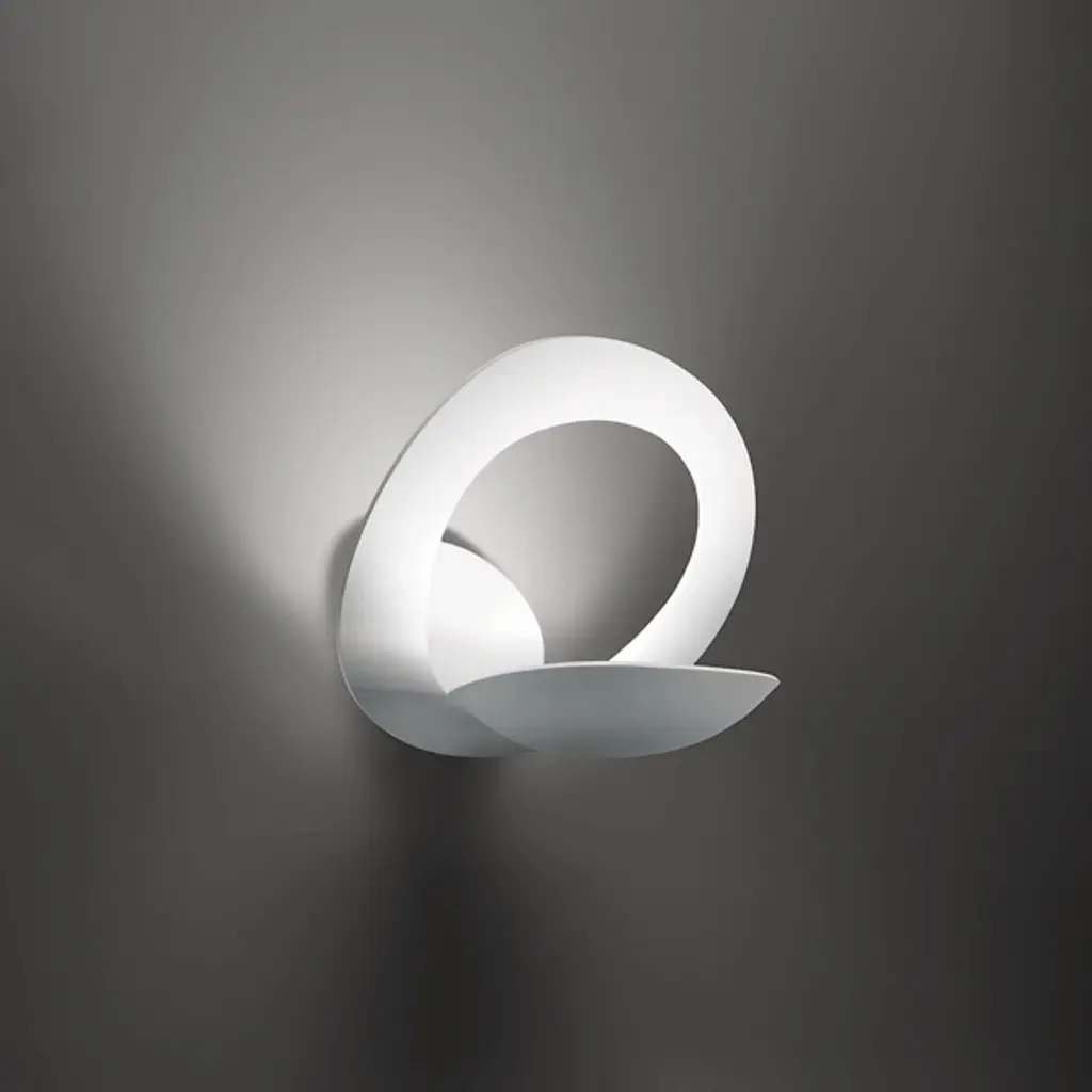 A sinuous linear form masks the light source it contains, emitting a soft light upwards. Die-cast aluminum body available painted white or in polished aluminum. Features