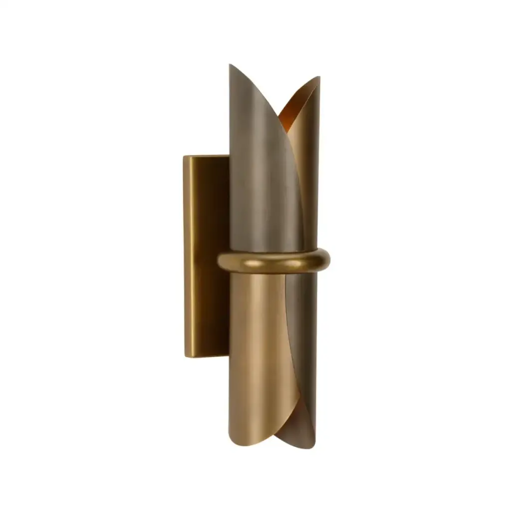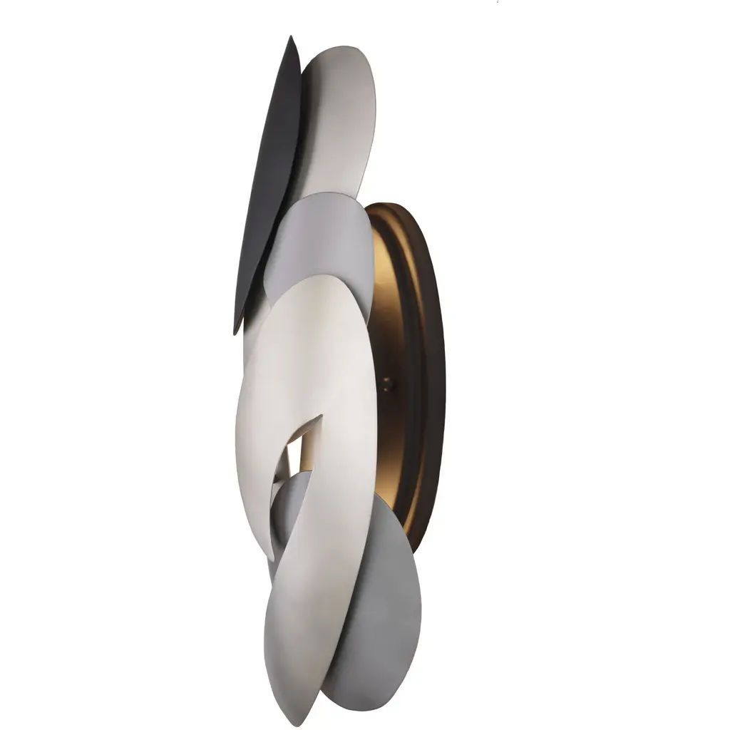 The Metalo Misto Wall Sconce from George Kovacs defies traditional lighting with its dynamic overlapping panels that are presented across the wall. Steel sheets in varying shades curve and twist around a central illumination point, creating depth through intentional negative space. The light filters through precise cutouts, producing a gentle, welcoming glow in the room. The dimmable light source allows control over the intensity of illumination, letting you adjust the mood from subtle accent lighting to full brightness.