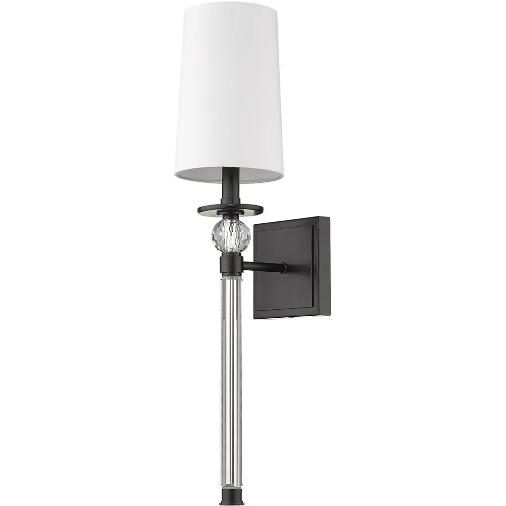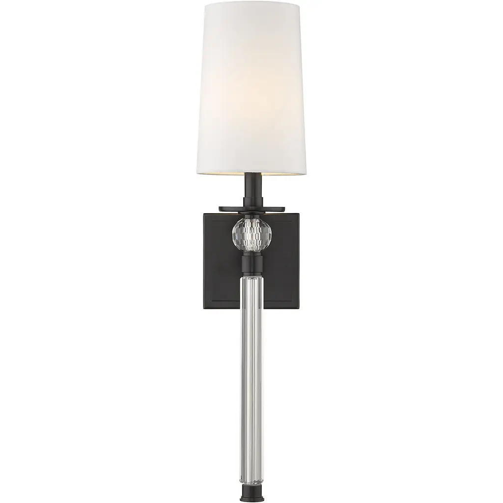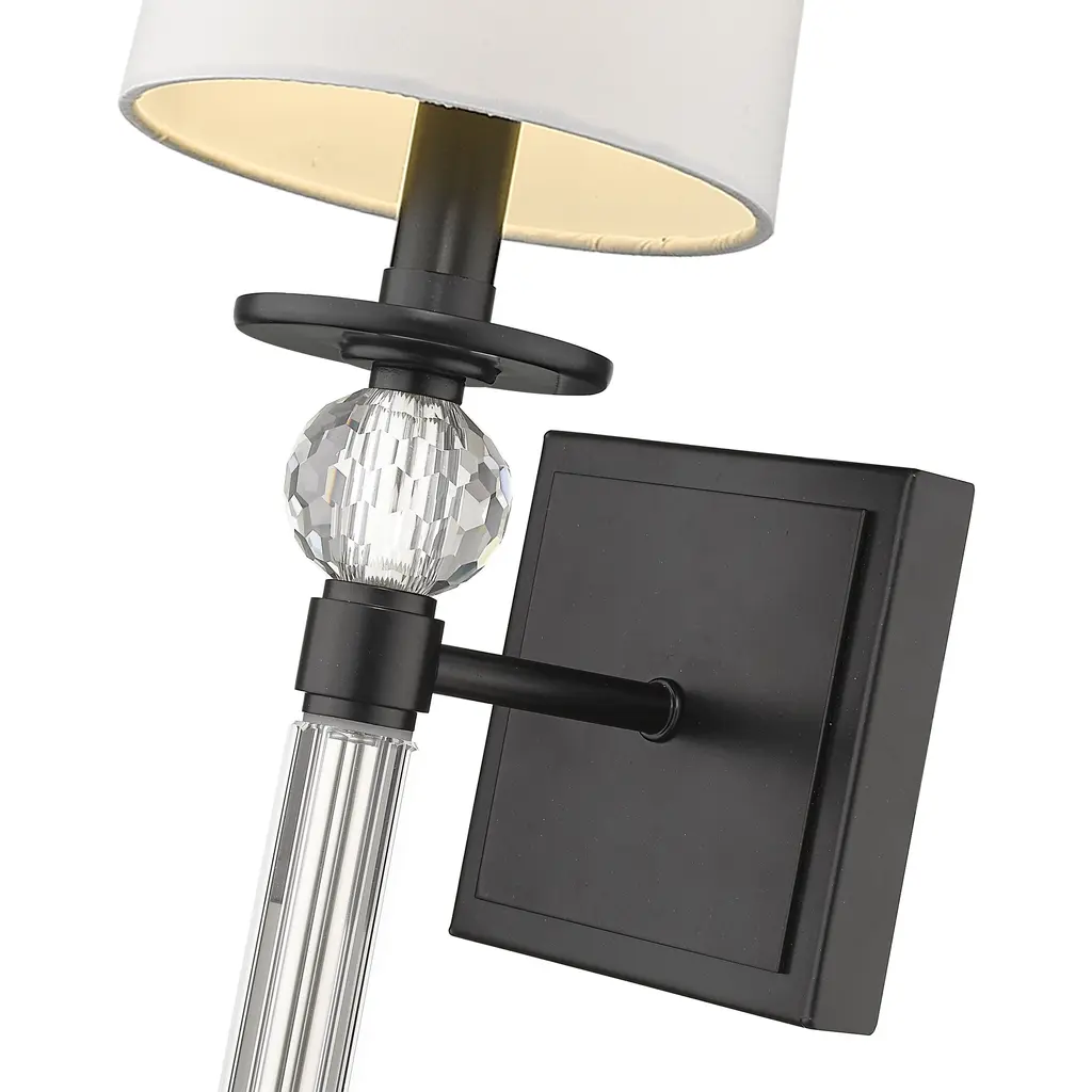 Light up a powder room, bedroom, or hallway with the exquisite artistry of this one-light wall sconce. A traditional lamp motif is modernized with tailored design elements featuring matte black finish steel and crystal. Topped with a fresh white fabric shade, this sconce becomes part of a sophisticated look in a contemporary or transitional space.