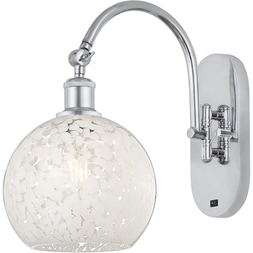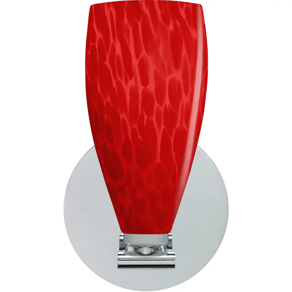 Mia has a classical bell shape that complements aesthetic, while also built for optimal illumination. Our Red Cloud glass is full of floating, splashes of red tones over cased red that resembles a watercolor painting when illuminated. This combination of color is crisp and timeless. This décor is created by rolling molten glass in small bits of red hues called frit. The result is a multi-layered blown glass, where frit color is nestled between an opal inner layer and a clear glossy outer layer. The handcrafted touch of a skilled artisan, utilizing century-old techniques passed down from generation to generation, creates variations in color and design that are to be appreciated. The mini sconce is equipped with a decorative lampholder mounted to either a low profile round or square canopy. These stylish and functional luminaries are offered in a beautiful Chrome finish.