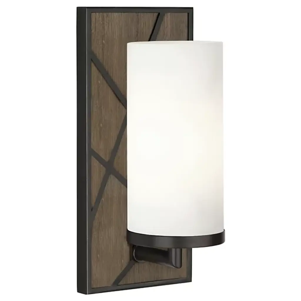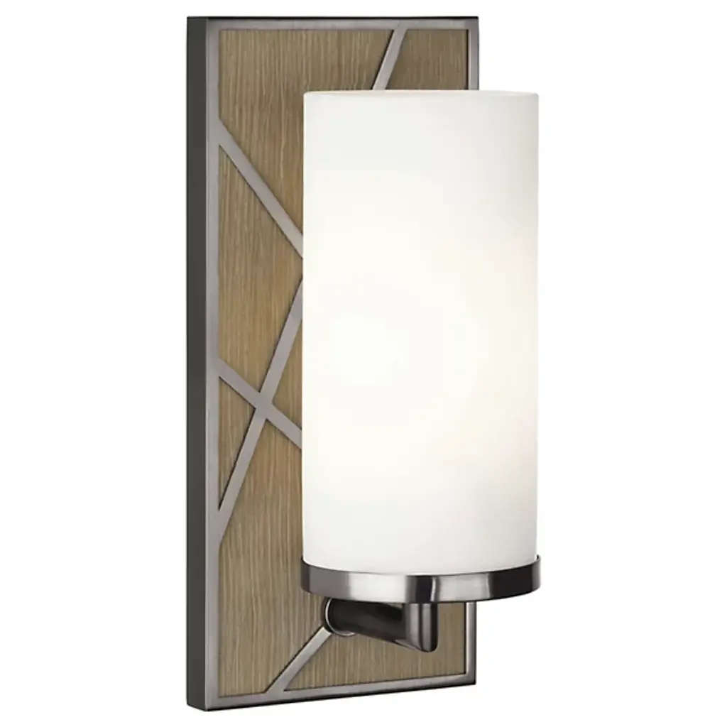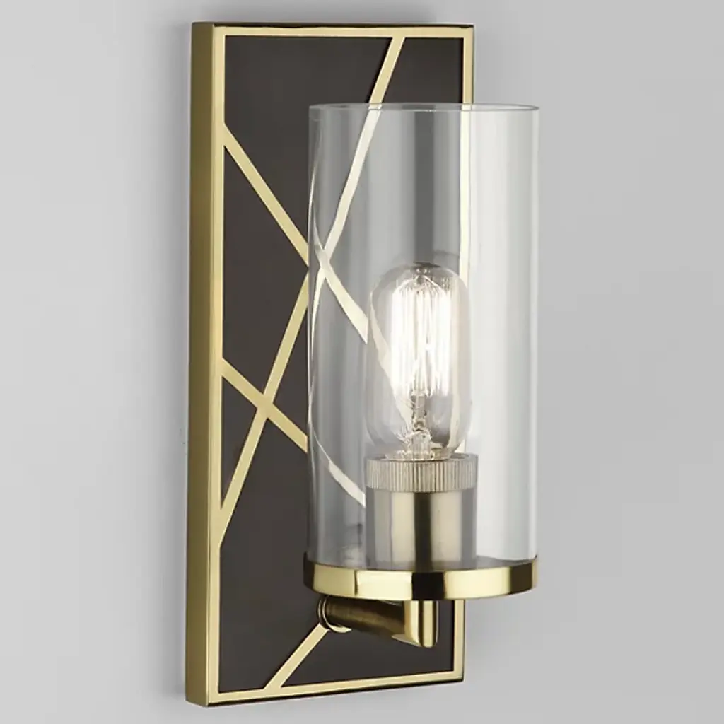 The Robert Abbey Michael Berman Bond Wall Sconce is a simple piece with added flair. The glass cylinder shade is juxtaposed against a rectangular backplate featuring graphic details evocative of a modern geometric painting. This added element truly uplifts the piece, making it an artistic representation of a standard wall light.