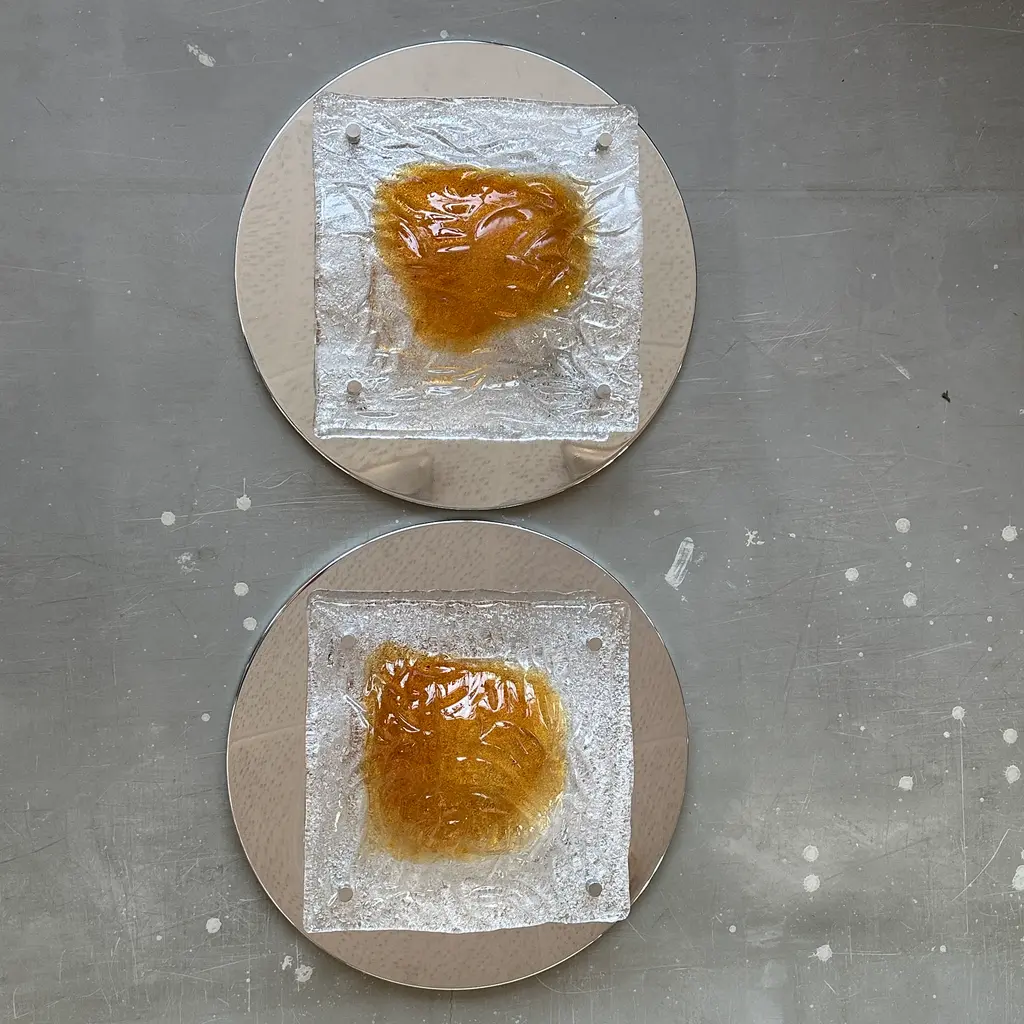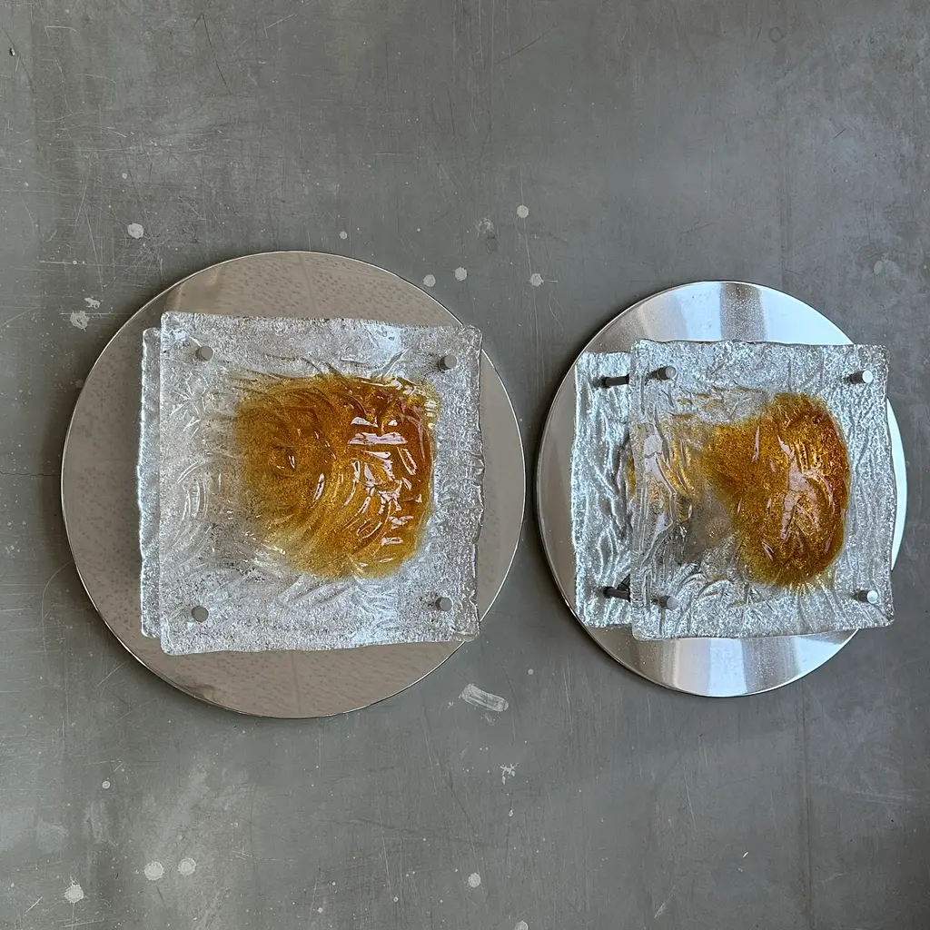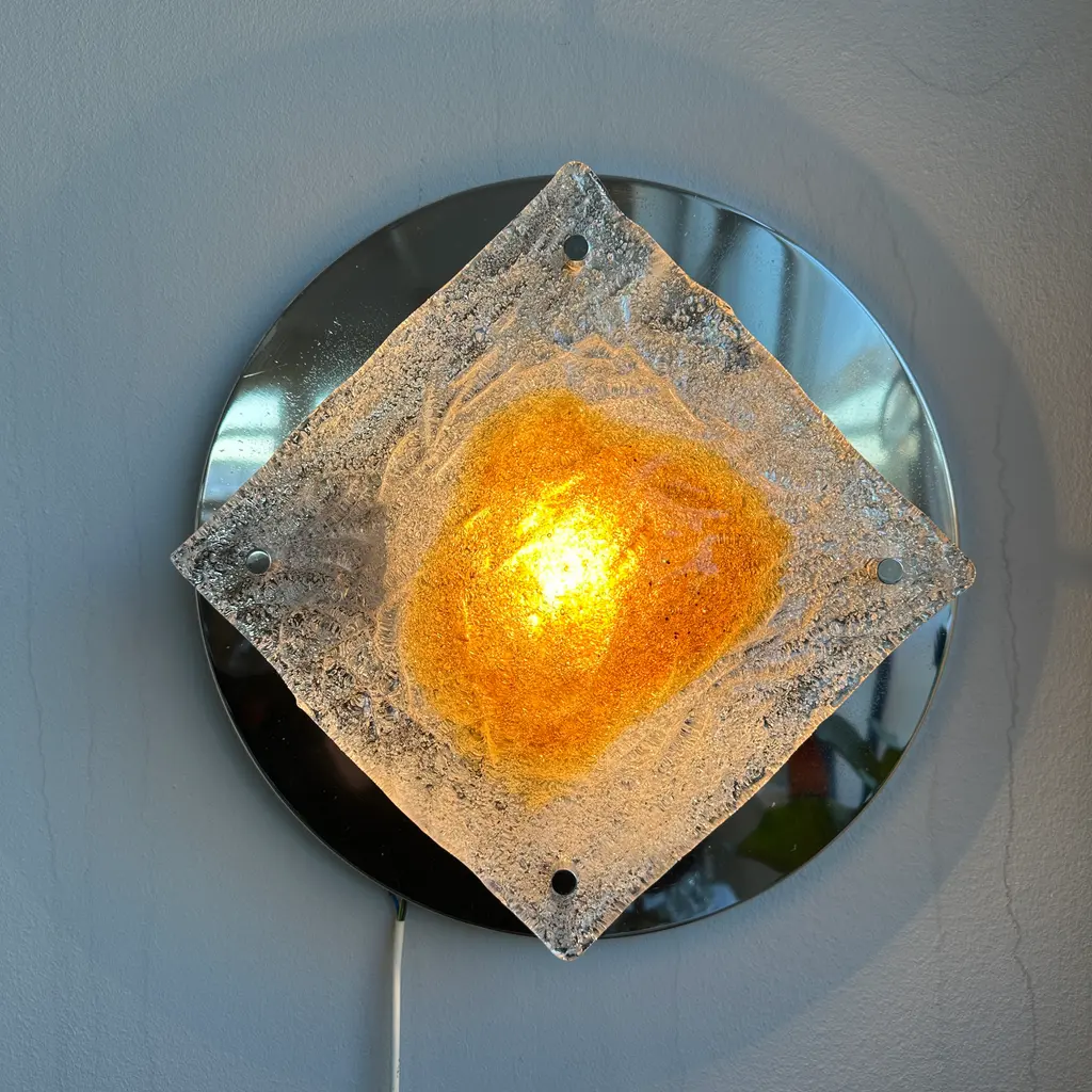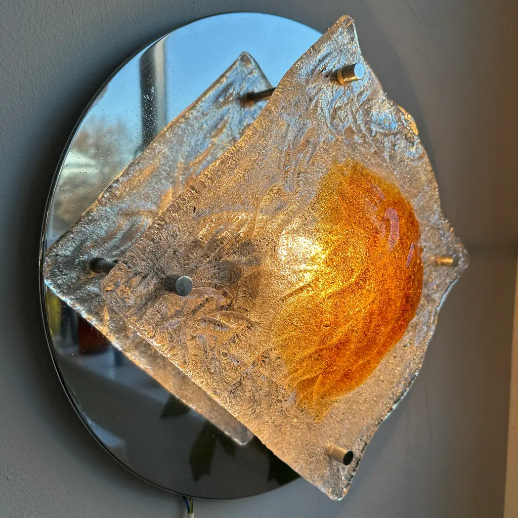 Beautiful Mazzega style flush mount sconce with Murano glass shade and chrome mounting. Italian mid century classic from the 70s with the combination of chrome and glass. The Murano glass shade possesses the typical Mazzegaesque abstract orange ornamentation, which provides a layer of artisticness to the sconces. The quadrilateral shade and the circular base in conjunction creates a phenomenal aesthetic pleasure. An E27 light bulb each to lighten up your space and your mood. Perfect piece for modern and traditional home interiors. The glass shade is immaculate and the chrome patina is consistent with age and use, see attached images. This piece is attributed to the mentioned designer/maker. It has no attribution mark and no official proof of authenticity, however it is well documented in design history. I take full responsibility for any authenticity issues arising from misattribution, Up to 250V (Europe/UK Standard).The wiring of this item may be original and might need replacement, if not specified otherwise.