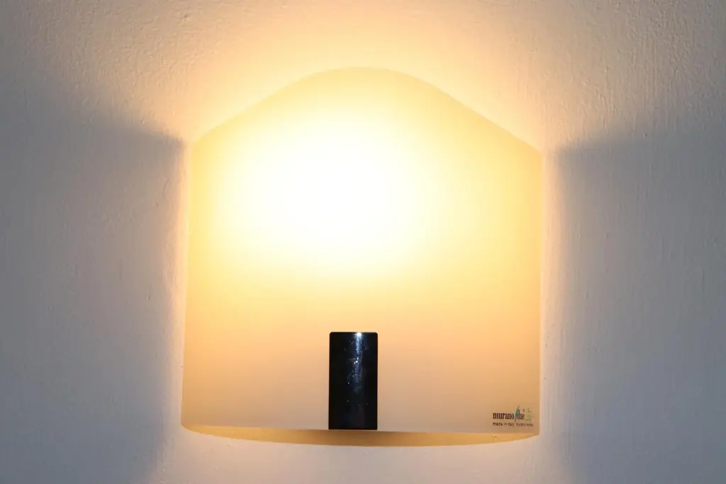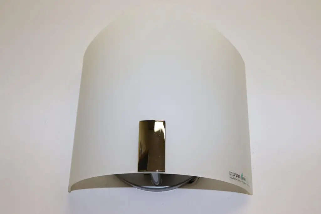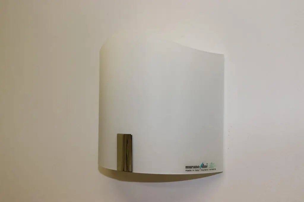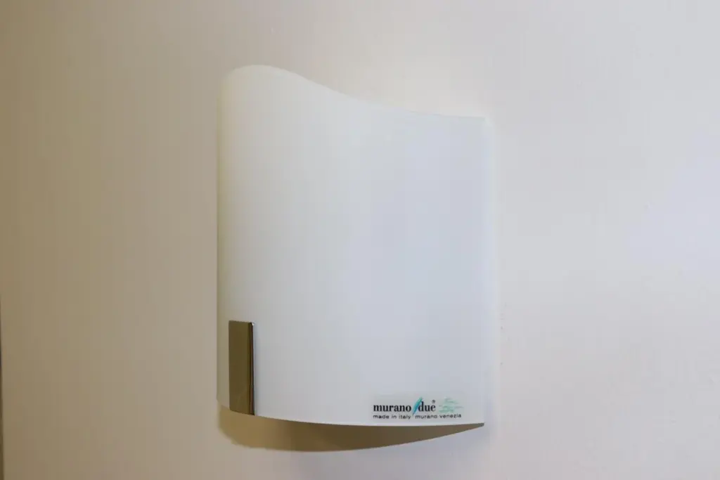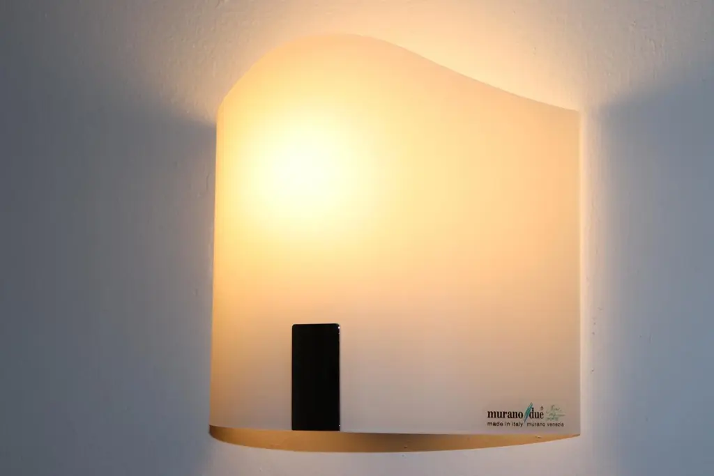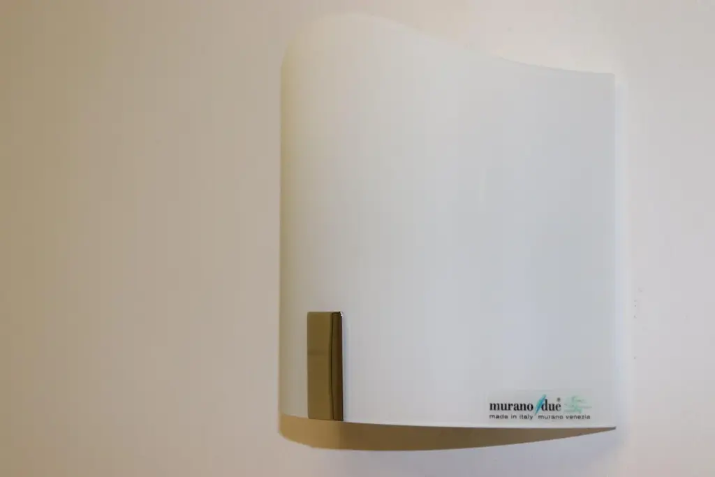 Wall Lamp "Veletta 20" Murano Curved White Glass, Satin Finish. Designed by Guido Rosati for Murano Due. Hardware in Light Artic Grey Lacquered Metal. Dimensions: Width 8" Depth 4 3/4" Height 7 1/2" Wattage: 100W E26