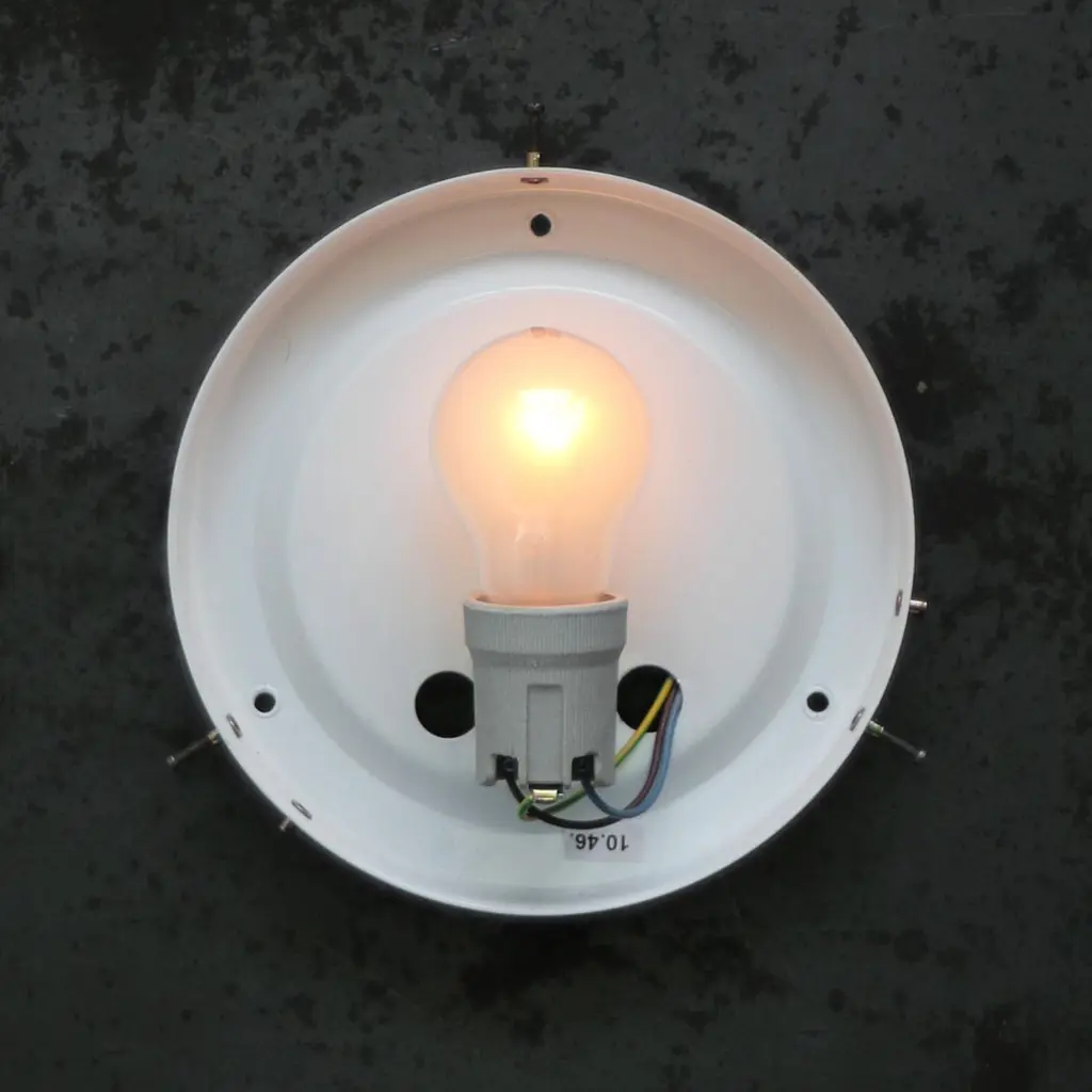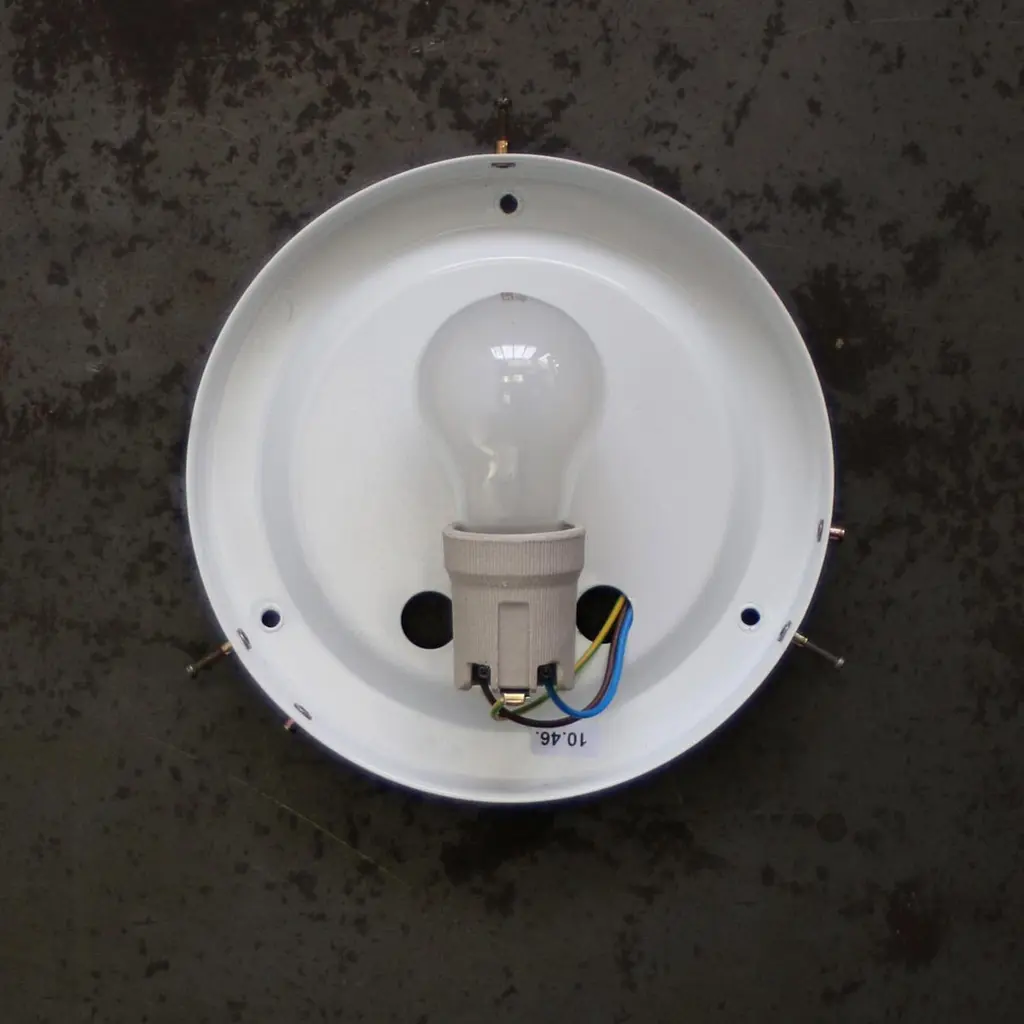 Mid-century wall or ceiling lamp.Metal base with white clear glass.1960-1970Weight: 1.85 kg / 4.1 lbPriced per individual item. All lamps have been made suitable by international standards for incandescent light bulbs, energy-efficient and LED bulbs. The new wiring is CE certified or UL listed. 100% safe. They can be set in operation immediately. Contact us for shipping prices for larger quantities. Excluding light bulb.