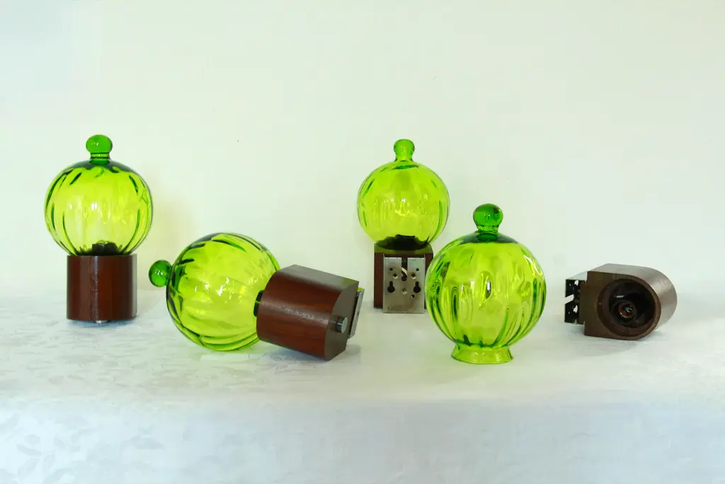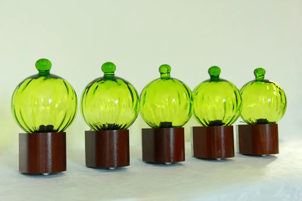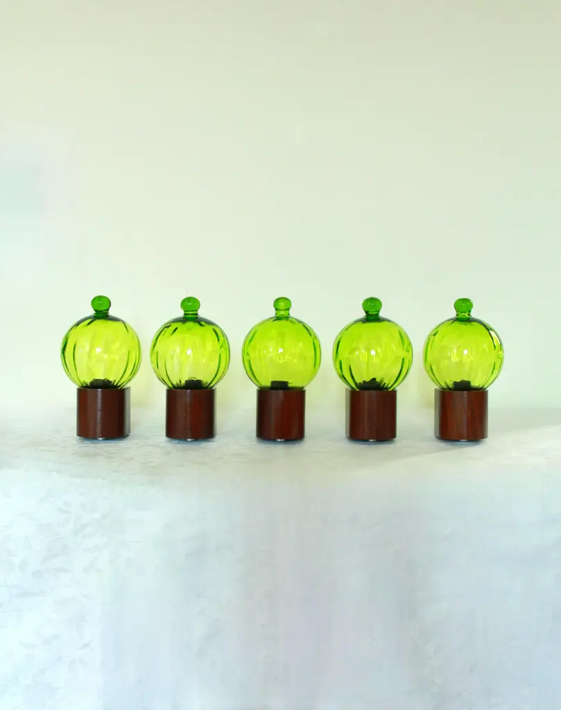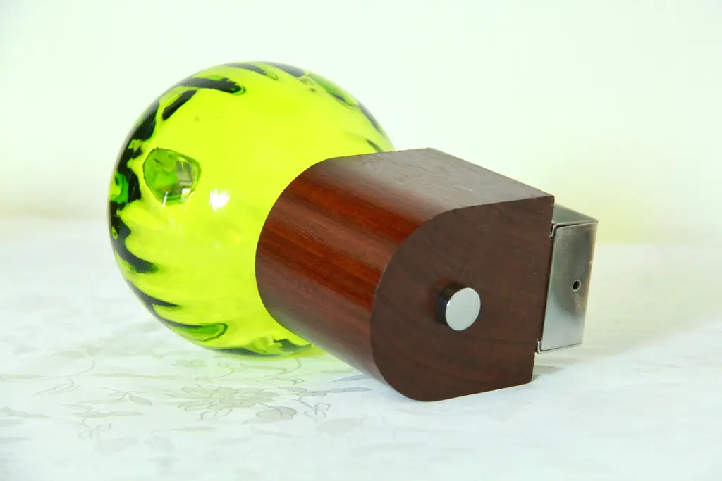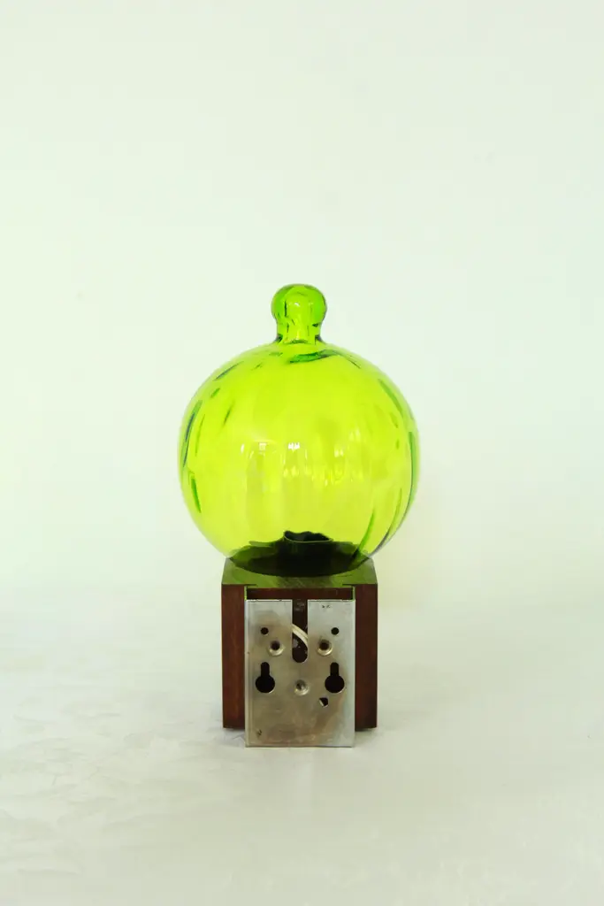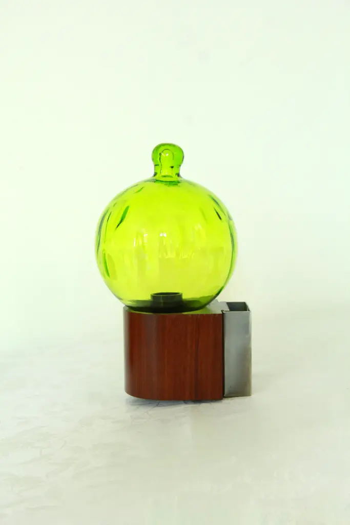 Goccia is a stunning wall lamp entirely realized in the early 60s. This lamp comes from Venice and was created to match the typical "Lanterne Veneziane" ceiling lamps of a beautiful Venetian villa. The glass is a bright green color and was produced in a renowned glass workshop on Murano island. The structure is finely hand-crafted in elegant rosewood by a local woodworker. The lamp fits a regular E14 light bulb. All the pieces are in perfect condition except for one, which has a tiny flaw in the wood visible in picture no. 9. This flaw does not compromise the beauty or functionality of the lamp and is very difficult to notice. Measurements Height : 22 cm / 8.6 inch Length : 12 cm / 4.7 inch Depth : 12 cm / 4.7 inch Up to 250V (Europe/UK Standard).The wiring of this item may be original and might need replacement, if not specified otherwise.