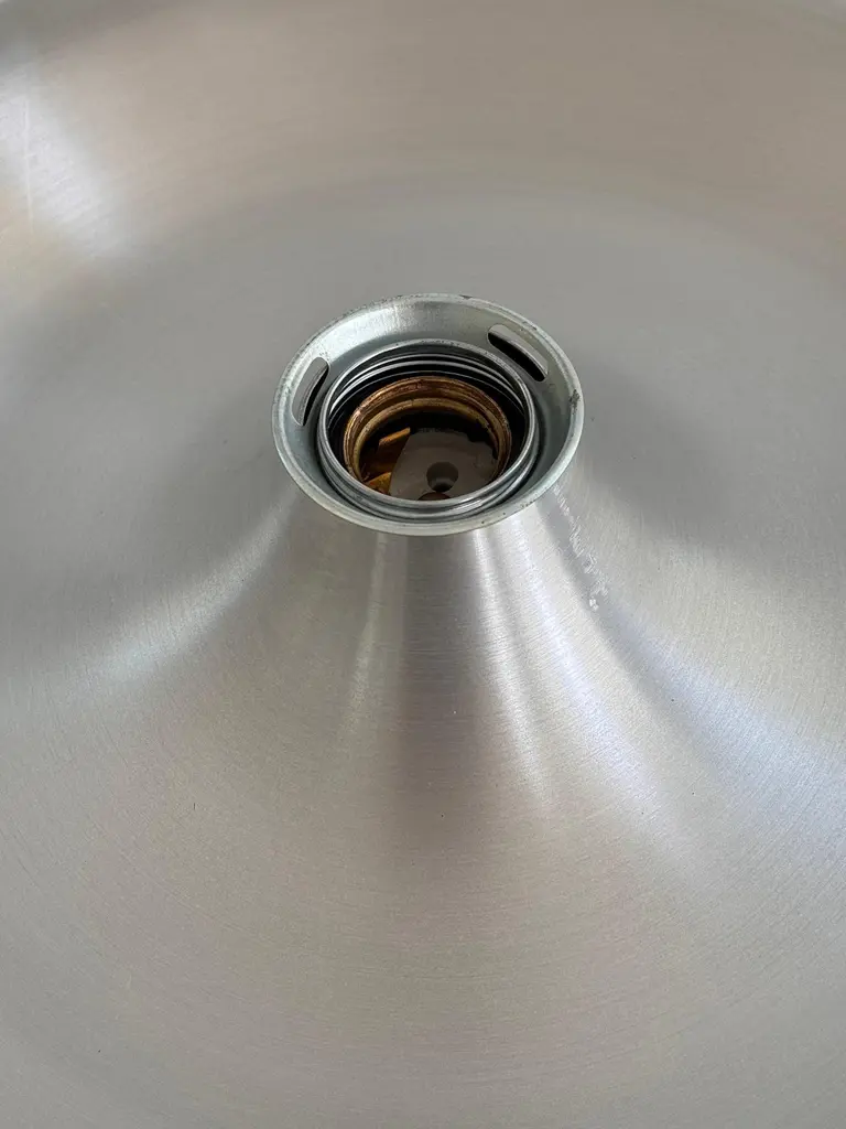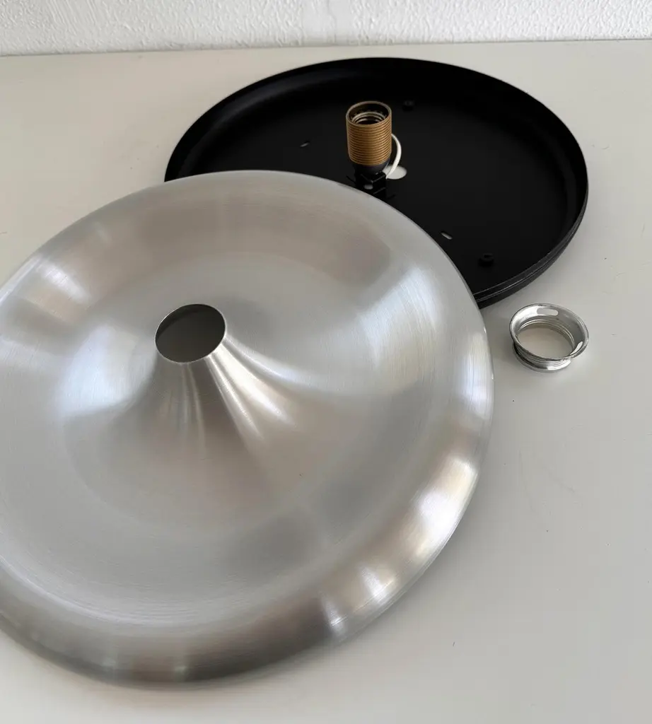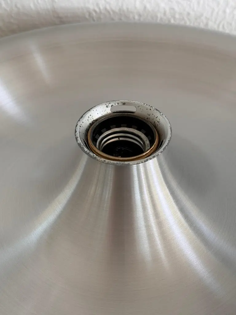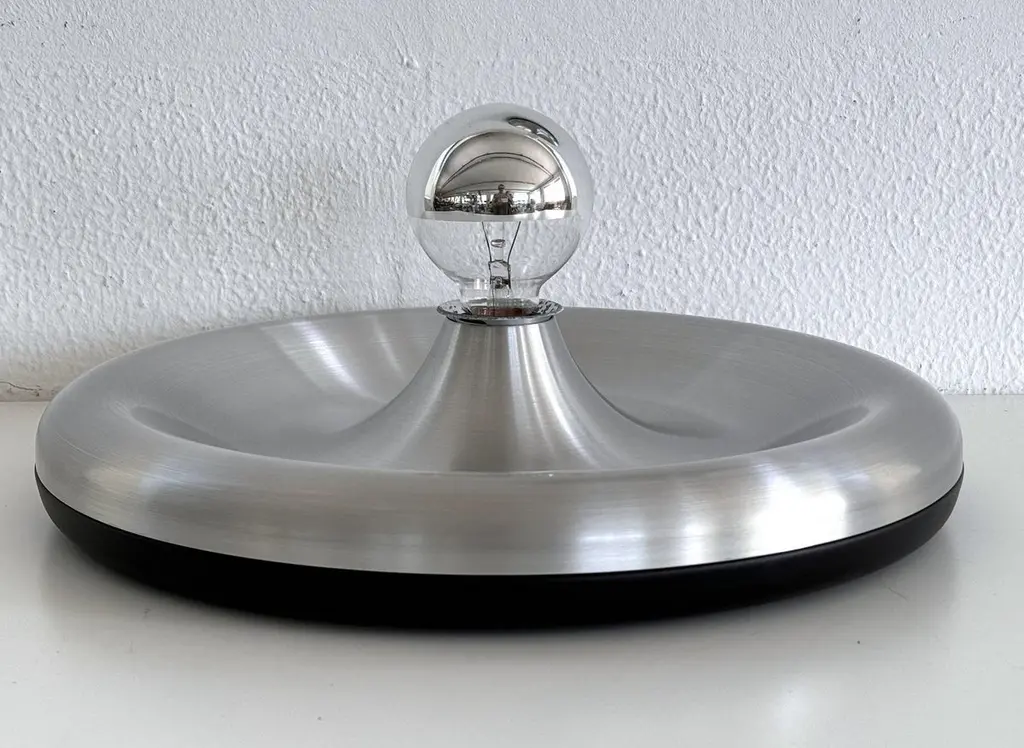 Beautiful new old stock of aluminium round flush mount lights or wall sconces. Made in Germany in the 1970s.The lights have never been used, they originate from a business liquidation.They are in overall very good condition with just little patina on the ring bulb holder, what will be covered from the bulb. We suggest to use a large big size bulb in white color or silver.Only one ( that is sold for last) has a little sign ( see picture), what is almost not seen when mounted.5 pieces available, sold separately.