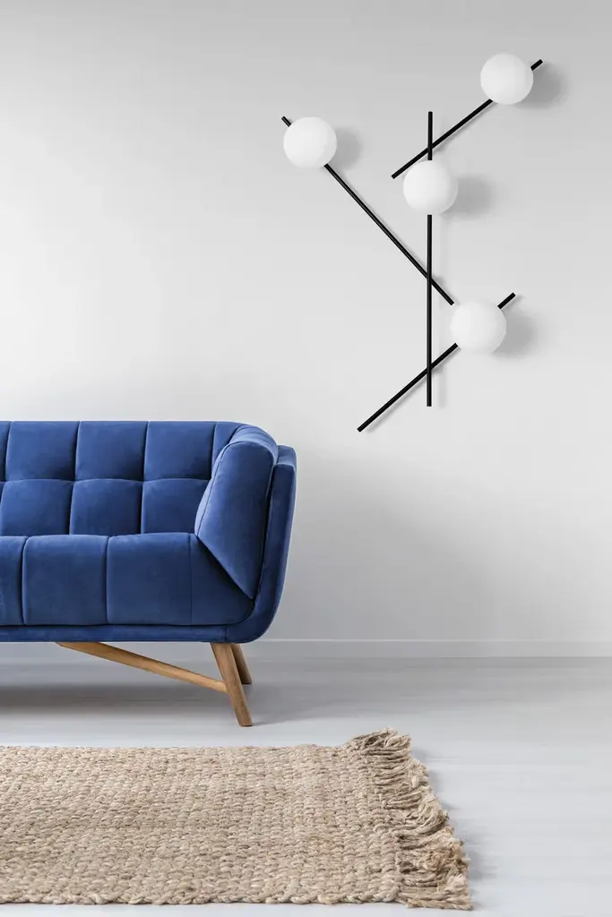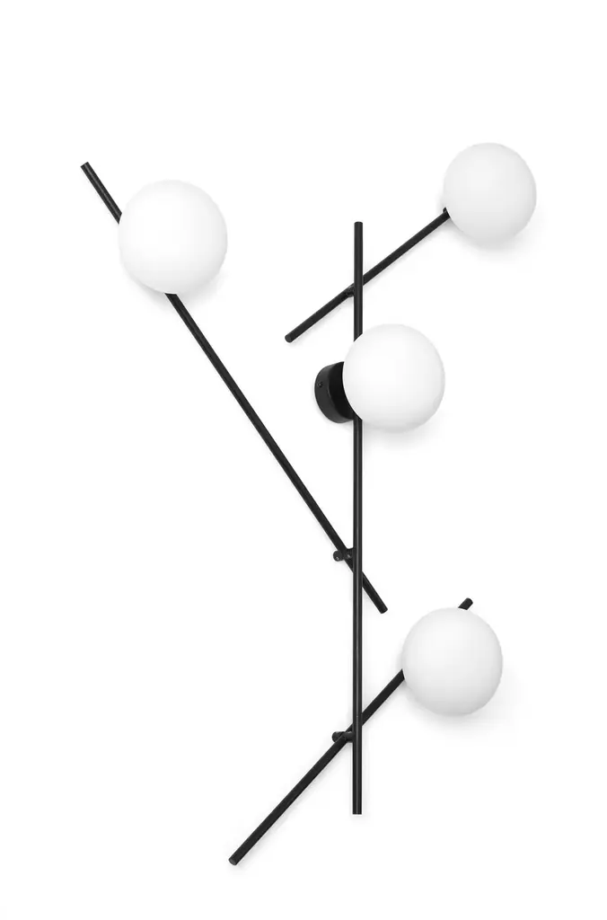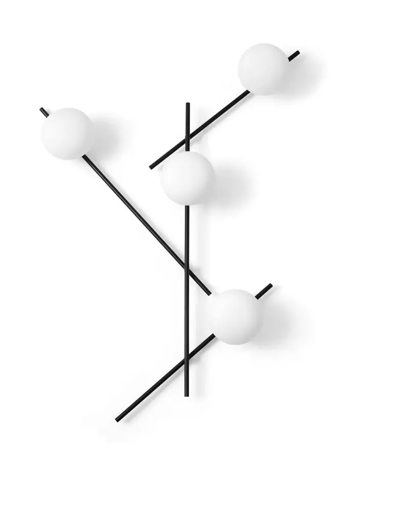 Mikado is a wall lamp with four lights with black soft touch powder coated metal frame and diffuser in milky white blown glass or in transparent borosilicate glass. The rotation of the secondary arm allows you to choose the preferred position.Technical information:- Light source: G9- Power: 4 x max 28wCompositional flexibility. MIKADO embodies the very essence of expressive and creative freedom: the ability to orient the rods at will allows the creation of orthogonal or dynamic geometries, exploring more rigid or more fluid solutions. The balance between the painted metal structure and the diffusers is completely disengaged from any formal constraints. This extreme autonomy is the reason why MIKADO was awarded the Good Design Award.