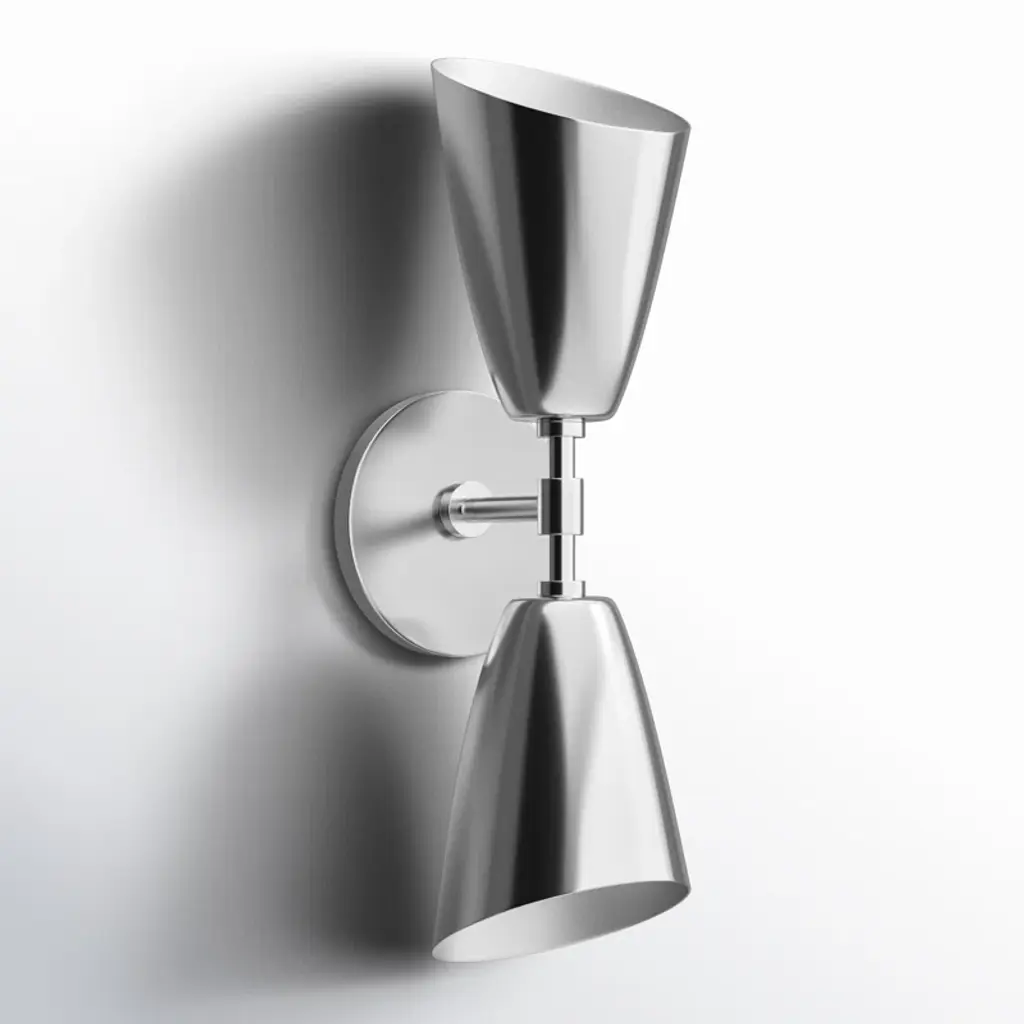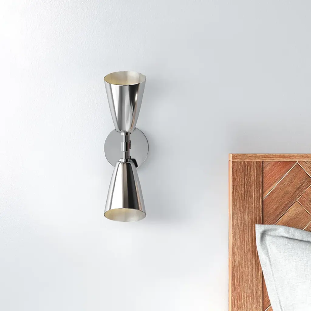 Drawing on the designs of mid-century lighting fixtures, this 2-light armed sconce elevates its cone shade with a bold metallic finish for a luxe look. Crafted from metal, this sconce features a circular backplate and a double-ended arm. On the top and bottom of the arm, double cone shades with high-low rims direct the light of the included LED bulb downward. And since the bulb is an integrated LED light, it's built into the fixture – and you don't need to worry about replacing it. This fixture is rated for damp spaces and is dimmable.