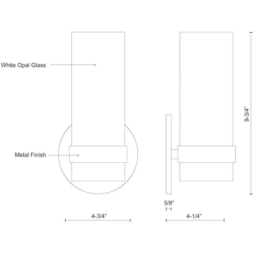 A sleek cylinder 9 inches long conceals the LED light source allowing for an even light distribution, like a scroll of paper that glows with mystery inside. There are no hotspots in this wall sconce, only an ambient glow. The opal glass is attached by a ring of brushed nickel, chrome, or brushed gold scroll and affixed to the wall by a matching circular metal disk.