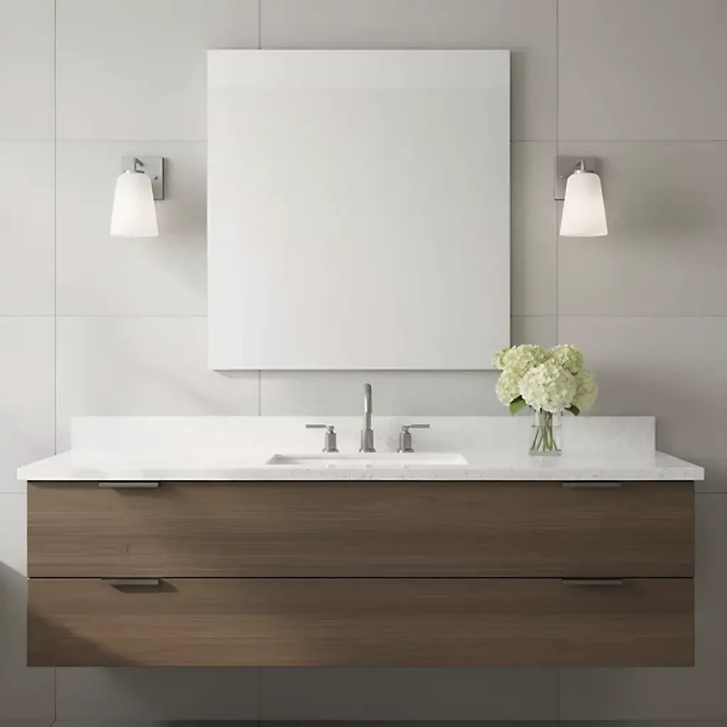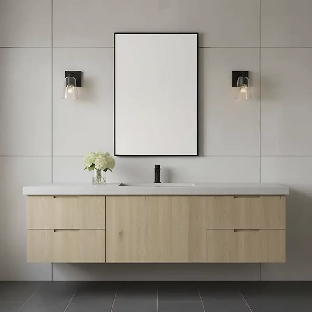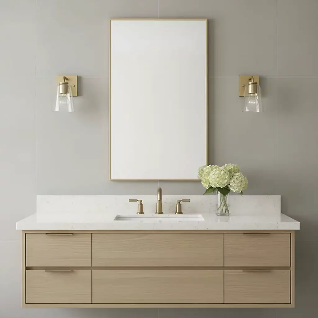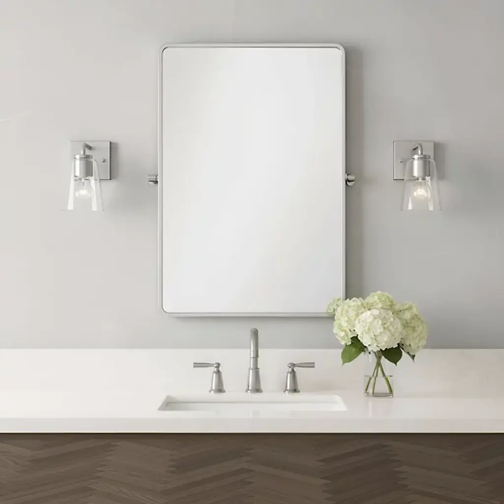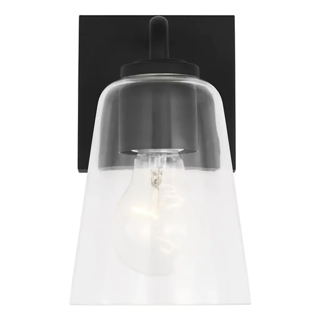 The Miles Bath Sconce from Generation Lighting employs a tapered glass shade that creates controlled light diffusion while maintaining the collection's bell-like profile. The shade can be oriented upward or downward to direct illumination where needed for task or ambient lighting. This single-light configuration maintains the classic proportions that define the collection, with its gentle taper from a wide opening to a narrow base. Clear bulbs work well with this fixture, complementing the shade's clean geometry and supporting dimming functionality.