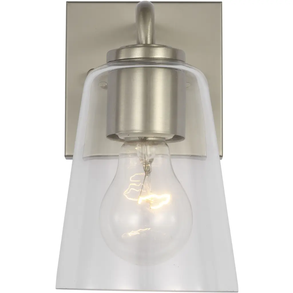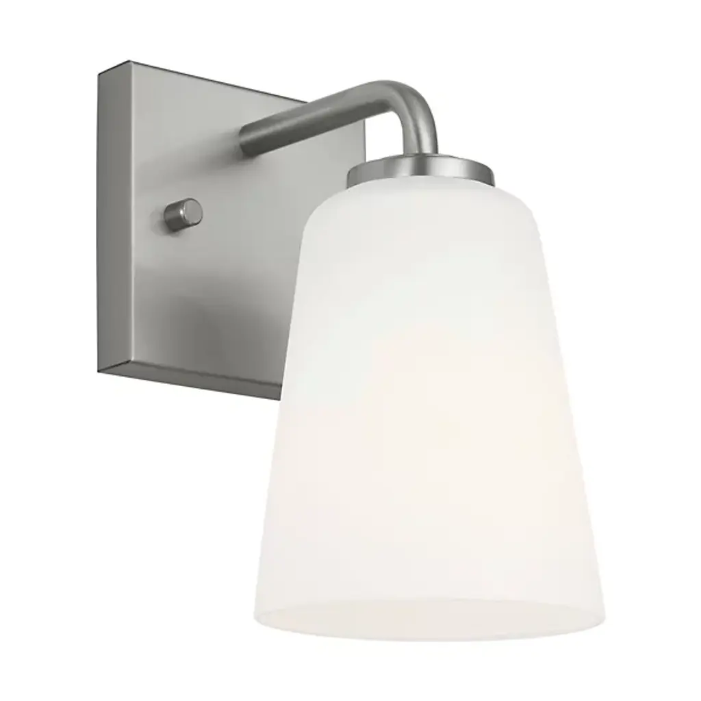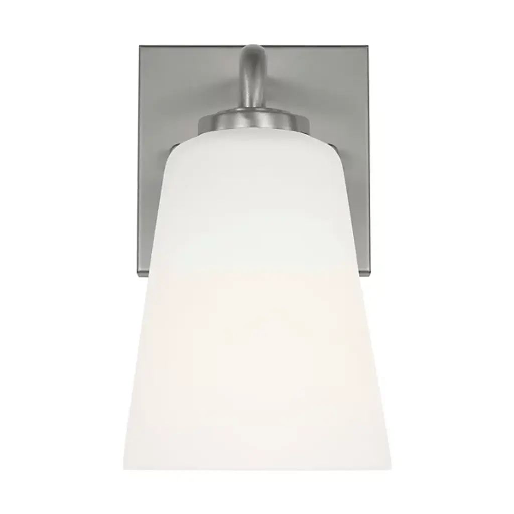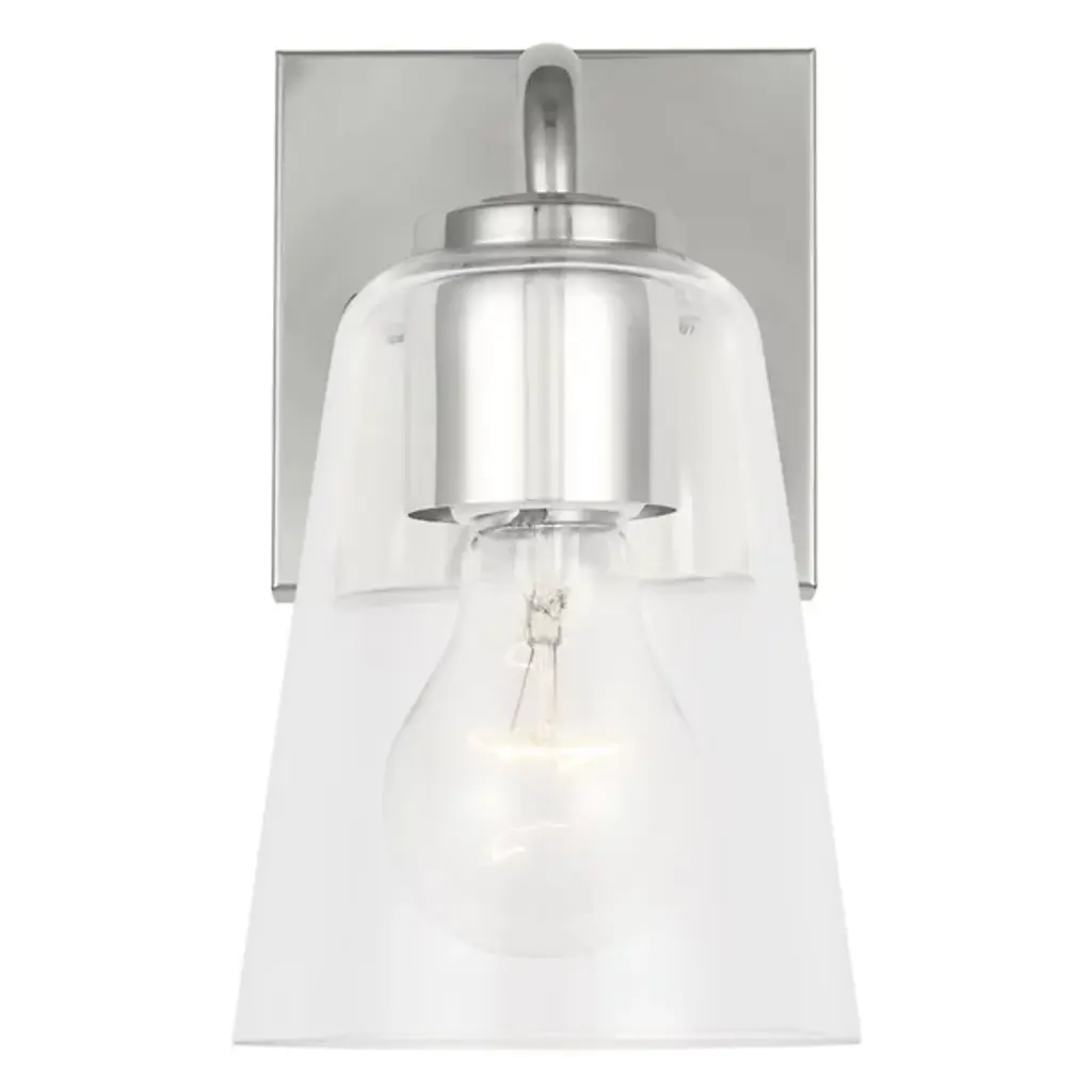 The Miles Bath Sconce from Generation Lighting employs a tapered glass shade that creates controlled light diffusion while maintaining the collection's bell-like profile. The shade can be oriented upward or downward to direct illumination where needed for task or ambient lighting. This single-light configuration maintains the classic proportions that define the collection, with its gentle taper from a wide opening to a narrow base. Clear bulbs work well with this fixture, complementing the shade's clean geometry and supporting dimming functionality.