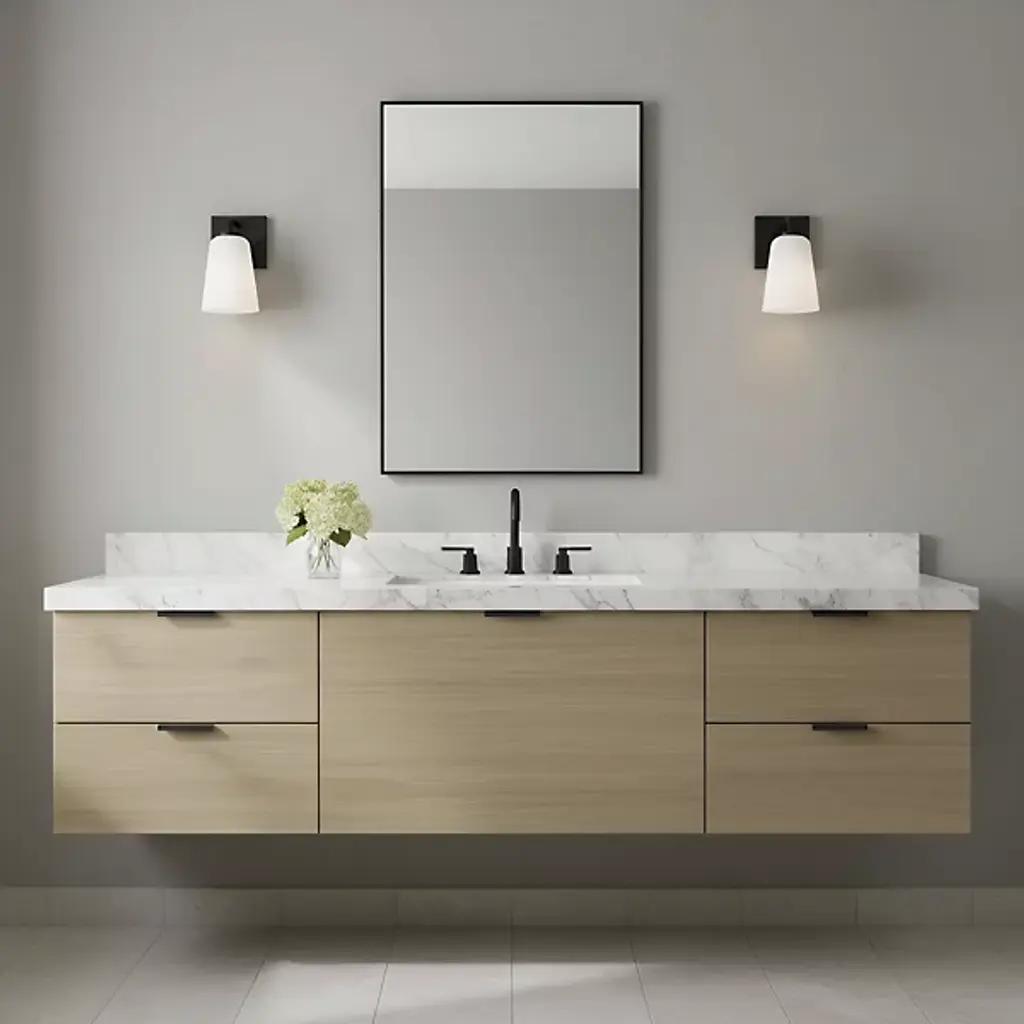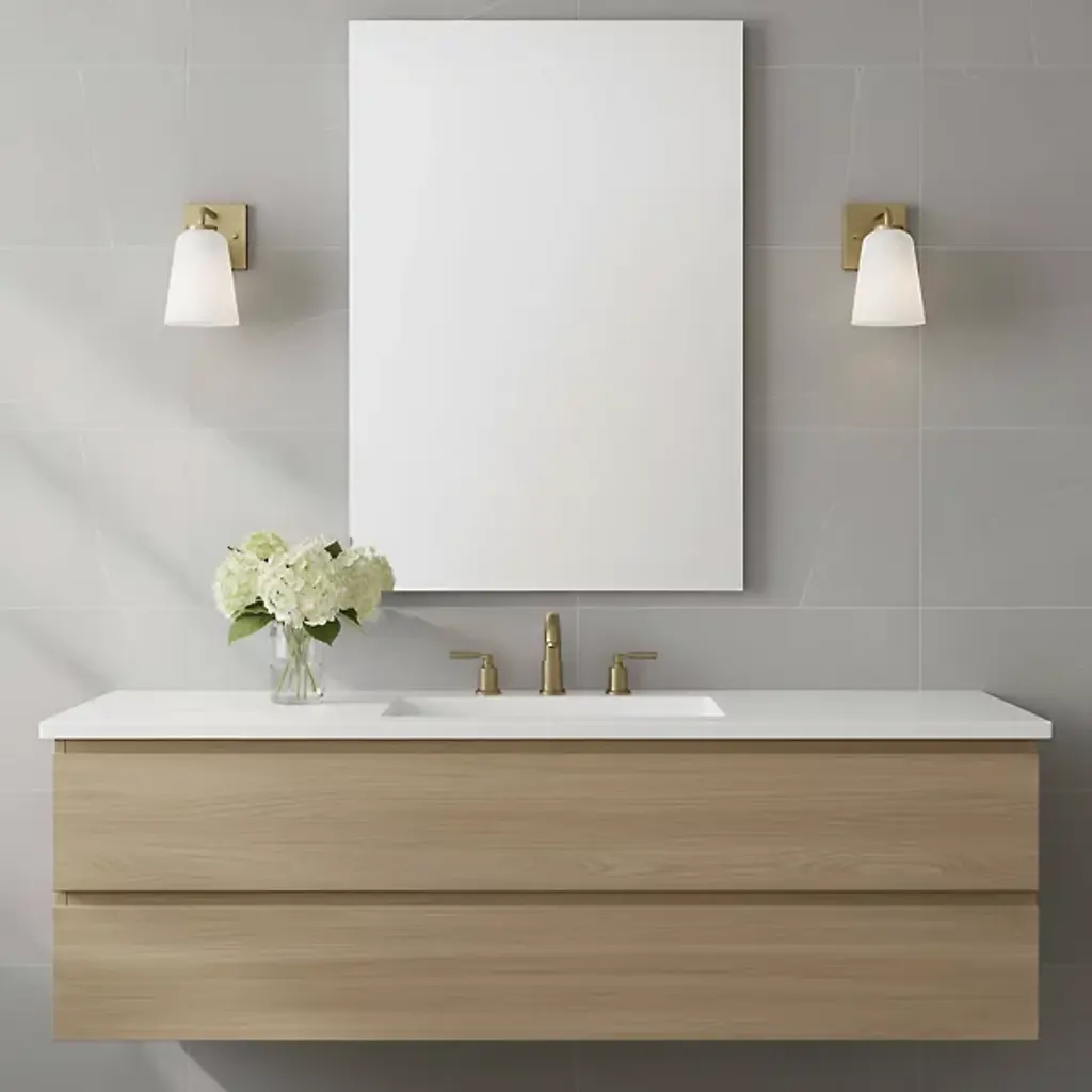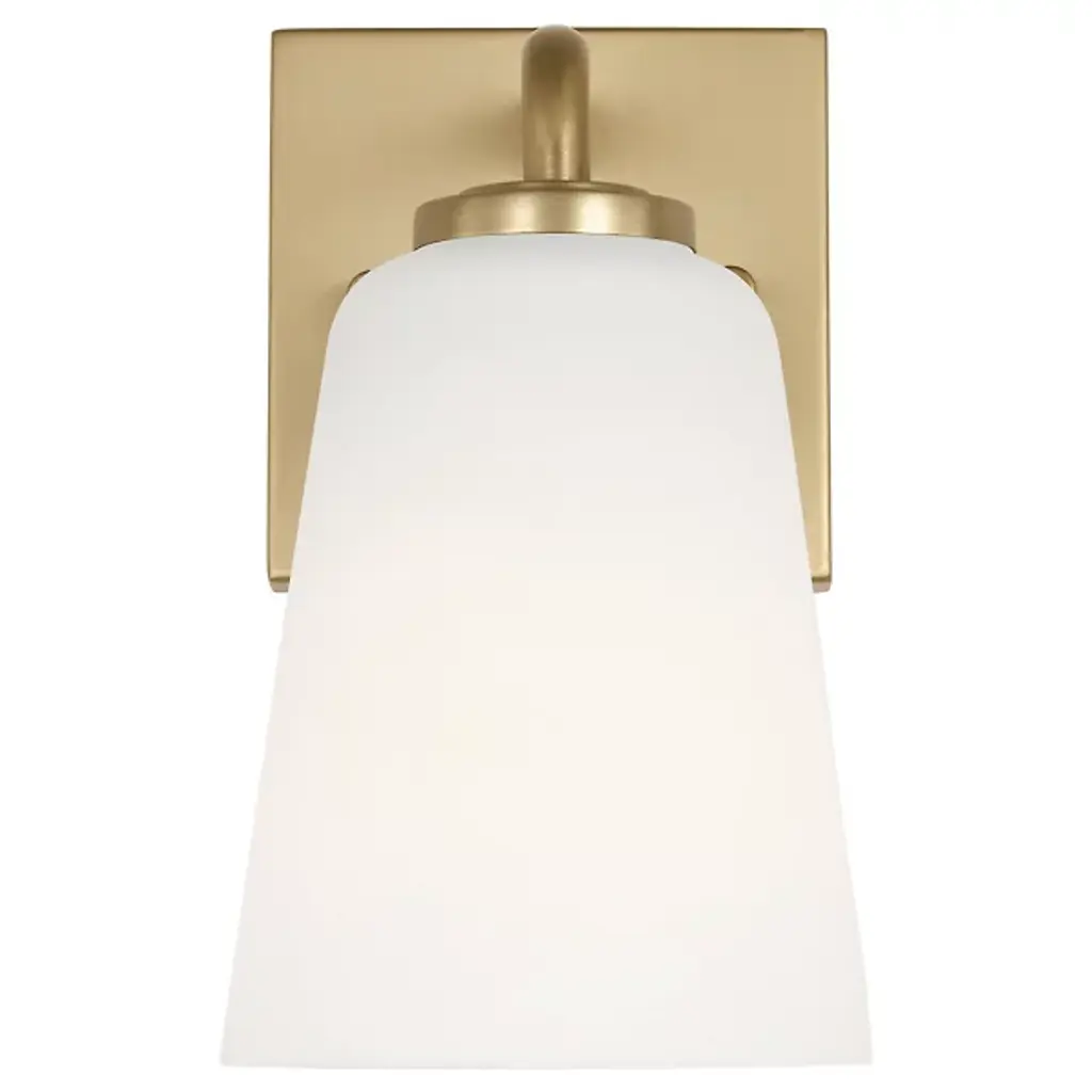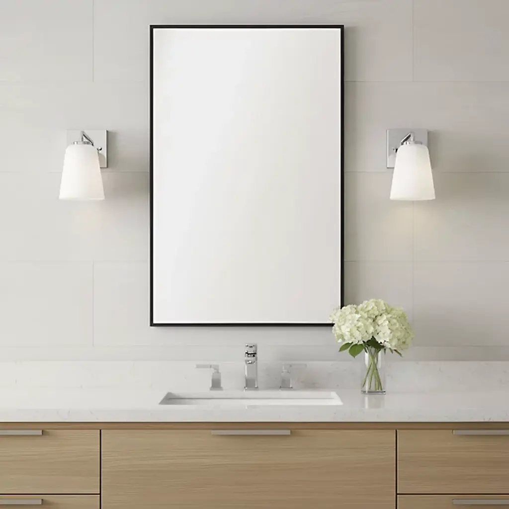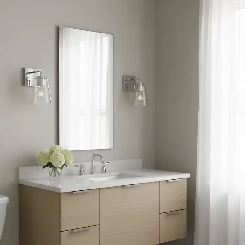The Miles Bath Sconce from Generation Lighting employs a tapered glass shade that creates controlled light diffusion while maintaining the collection's bell-like profile. The shade can be oriented upward or downward to direct illumination where needed for task or ambient lighting. This single-light configuration maintains the classic proportions that define the collection, with its gentle taper from a wide opening to a narrow base. Clear bulbs work well with this fixture, complementing the shade's clean geometry and supporting dimming functionality.