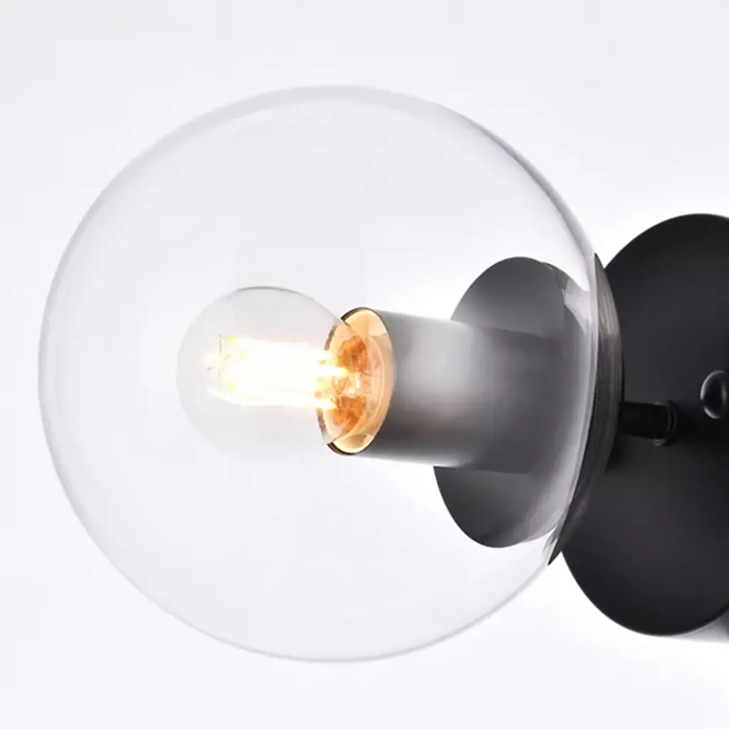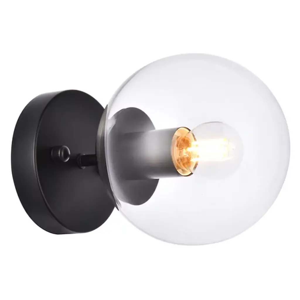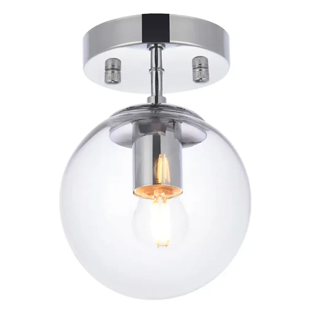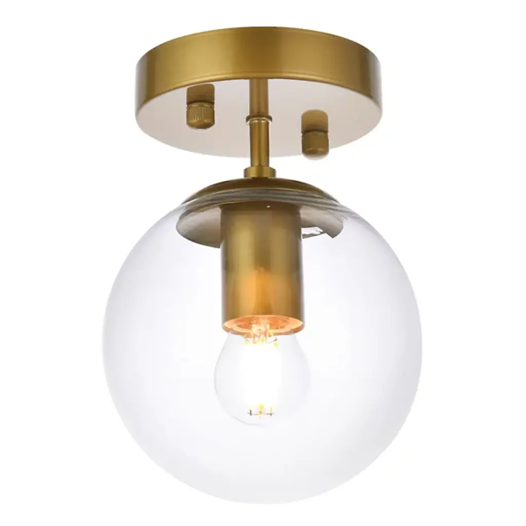 Introducing the Milio Flushmount/Wall Sconce from Huxe, a memorable modern lighting fixture designed to elevate your indoor ambiance. The fixture features a clear glass sphere shade, exuding a contemporary aesthetic. Supported by a disc wall mount and a short, slender stem leading to the lamping, this sconce offers a layered illumination effect that adds depth to your space. Crafted from durable metal with a glass sphere shade, this fixture seamlessly blends elements of Mid-Century Modern style, enhancing the overall aesthetic of your bathroom with its timeless charm and functionality.