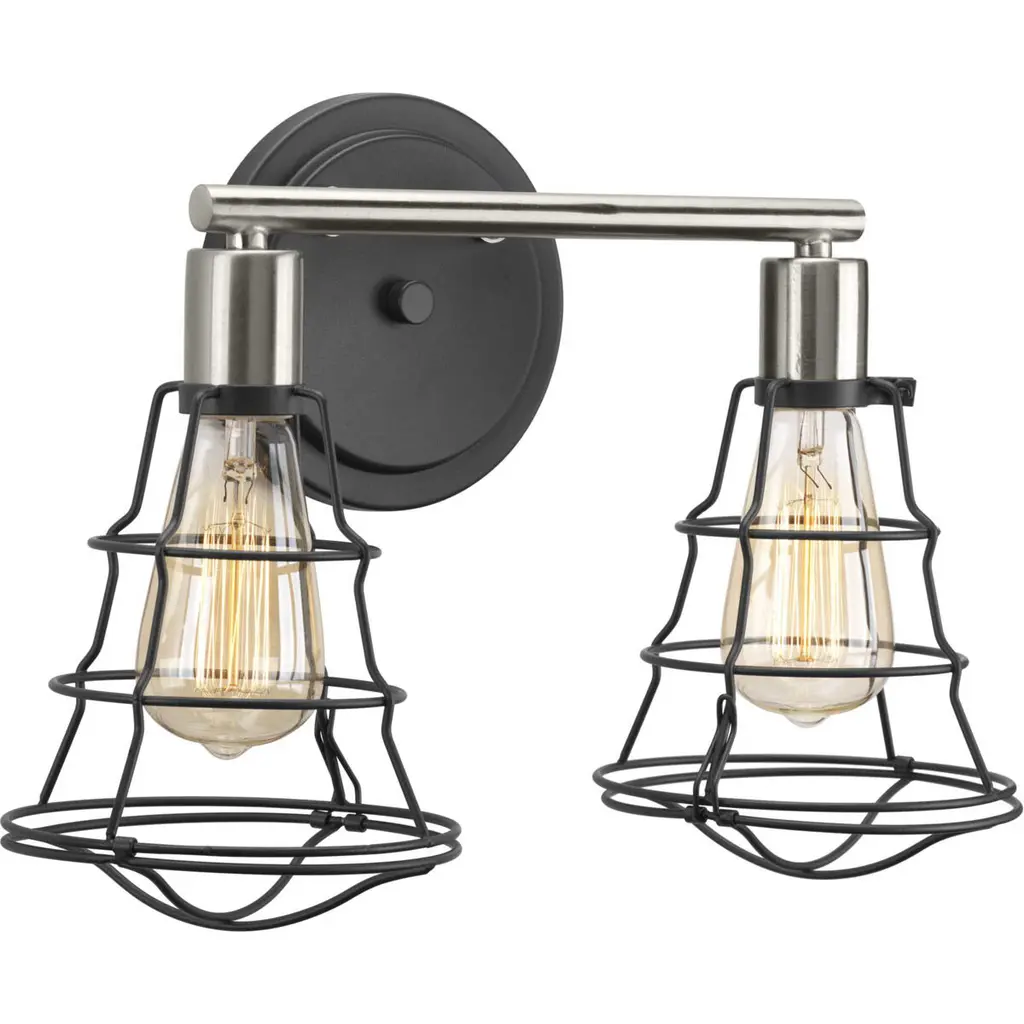 Finish Color: Brushed Nickel, Width: 15.25", Height: 10.5", Depth: 6.5", Backplate Width: 5.5", Backplate Length: 5.5", Lamping Type: Incandescent, Number Of Bulbs: 2, Wattage: 100 Watts, Moisture Rating: Damp Rated, Desc: We all harbor a little vanity, and just the right selection of vanity light is certain to satisfy. It�s an opportunity to make a bold design statement while bathing you in the perfect light. Place this fixture directly above the mirror and sink to add the perfect lighting to your bathroom. / Constructed from metal / 1 Year limited manufacturer's warranty / This fixture must be hardwired / Rated for damp location / Compatible with standard wall dimmer / Professional installation recommended.. ,