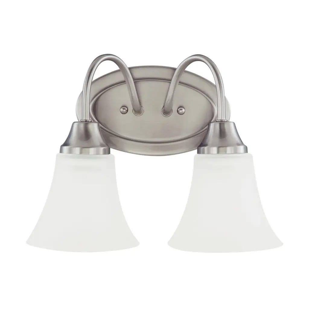 Finish Color: Satin Nickel, Width: 9", Height: 15", Depth: 7.5", Number Of Bulbs: 2, Wattage: 100 Watts, Moisture Rating: Damp Rated, Desc: We all harbor a little vanity, and just the right selection of vanity light is certain to satisfy. It's an opportunity to make a bold design statement while bathing you in the perfect light. Light bulbs are not included. Place this fixture directly above the mirror and sink to add the perfect lighting to your bathroom. Compatible with standard wall dimmer 1 year limited manufacture's warranty This item is UL listed This item is cUL listed This item is rated for damp location. Professional installation recommended. 1 Year LimitedShade Included: Yes. ,