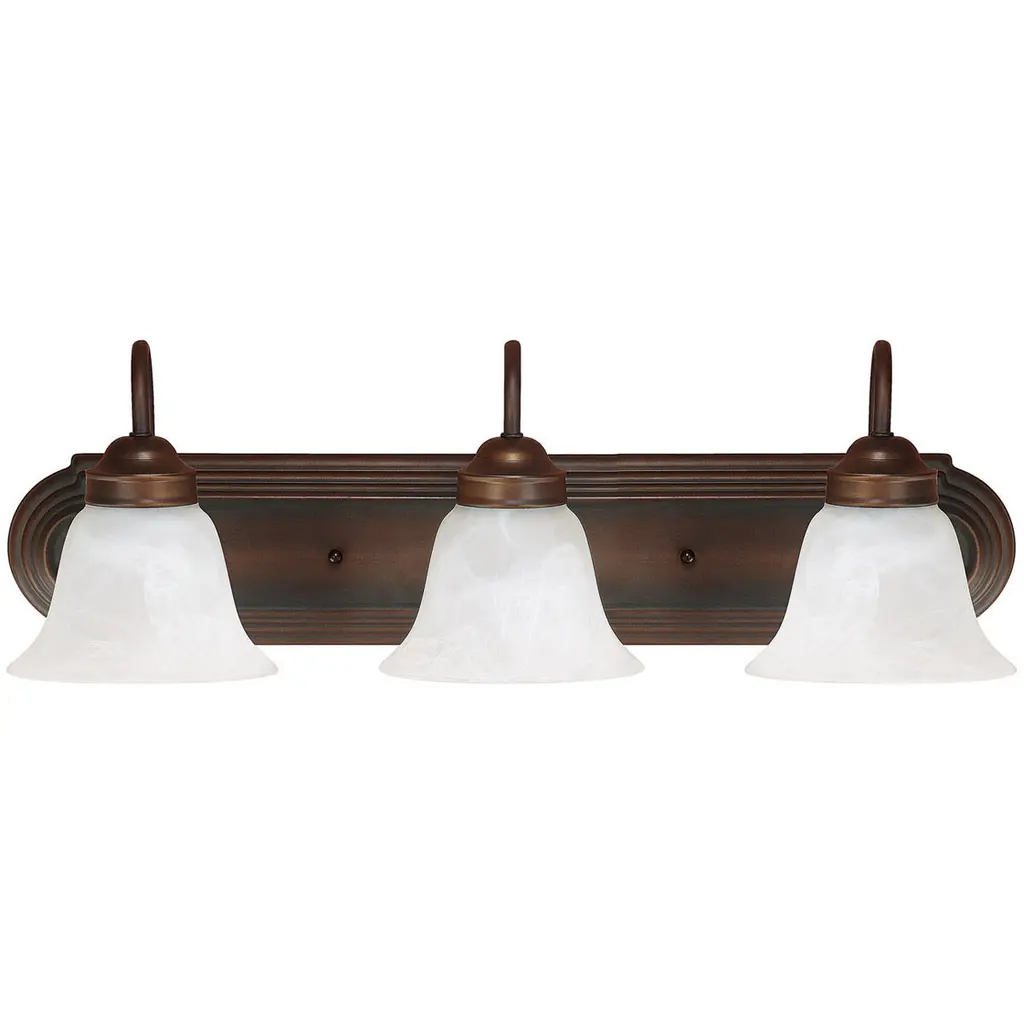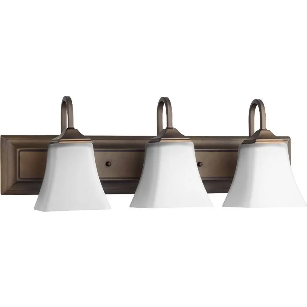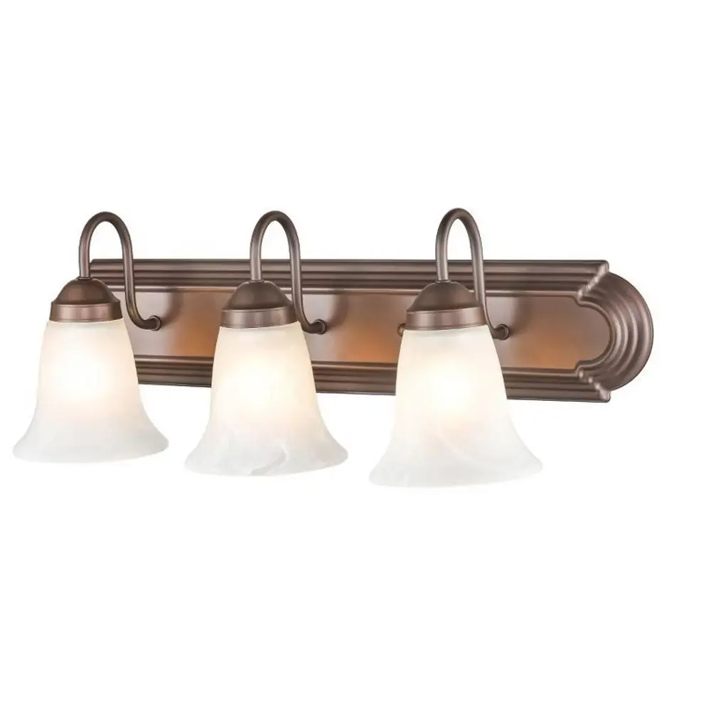 Finish Color: Bronze, Width: 24", Height: 8.5", Depth: 7", Number Of Bulbs: 3, Wattage: 100 Watts, Moisture Rating: Damp Rated, Desc: We all harbor a little vanity, and just the right selection of vanity light is certain to satisfy. Its an opportunity to make a bold design statement while bathing you in the perfect light. Light bulbs are not included. Place this fixture directly above the mirror and sink to add the perfect lighting to your bathroom. Compatible with standard wall dimmerWarranty: 1 Year LimitedShade Included: Yes. ,