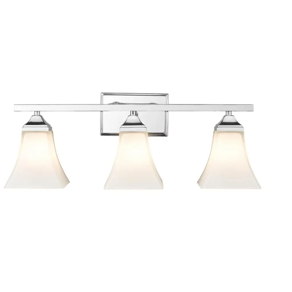 Finish Color: Chrome, Width: 23.25", Height: 9", Depth: 7.5", Backplate Width: 6.6", Backplate Length: 4.3", Number Of Bulbs: 3, Wattage: 100 Watts, Moisture Rating: Damp Rated, Desc: We all harbor a little vanity, and just the right selection of vanity light is certain to satisfy. Its an opportunity to make a bold design statement while bathing you in the perfect light. Light bulbs are not included. Place this fixture directly above the mirror and sink to add the perfect lighting to your bathroom. Compatible with standard wall dimmerWarranty: 1 Year LimitedShade Included: Yes. Back Plate Height: 4.30 / Back Plate Width: 6.60. ,