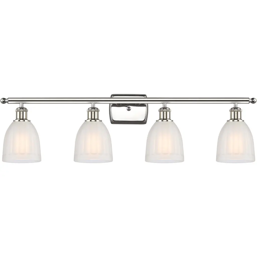 Finish Color: Brushed Nickel, Width: 31.5", Height: 9", Depth: 7.5", Backplate Width: 6.6", Backplate Length: 4.3", Number Of Bulbs: 4, Wattage: 100 Watts, Moisture Rating: Damp Rated, Desc: We all harbor a little vanity, and just the right selection of vanity light is certain to satisfy. Its an opportunity to make a bold design statement while bathing you in the perfect light. Light bulbs are not included. Place this fixture directly above the mirror and sink to add the perfect lighting to your bathroom. Compatible with standard wall dimmerWarranty: 1 Year LimitedShade Included: Yes. Back Plate Height: 4.30 / Back Plate Width: 6.60. ,