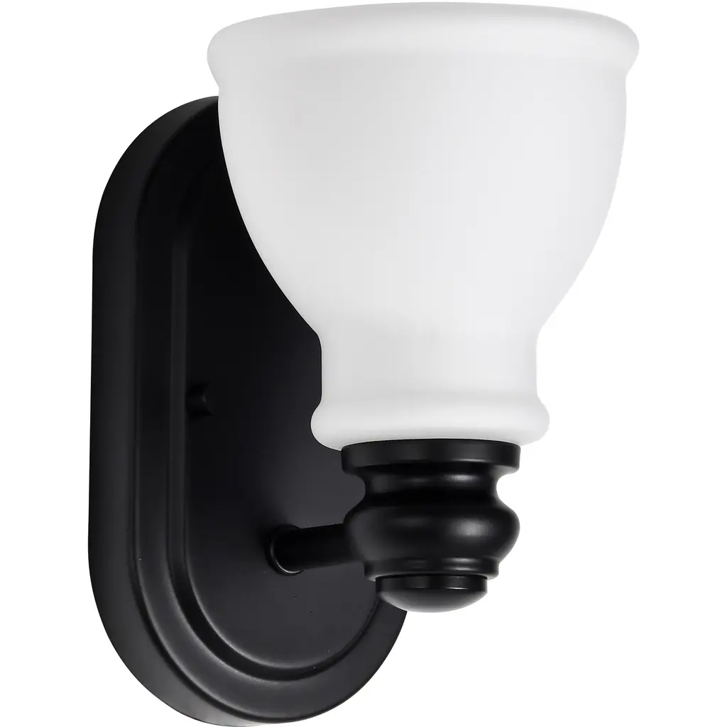 Collection: Amberle, Finish Color: Matte Black, Width: 5", Height: 9.88", Depth: 1.14", Backplate Width: 4.93", Backplate Length: 7.33", Lamping Type: Incandescent, Number Of Bulbs: 1, Wattage: 60 Watts, Moisture Rating: Damp Rated, Desc: We all harbor a little vanity, and just the right selection of vanity light is certain to satisfy. It�s an opportunity to make a bold design statement while bathing you in the perfect light. Light bulbs are not included. Place this fixture to the side of your mirror to add the perfect lighting to your bathroom. Compatible with standard wall dimmer 1 Year limited manufacturer's warranty This item is UL listed Meets CSA standards This item is rated for damp location. Professional installation recommended.,