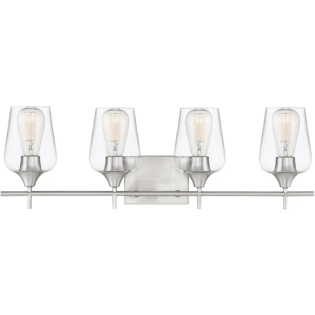 Collection: Ashford, Finish Color: Chrome, Width: 31", Height: 10.25", Depth: 6", Backplate Width: 5", Backplate Length: 5", Number Of Bulbs: 4, Wattage: 100 Watts, Moisture Rating: Damp Rated, Desc: We all harbor a little vanity, and just the right selection of vanity light is certain to satisfy. Its an opportunity to make a bold design statement while bathing you in the perfect light. Light bulbs are not included. Place this fixture directly above the mirror and sink to add the perfect lighting to your bathroom. Compatible with standard wall dimmer 1 year limited manufacture's warranty This item is UL listed Meets CSA standards This item is rated for damp location. Professional installation recommended. 1 Year LimitedShade Included: Yes. Back Plate Height: 5.00 / Back Plate Width: 5.00. ,
