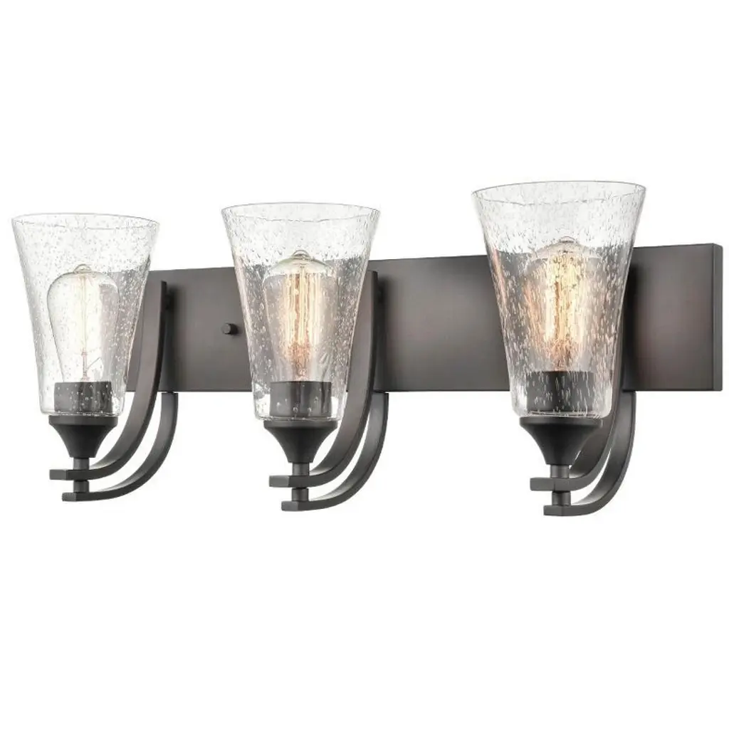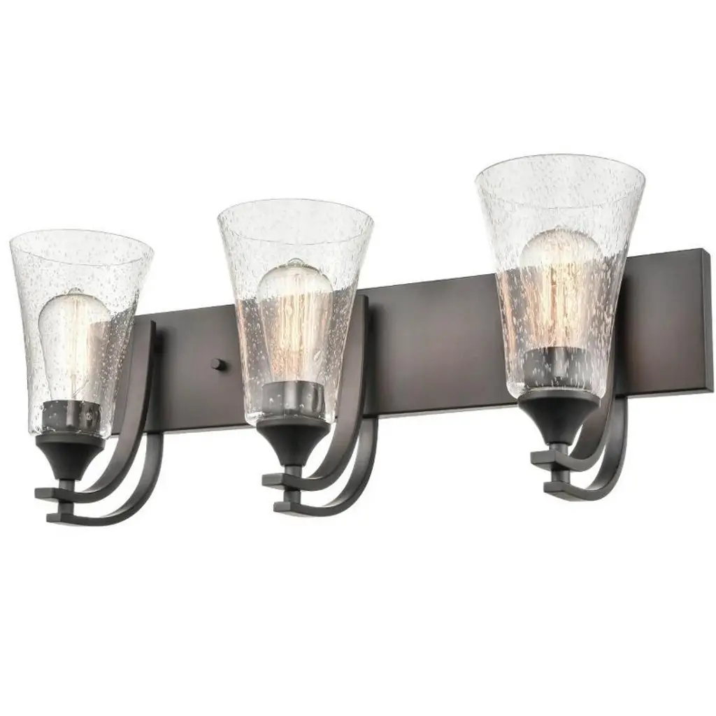 Collection: Natalie, Finish Color: Matte Black, Width: 24", Height: 10", Depth: 8.25", Backplate Width: 24", Backplate Length: 5", Number Of Bulbs: 3, Wattage: 100 Watts, Moisture Rating: Damp Rated, Desc: We all harbor a little vanity, and just the right selection of vanity light is certain to satisfy. Its an opportunity to make a bold design statement while bathing you in the perfect light. Light bulbs are not included. Place this fixture to the side of your mirror to add the perfect lighting to your bathroom. Compatible with standard wall dimmer 1 year limited manufacture's warranty This item is UL listed Meets CSA standards This item is rated for damp location. Professional installation recommended. Warranty: 1 Year LimitedShade Included: Yes. Back Plate Height: 5.00 / Back Plate Width: 24.00. ,