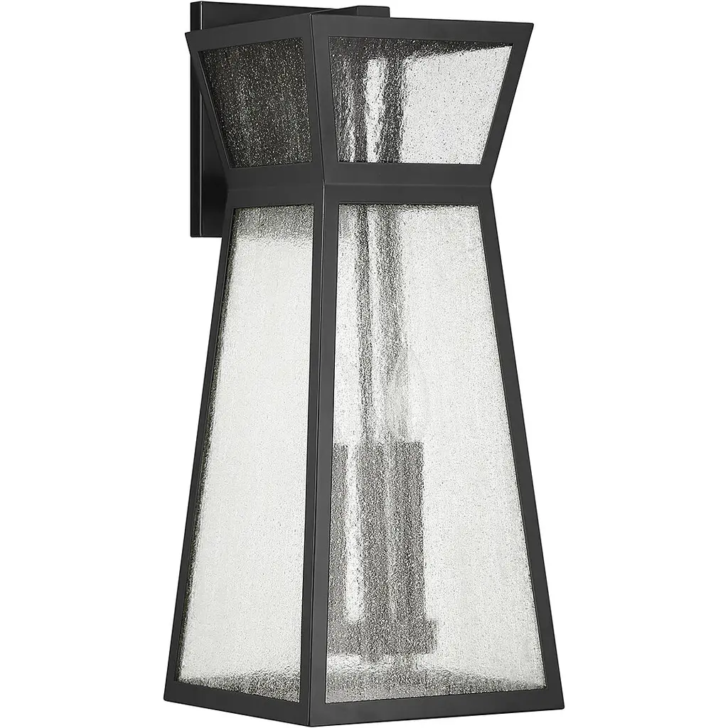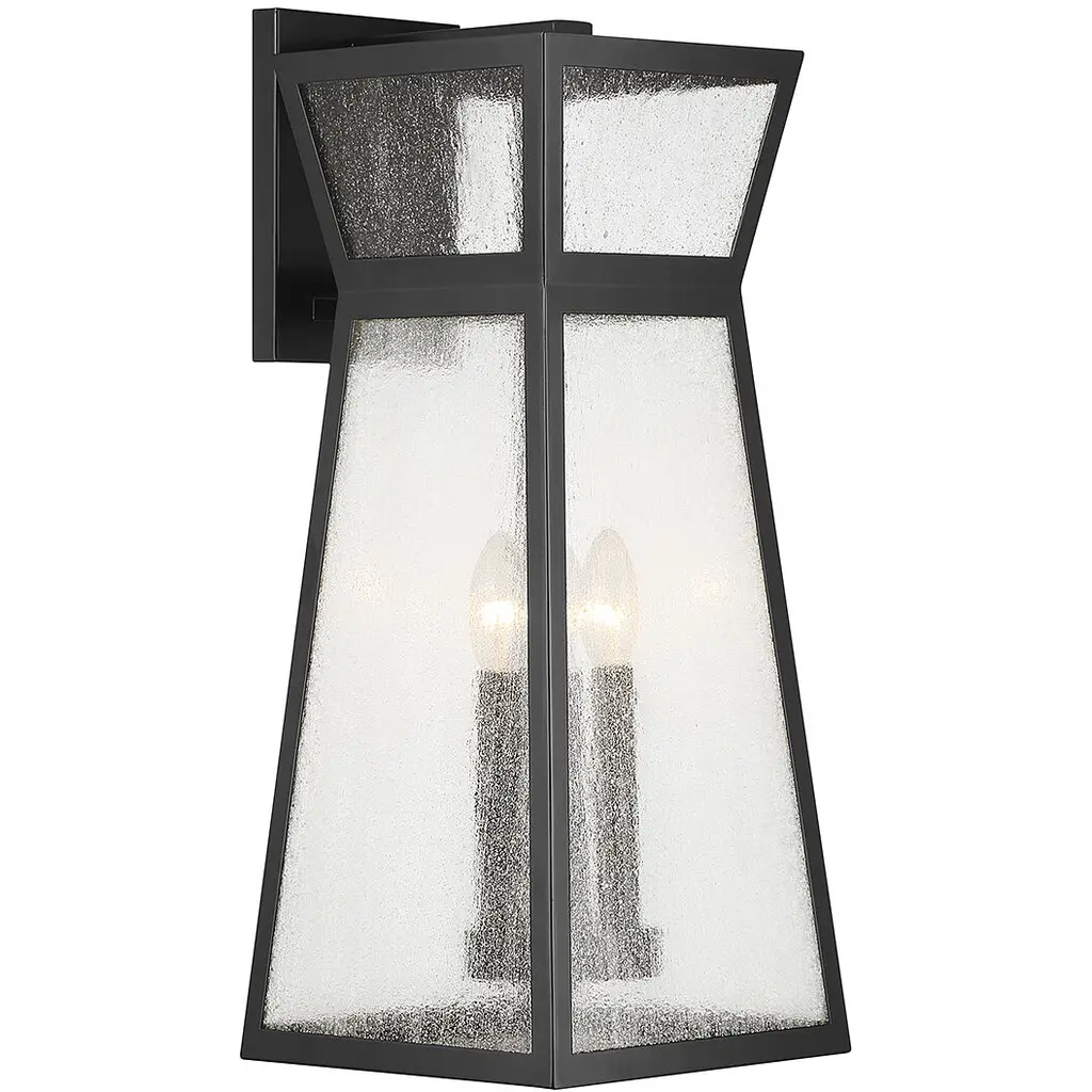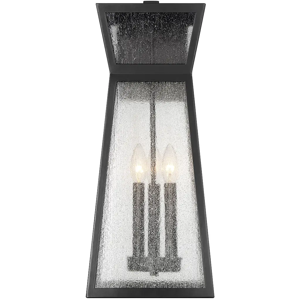 From Savoy House, the Millford 3-light outdoor wall light showcases a more contemporary take on classic lantern-style illumination with a sharply angular shape and panes of seedy glass. Matte black finish. Millford is 22" in height, 9" in width and extends 10.5" from the wall. It uses 3 candelabra size bulbs of up to 40 watts per bulb (bulbs not included).