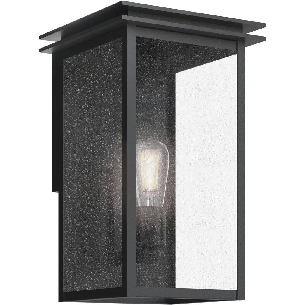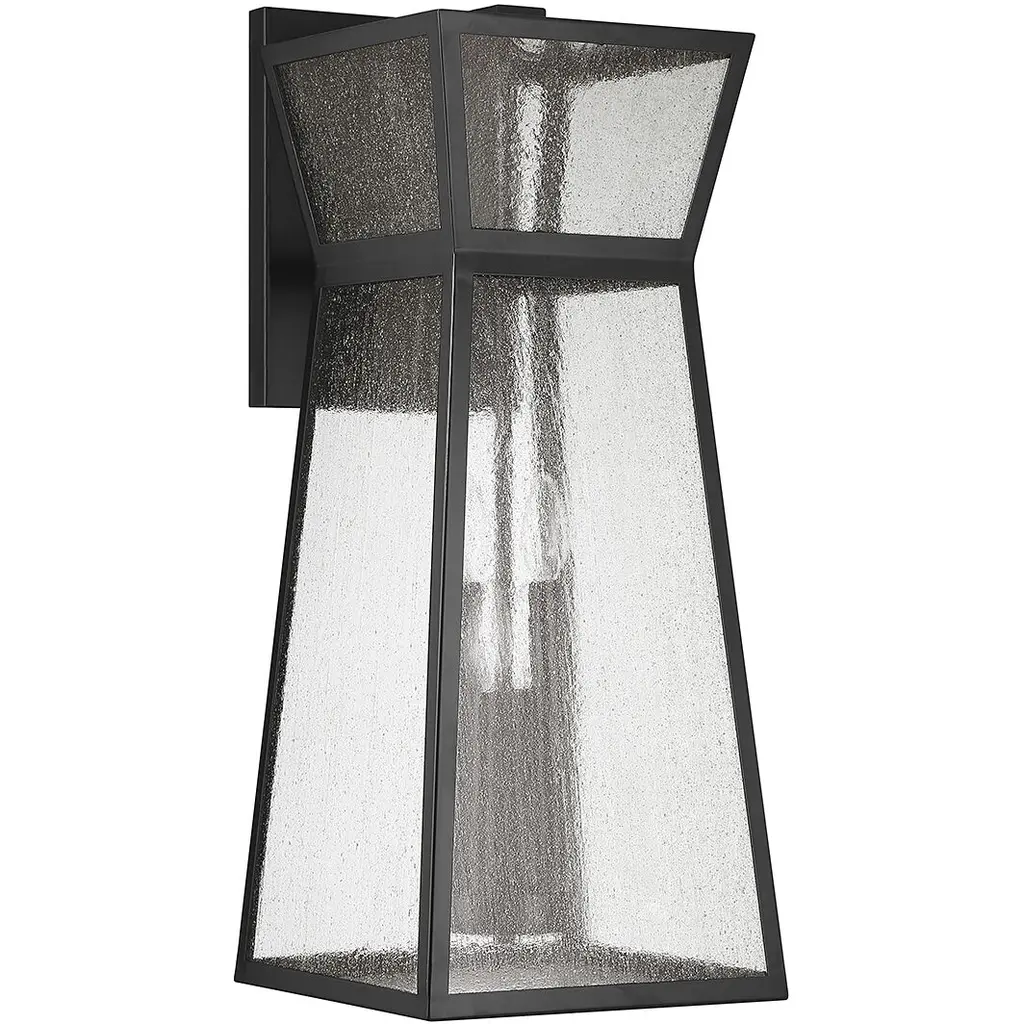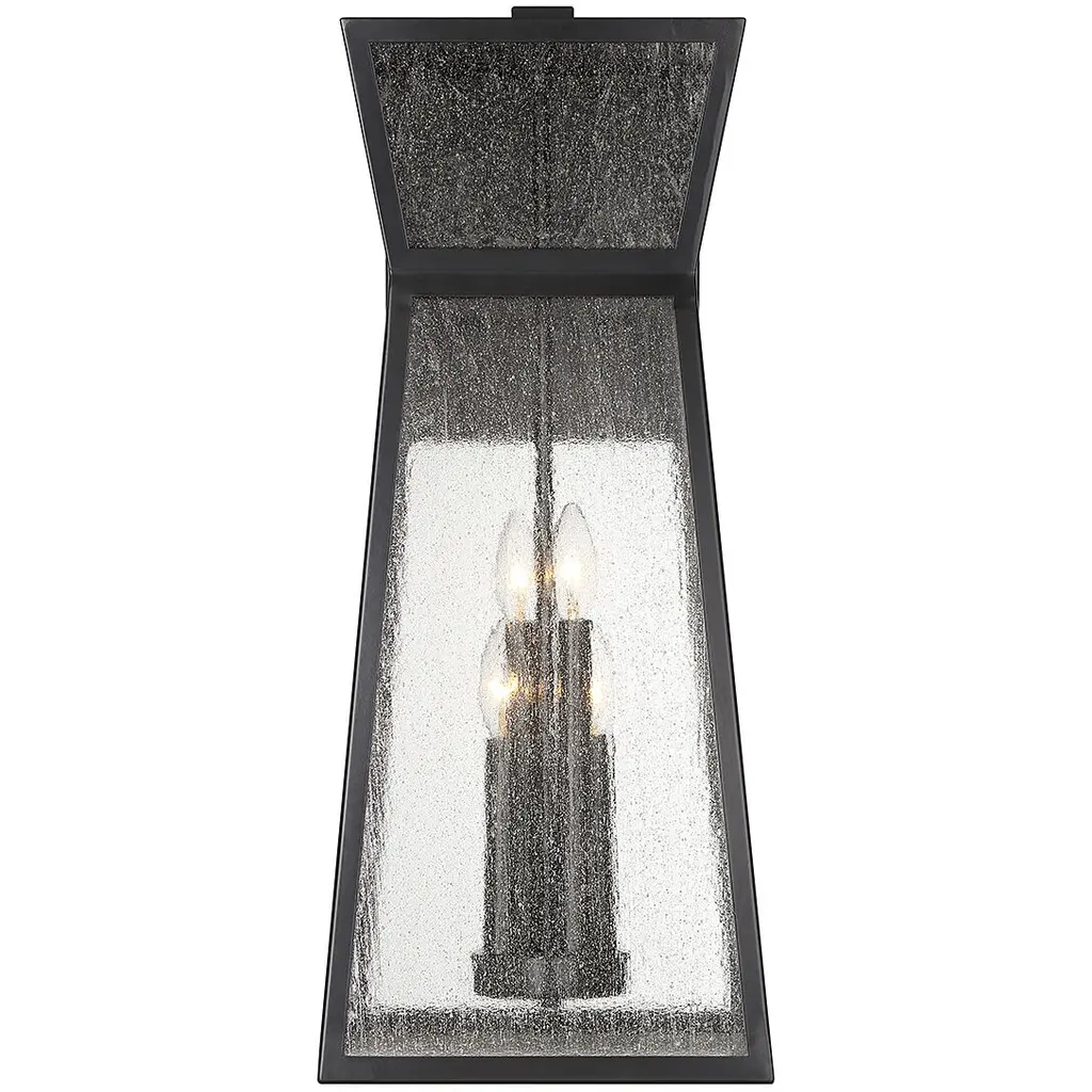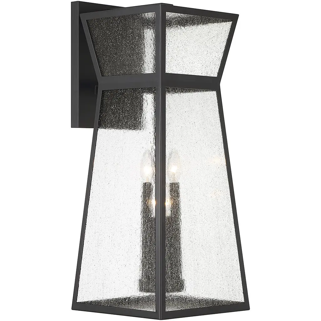 From Savoy House, the Millford 4-light outdoor wall light showcases a more contemporary take on classic lantern-style illumination with a sharply angular shape and panes of seedy glass. Matte black finish. Millford is 26.75" in height, 11" in width and extends 12.25" from the wall. It uses 4 candelabra size bulbs of up to 40 watts per bulb (bulbs not included).