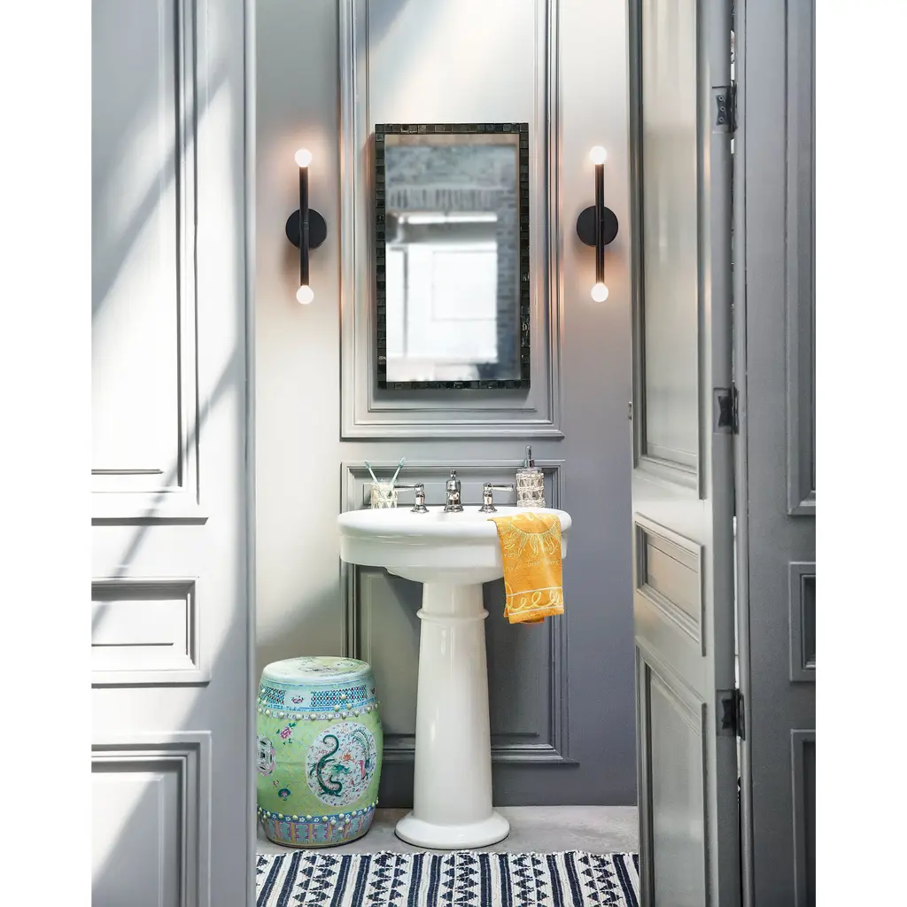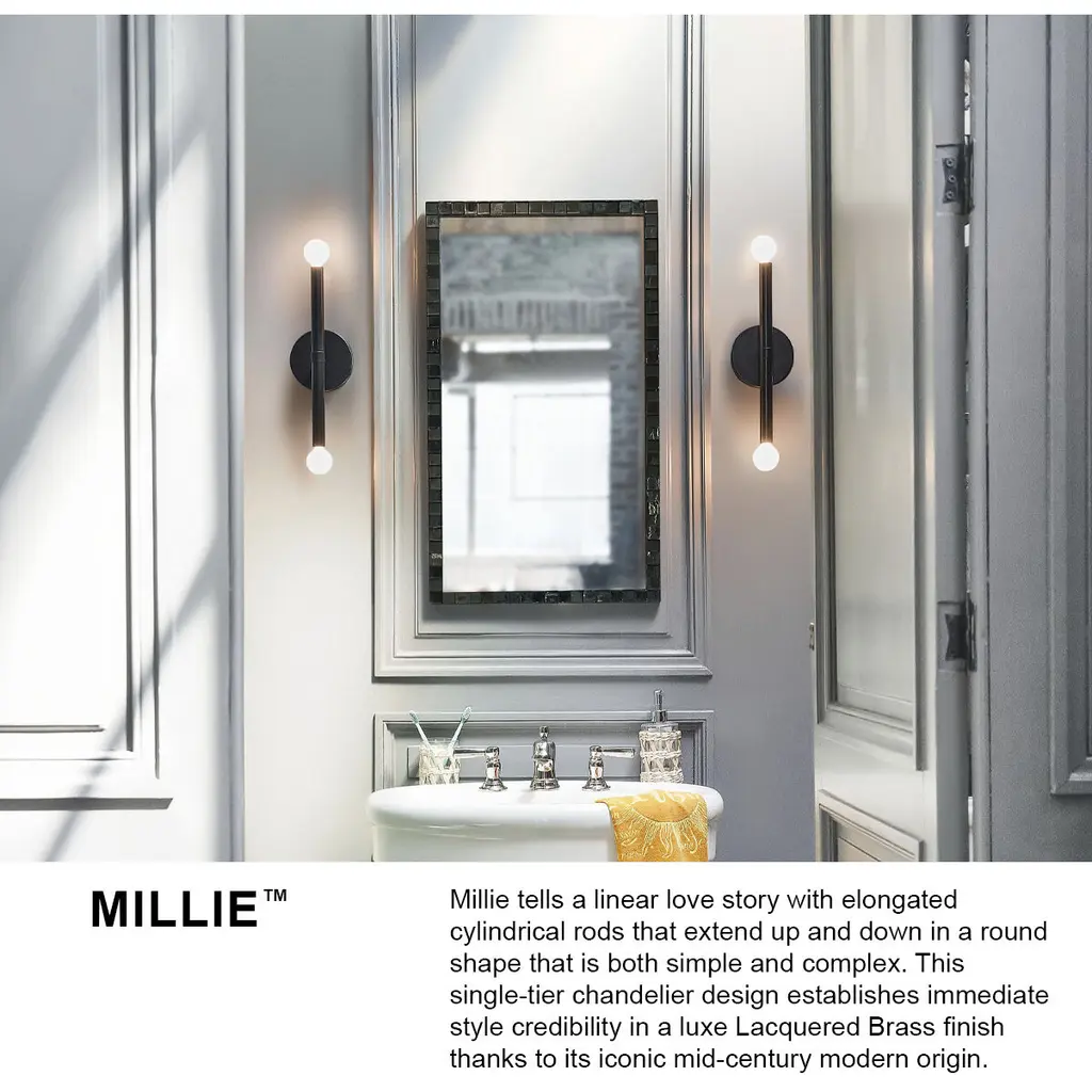 Millie tells a linear love story with elongated cylindrical rods extending outwards, creating a sleek statement that commands attention. This design establishes immediate style credibility thanks to its iconic mid-century modern origin, ensuring visual intrigue in either Black or Lacquered Brass finishes. To complement Millie’s chic style, we recommend G16.5 bulbs.